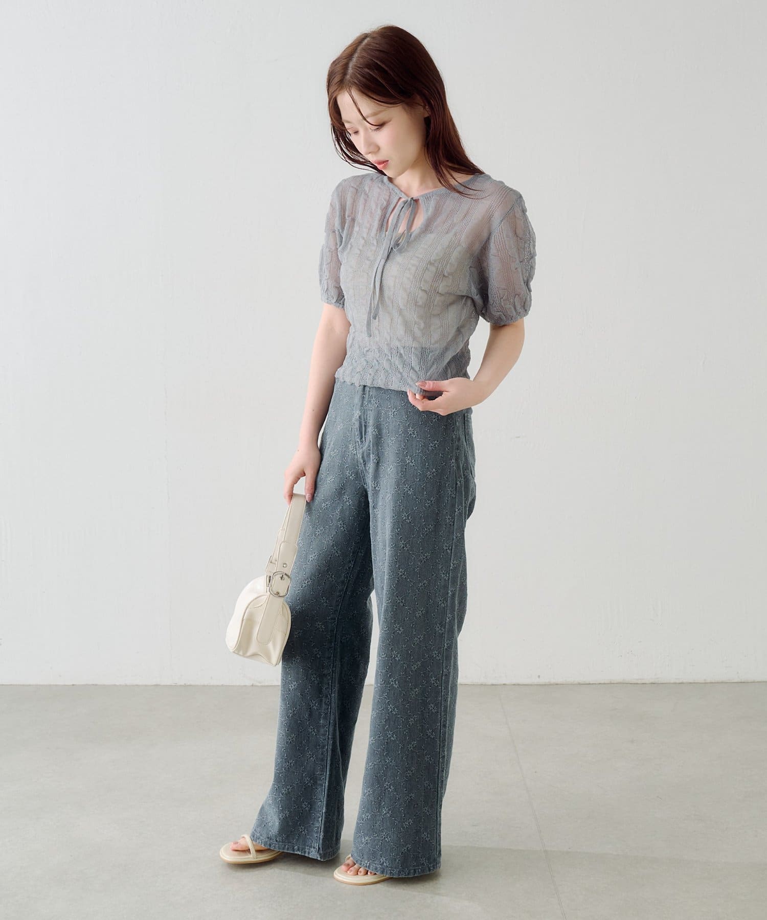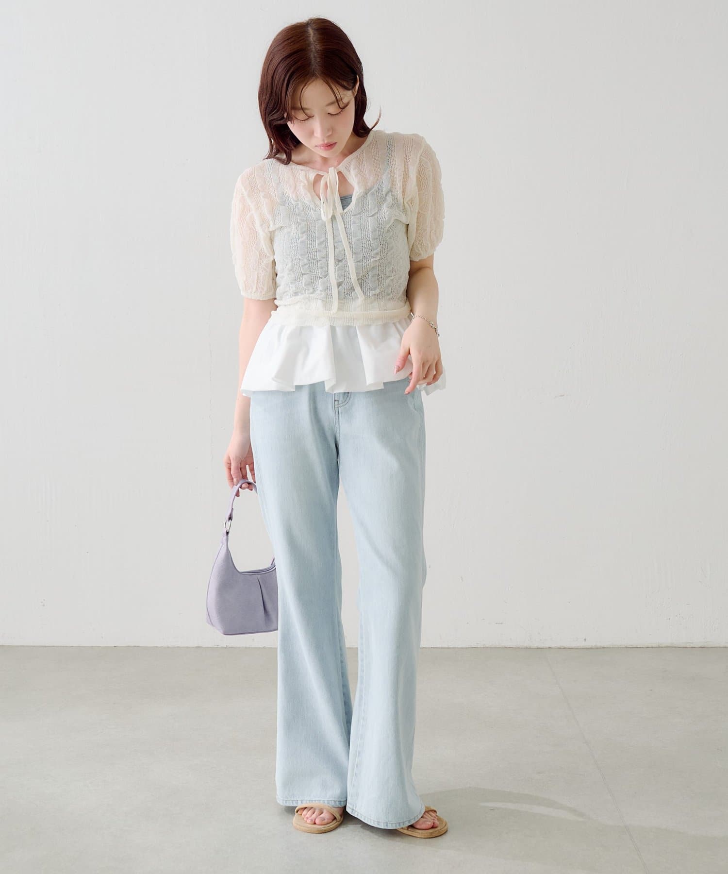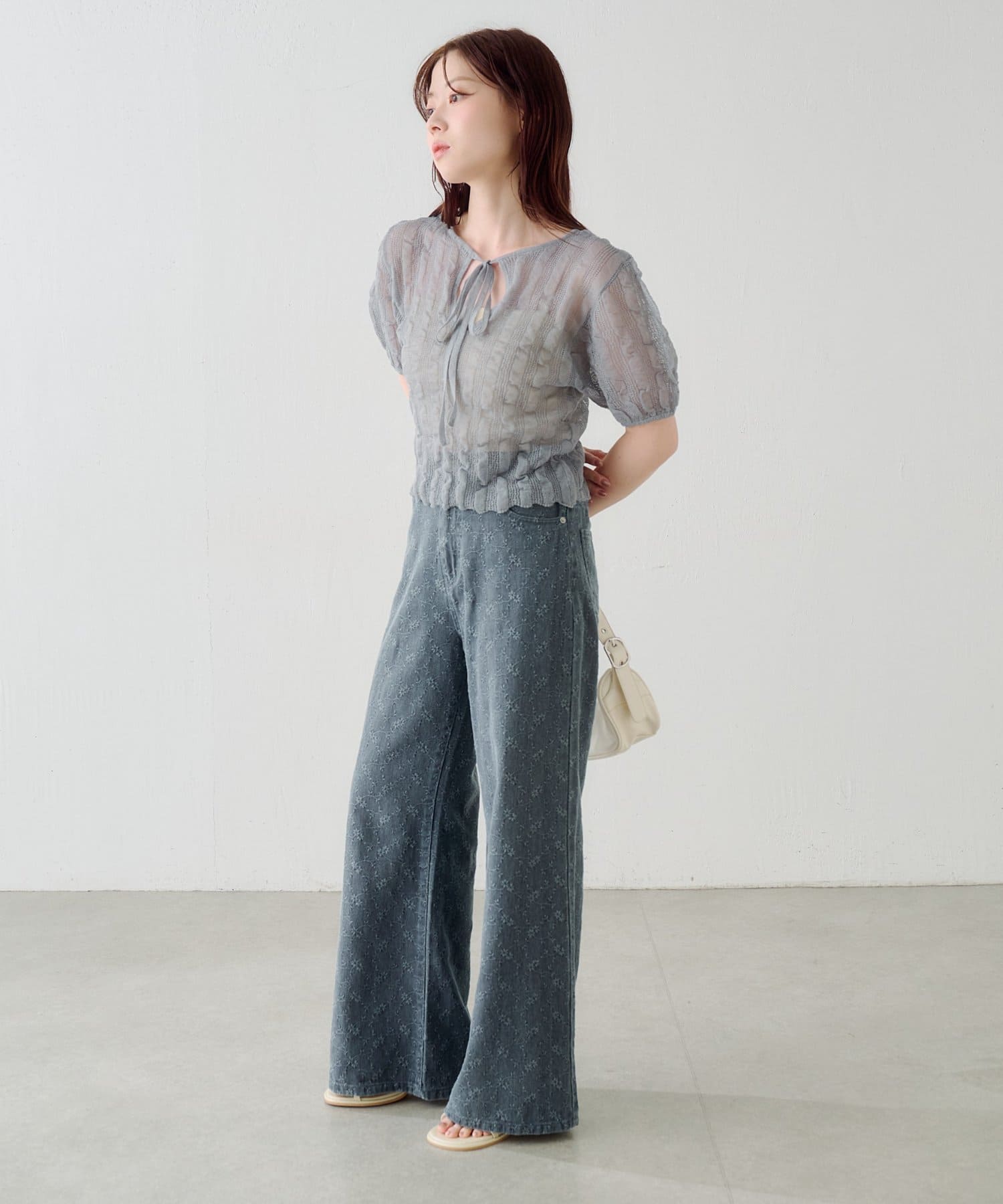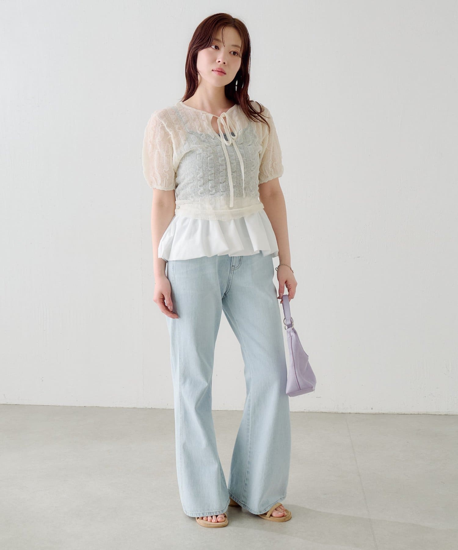 軽やかでやわらかなシアーニット素材を使用し、ほんのり透ける繊細な風合いが魅力です。