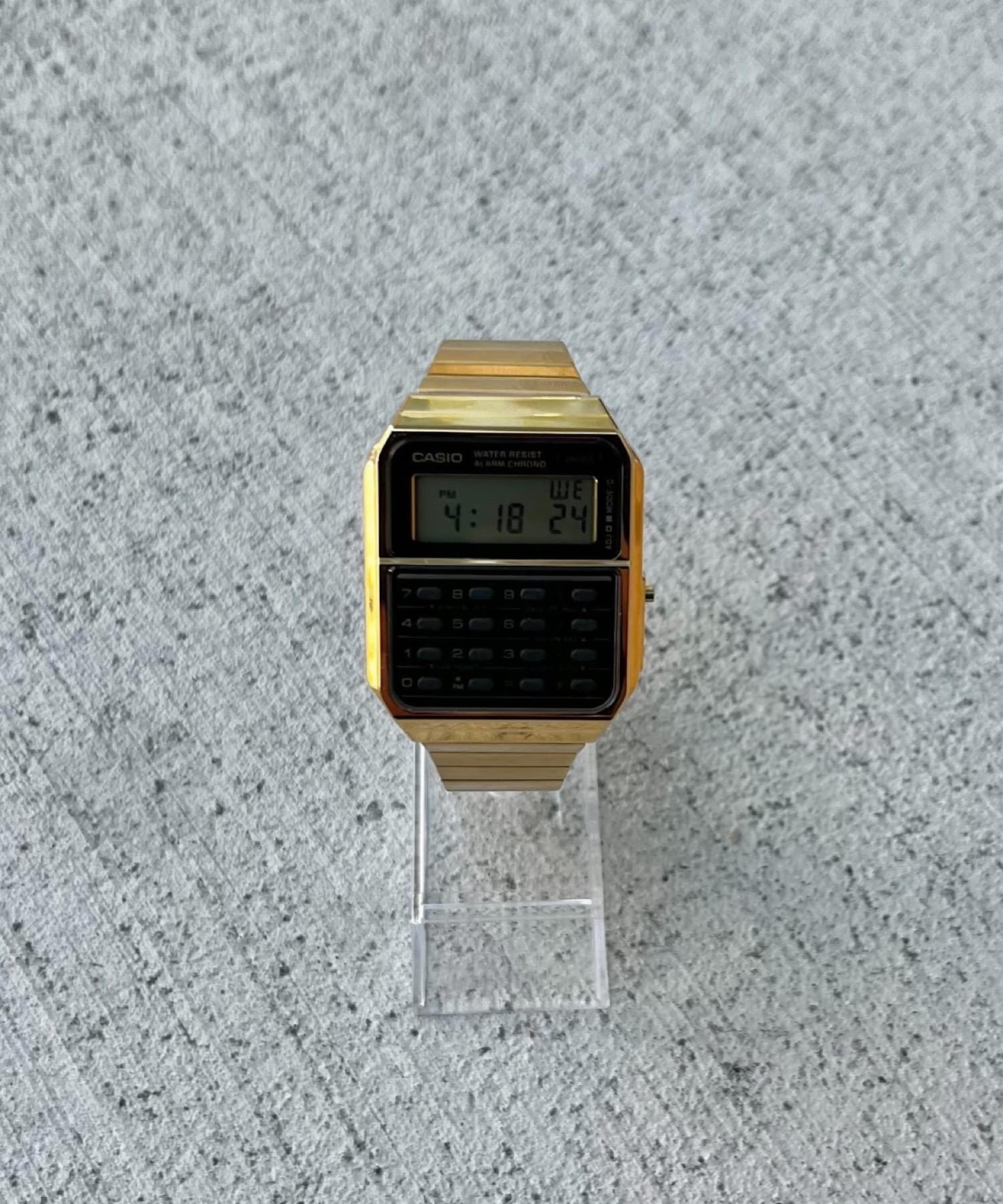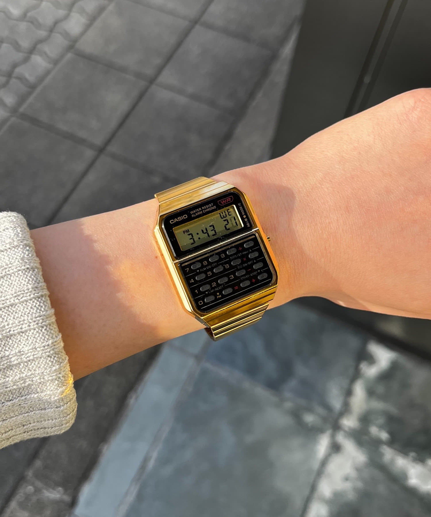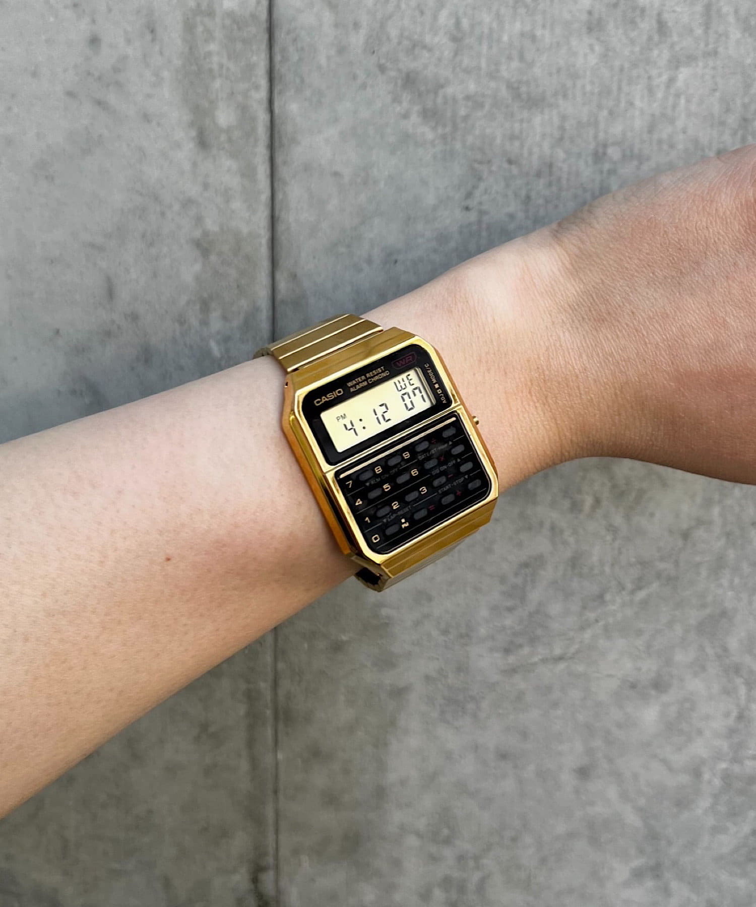 カシオのアイコニックな電卓デザインをモチーフにしたシリーズから、メタリックケースを採用したモデルです。