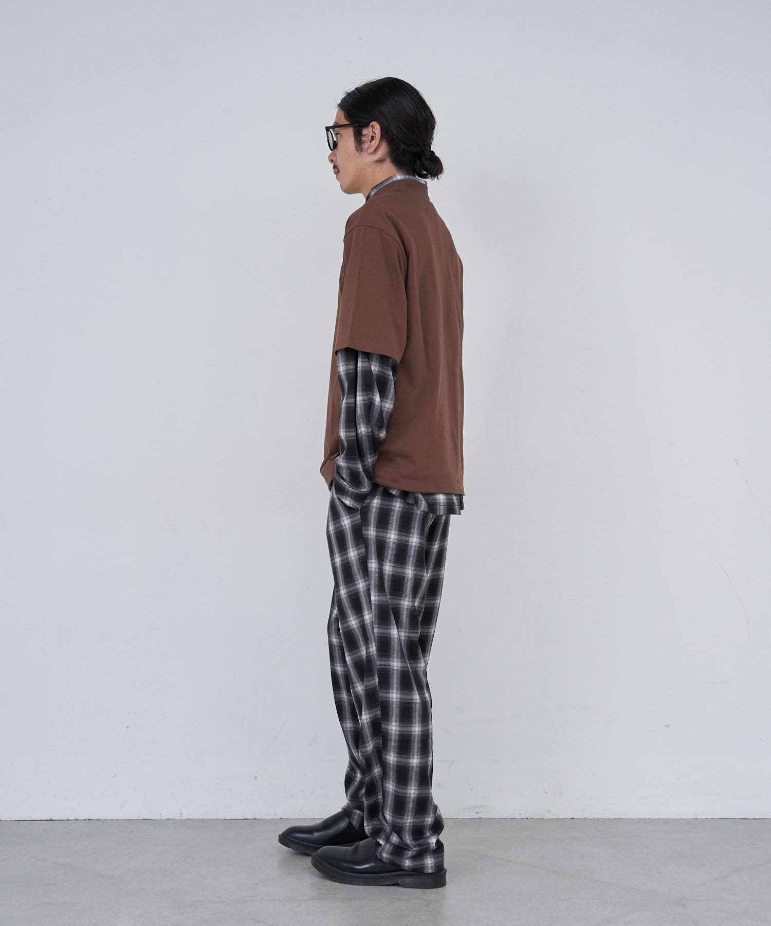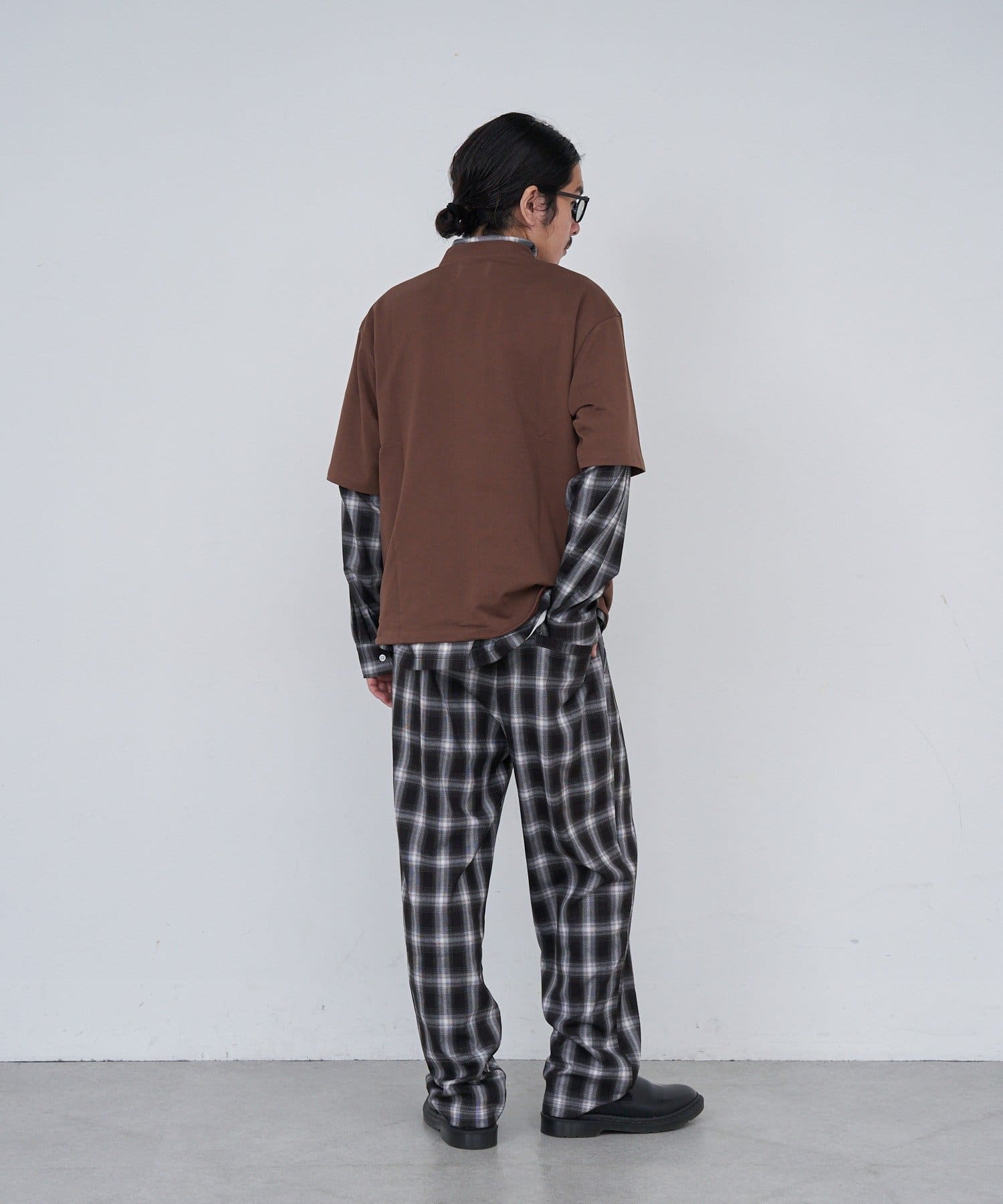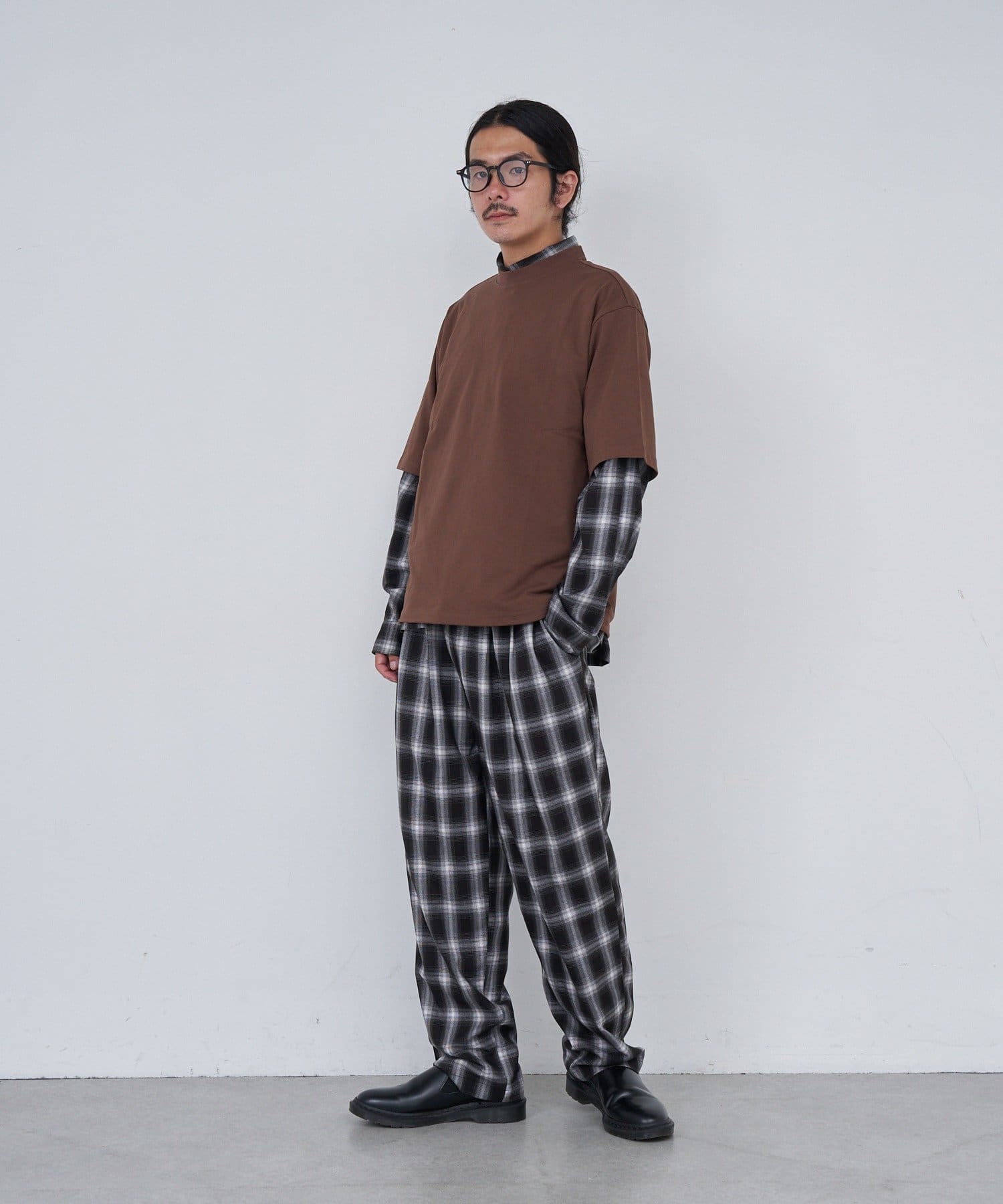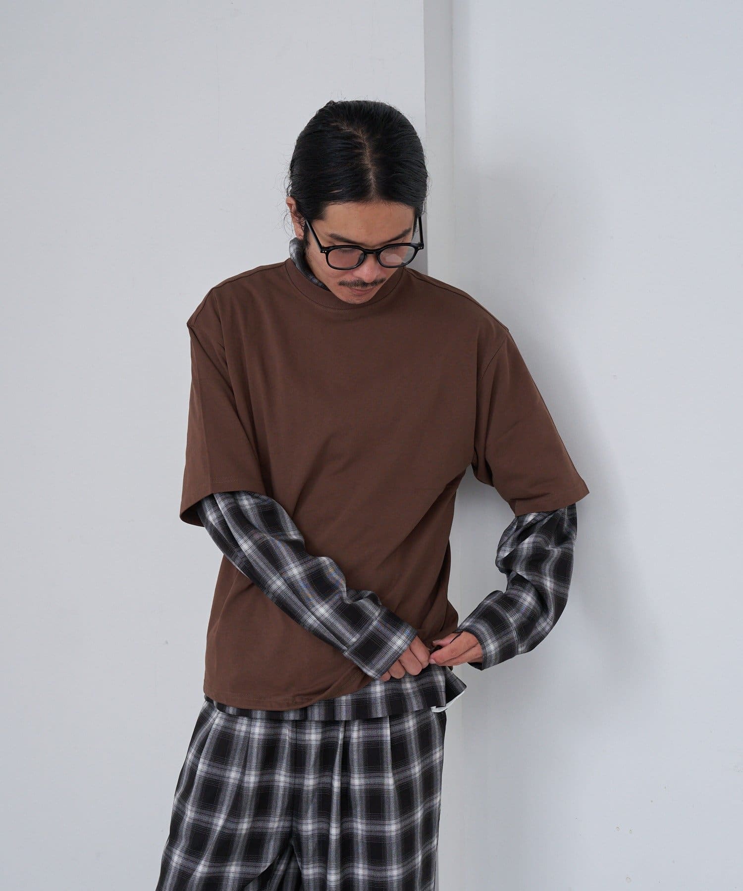 インナーにチェックシャツやロンTをレイヤードして裾から覗かせると、奥行きのあるスタイルに。