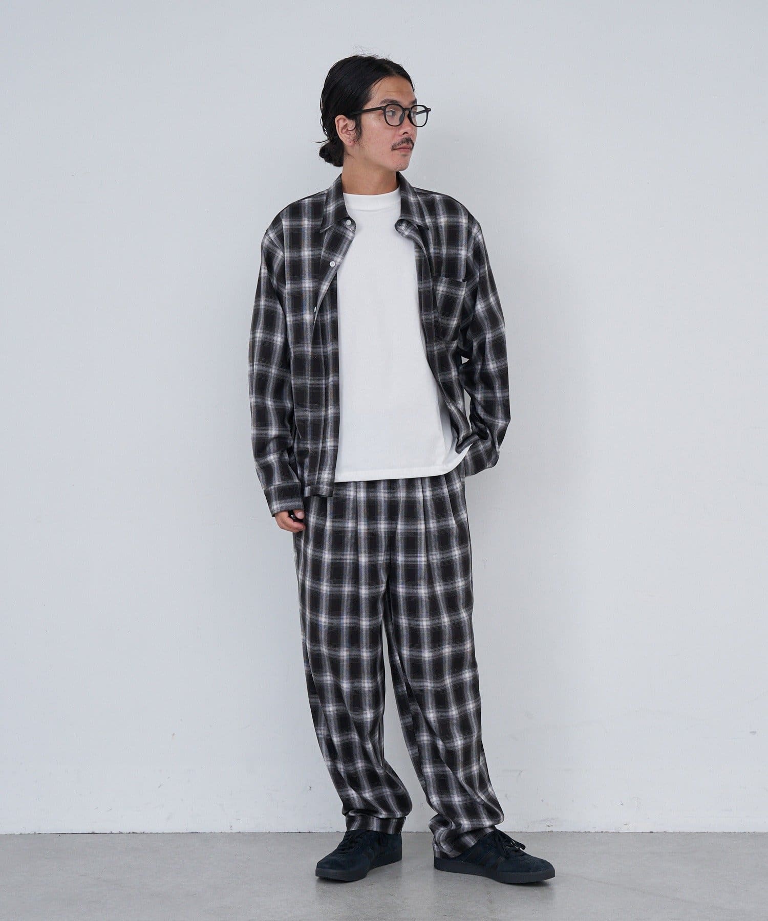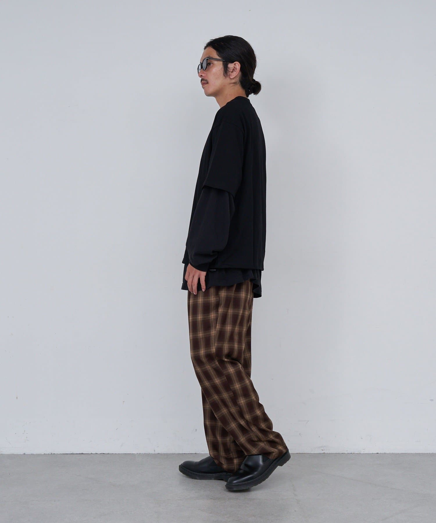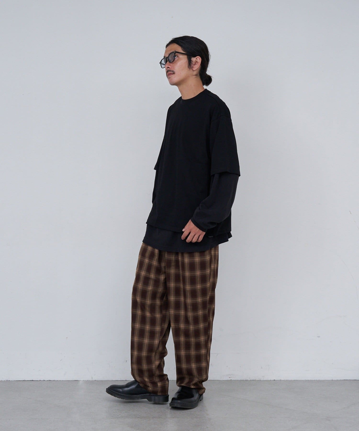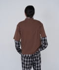 インナーにチェックシャツやロンTをレイヤードして裾から覗かせると、奥行きのあるスタイルに。