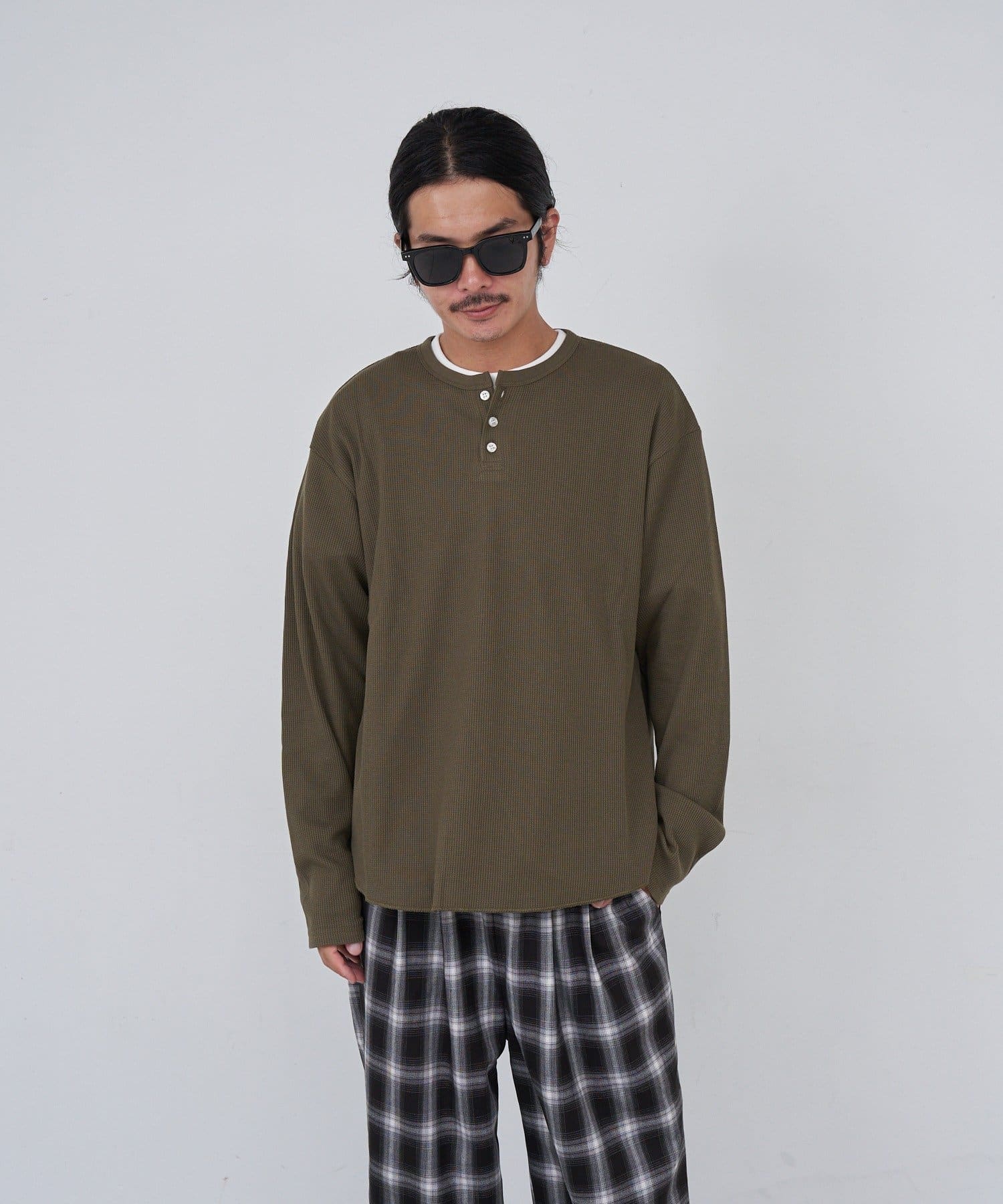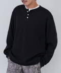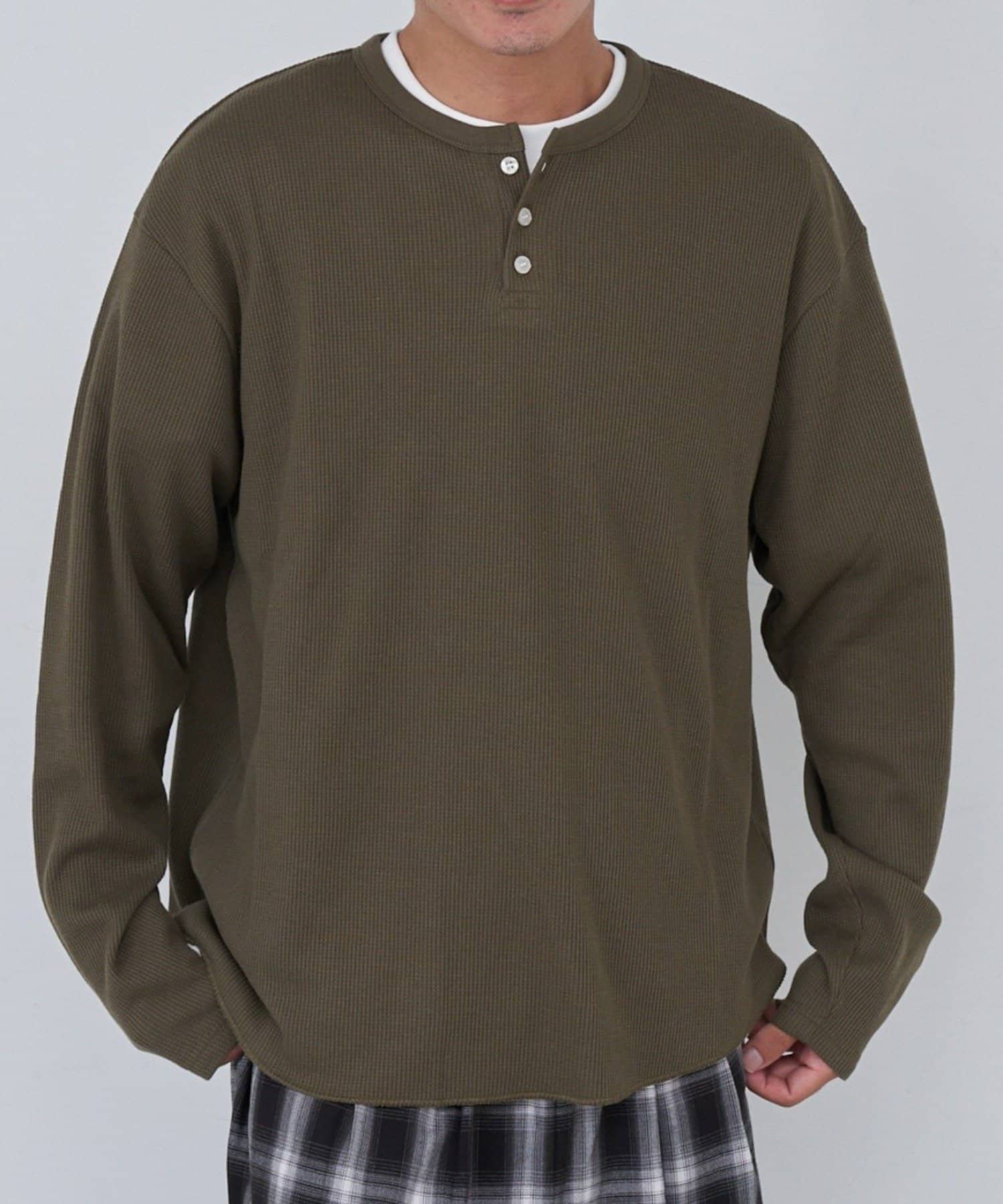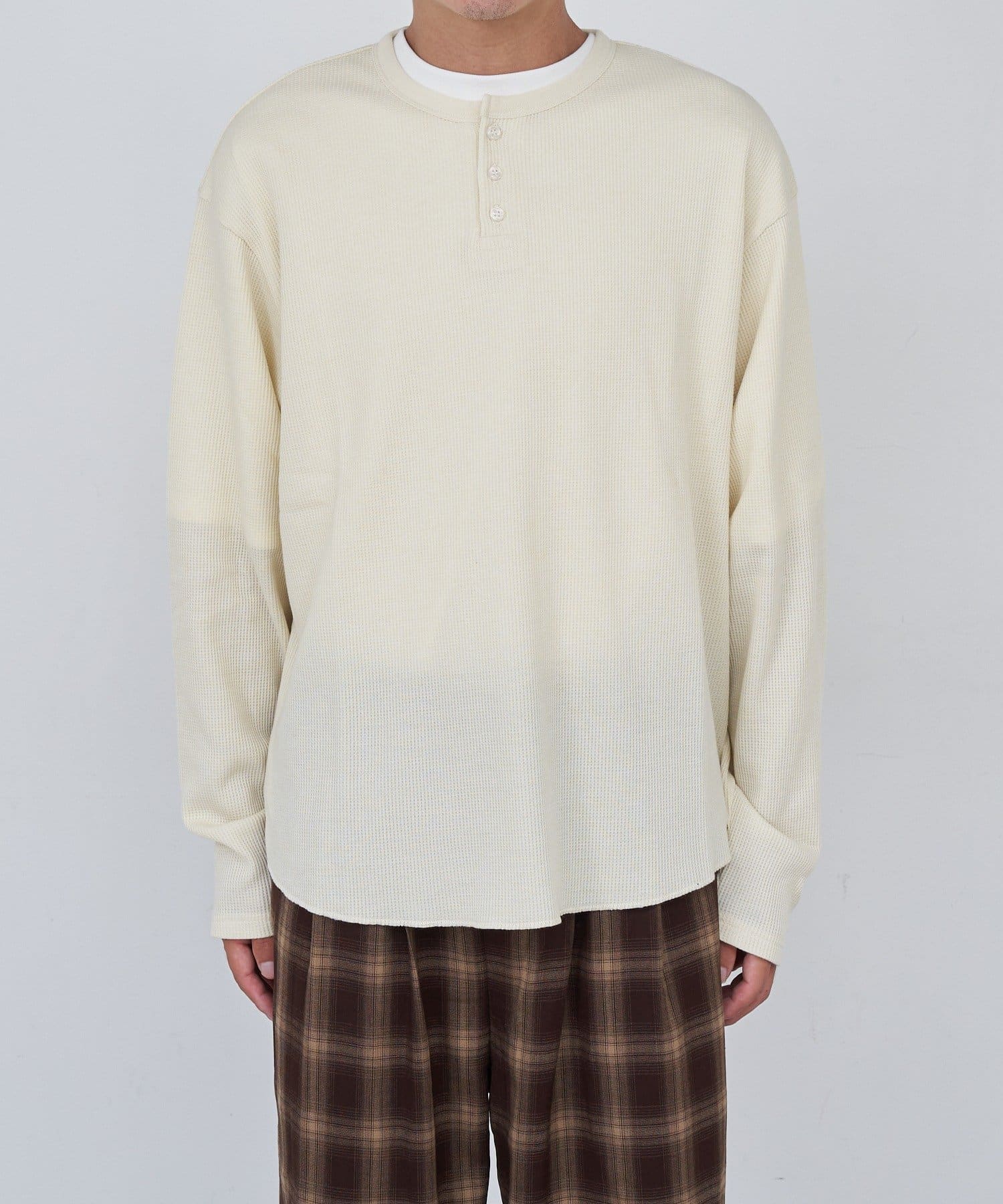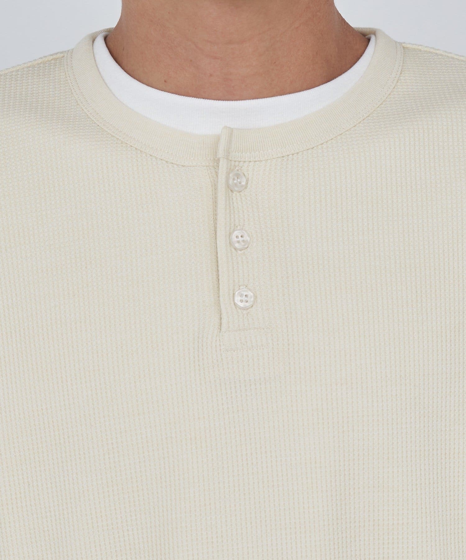 ワッフル素材ならではの表情が魅力のヘンリーネックトップス。
