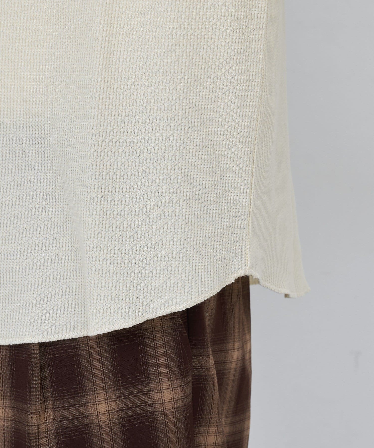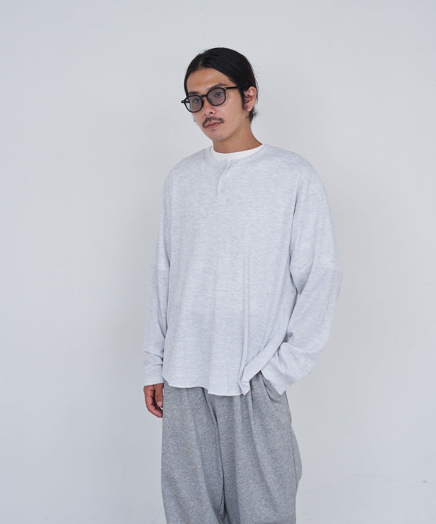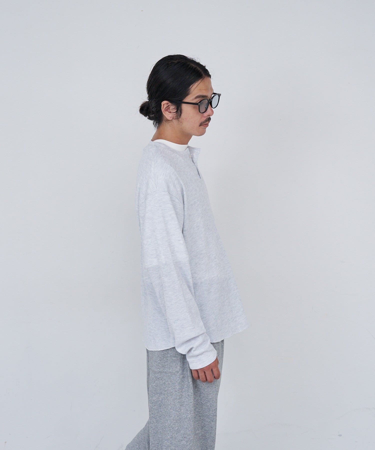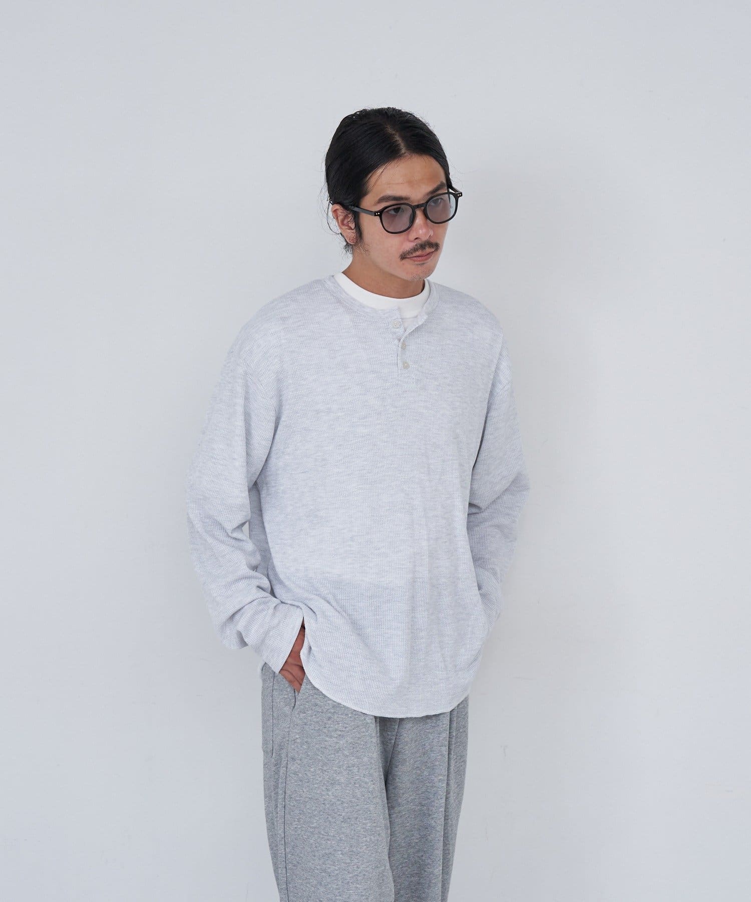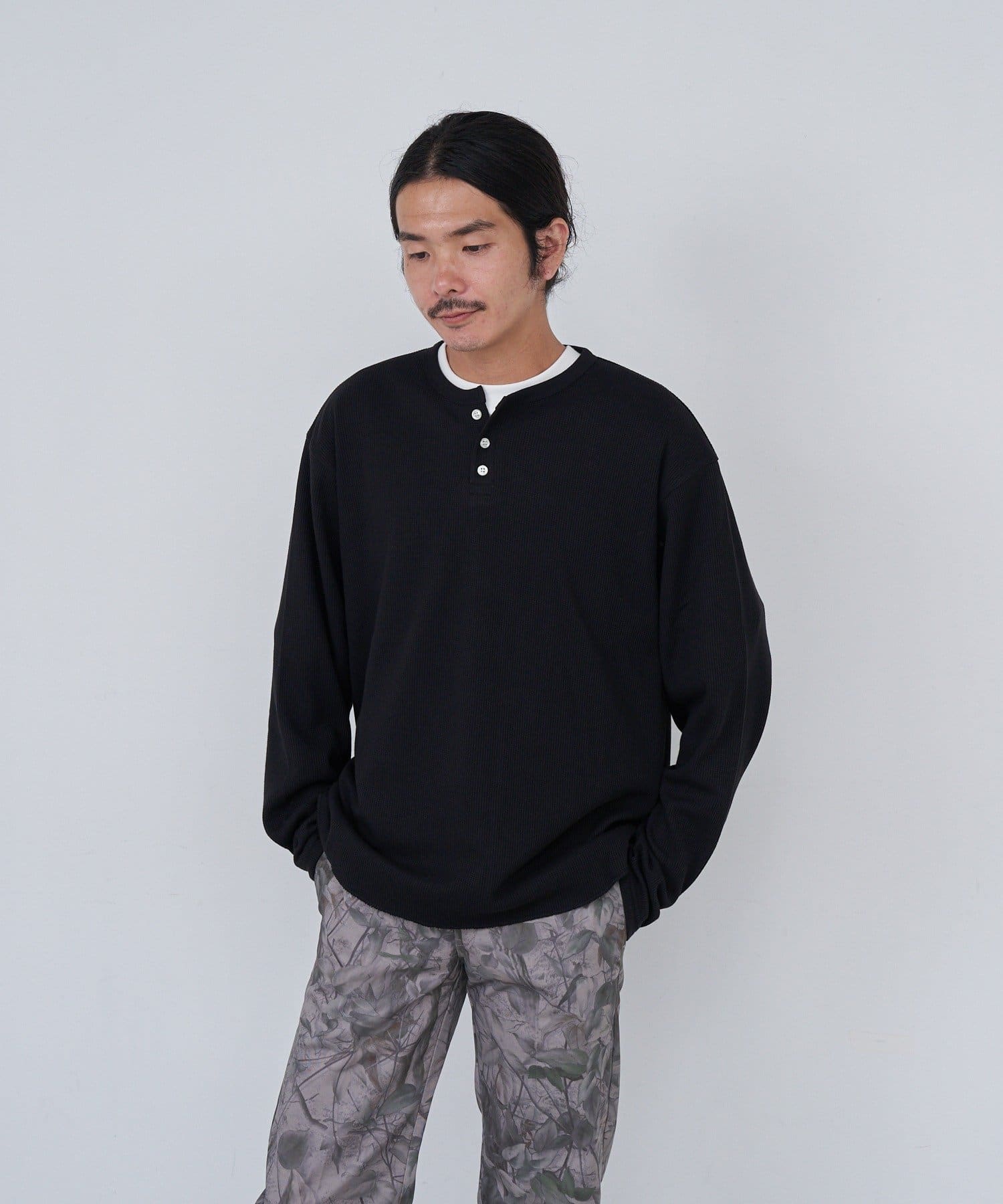 ワッフル素材ならではの表情が魅力のヘンリーネックトップス。