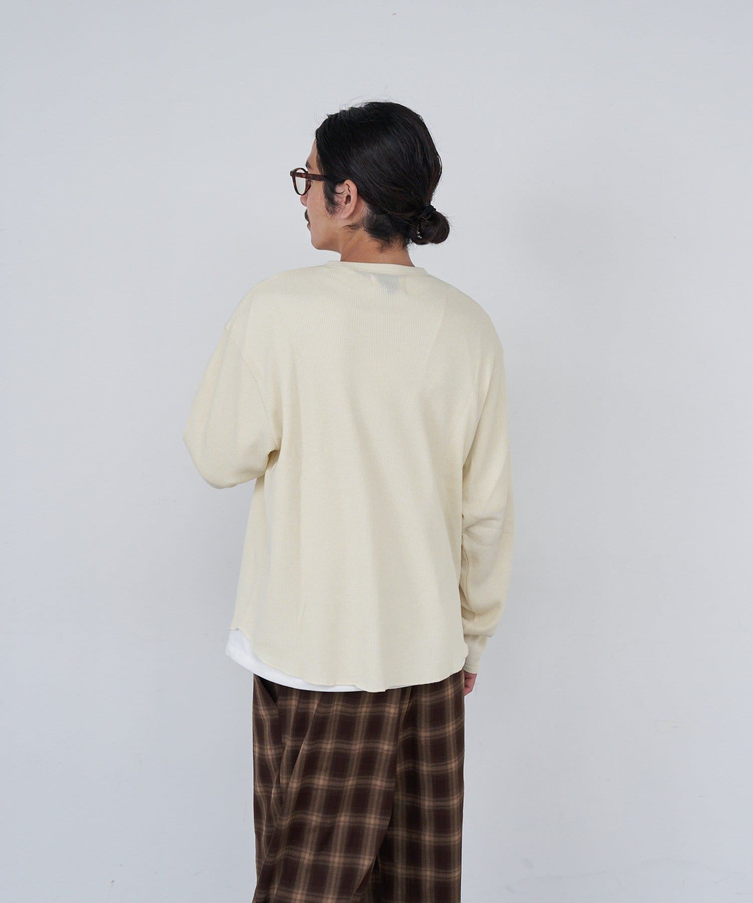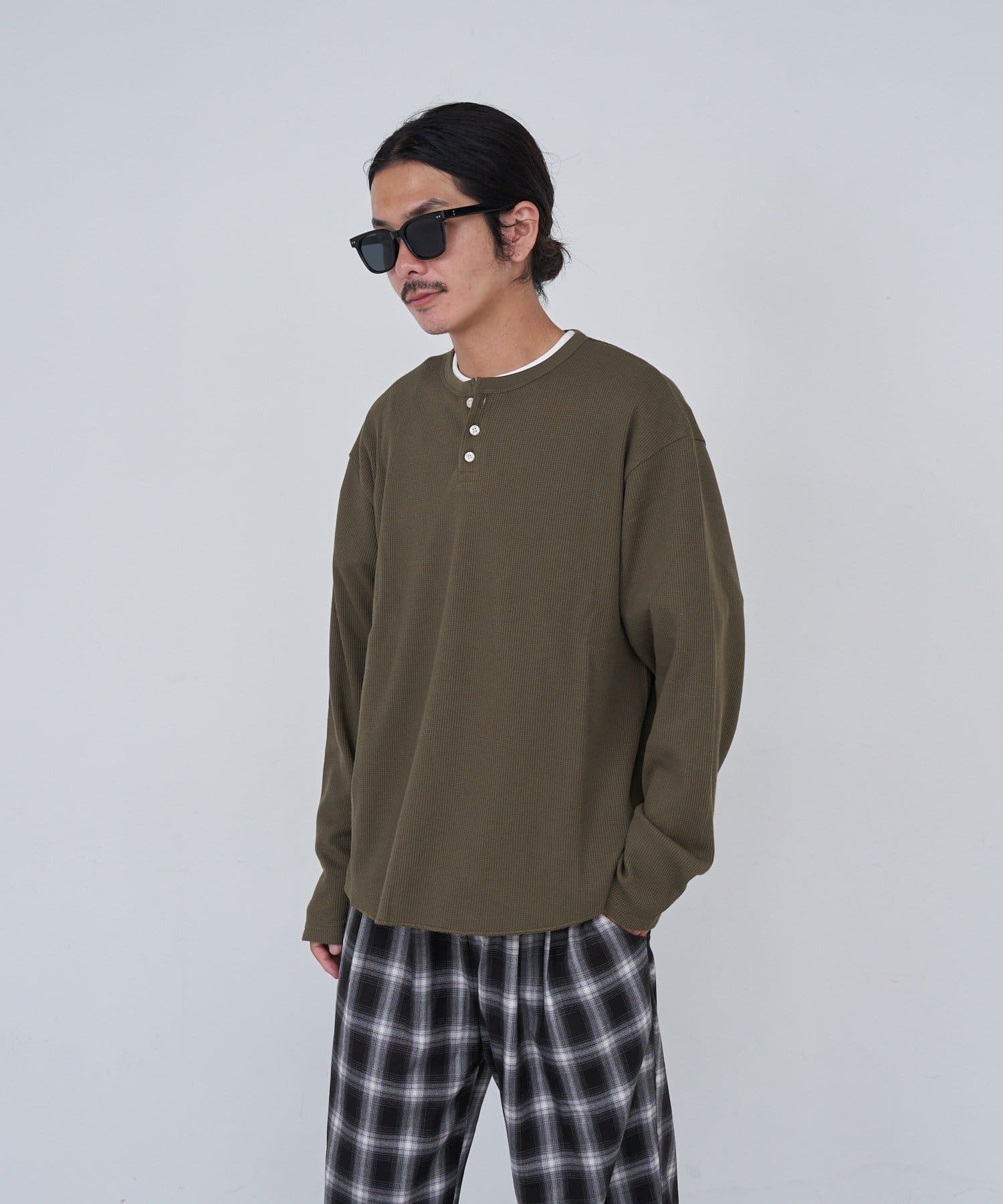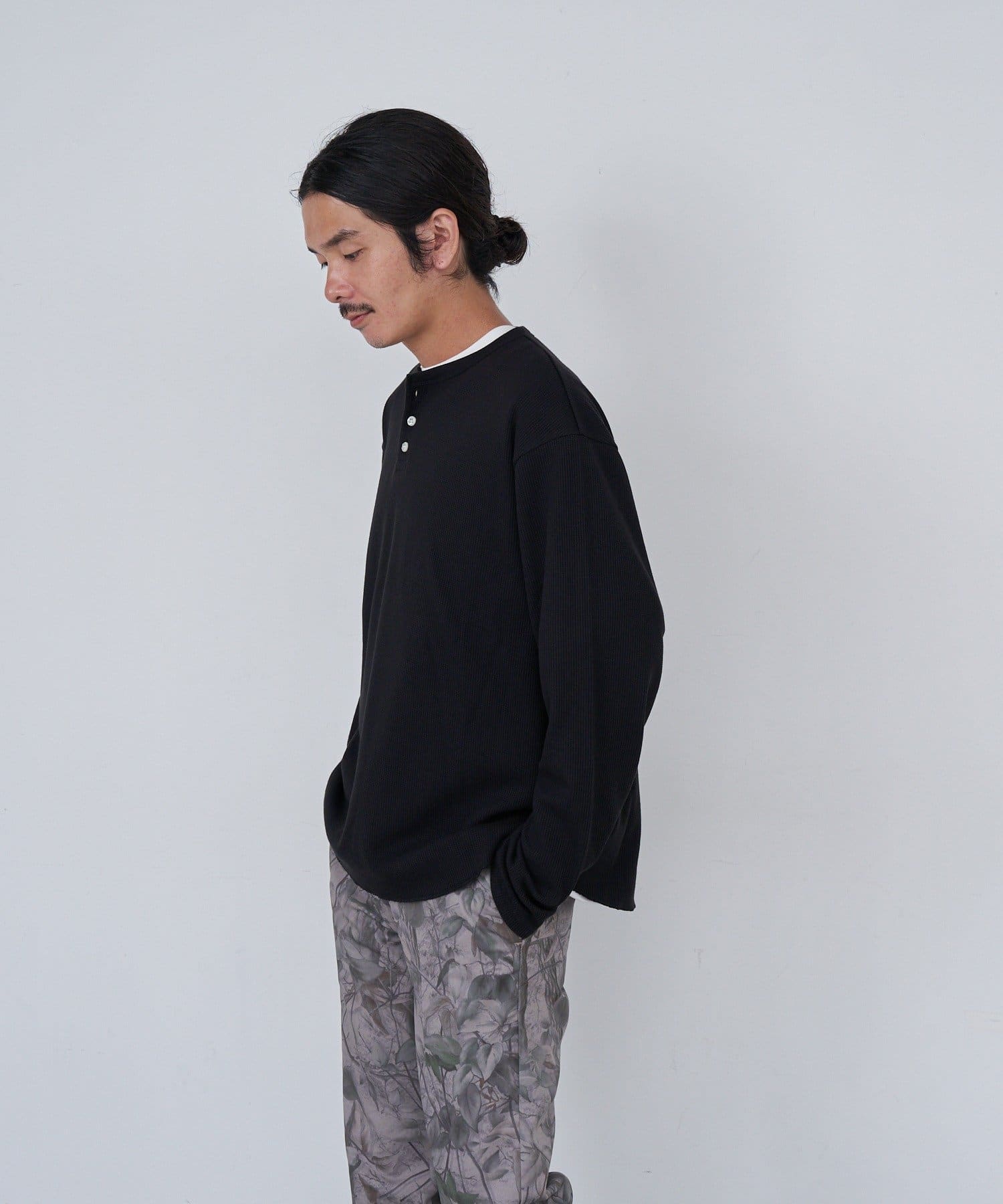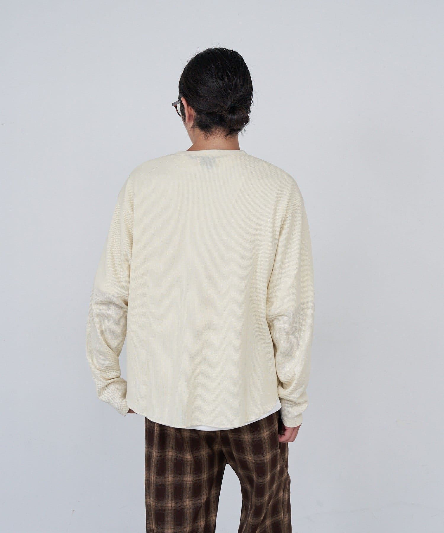 ワッフル素材ならではの表情が魅力のヘンリーネックトップス。
