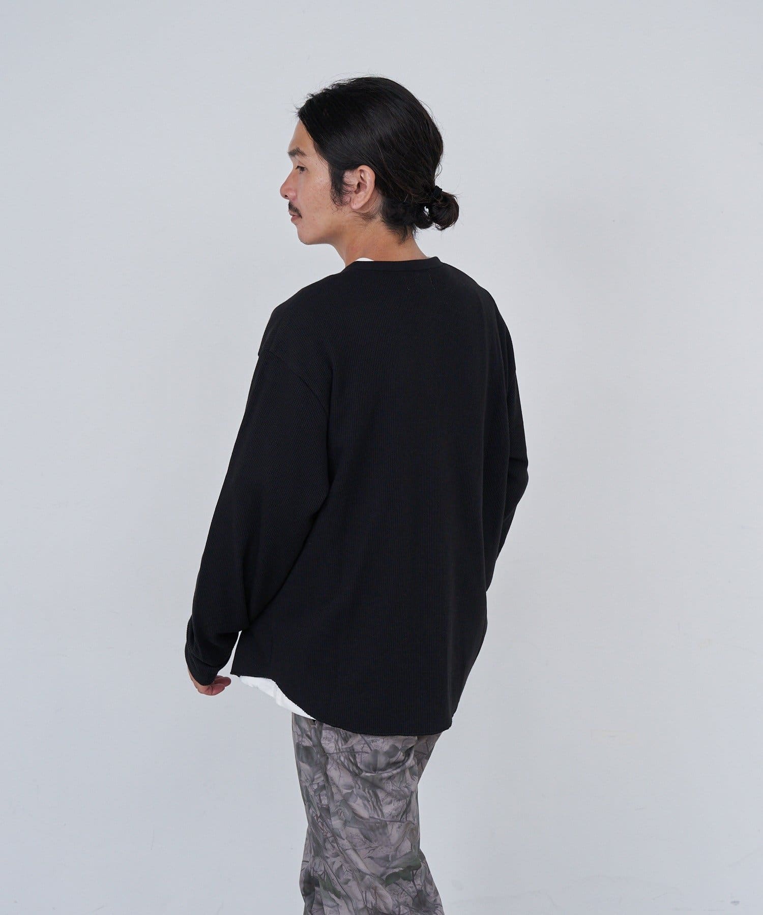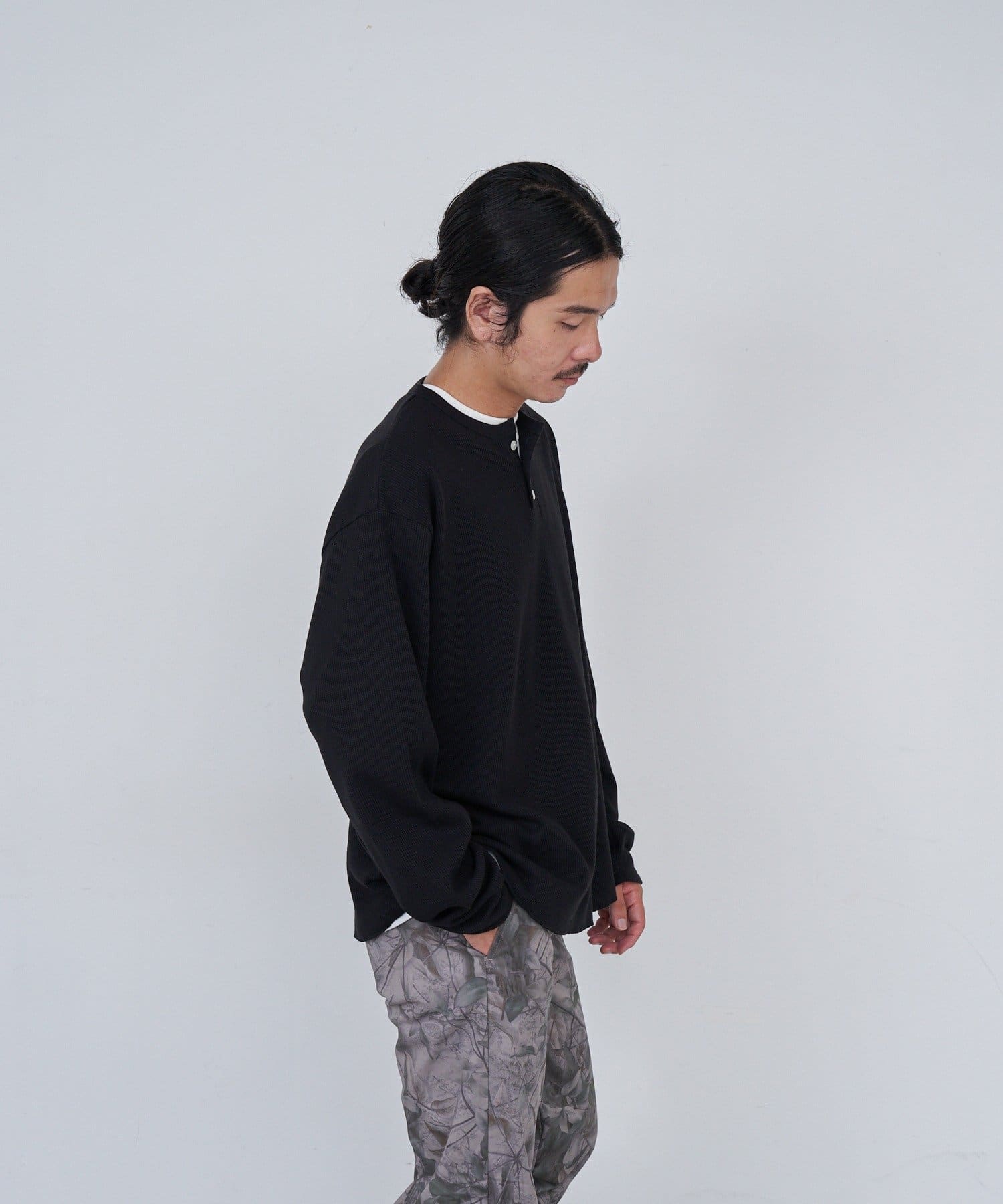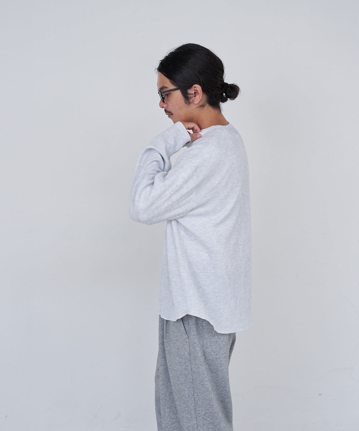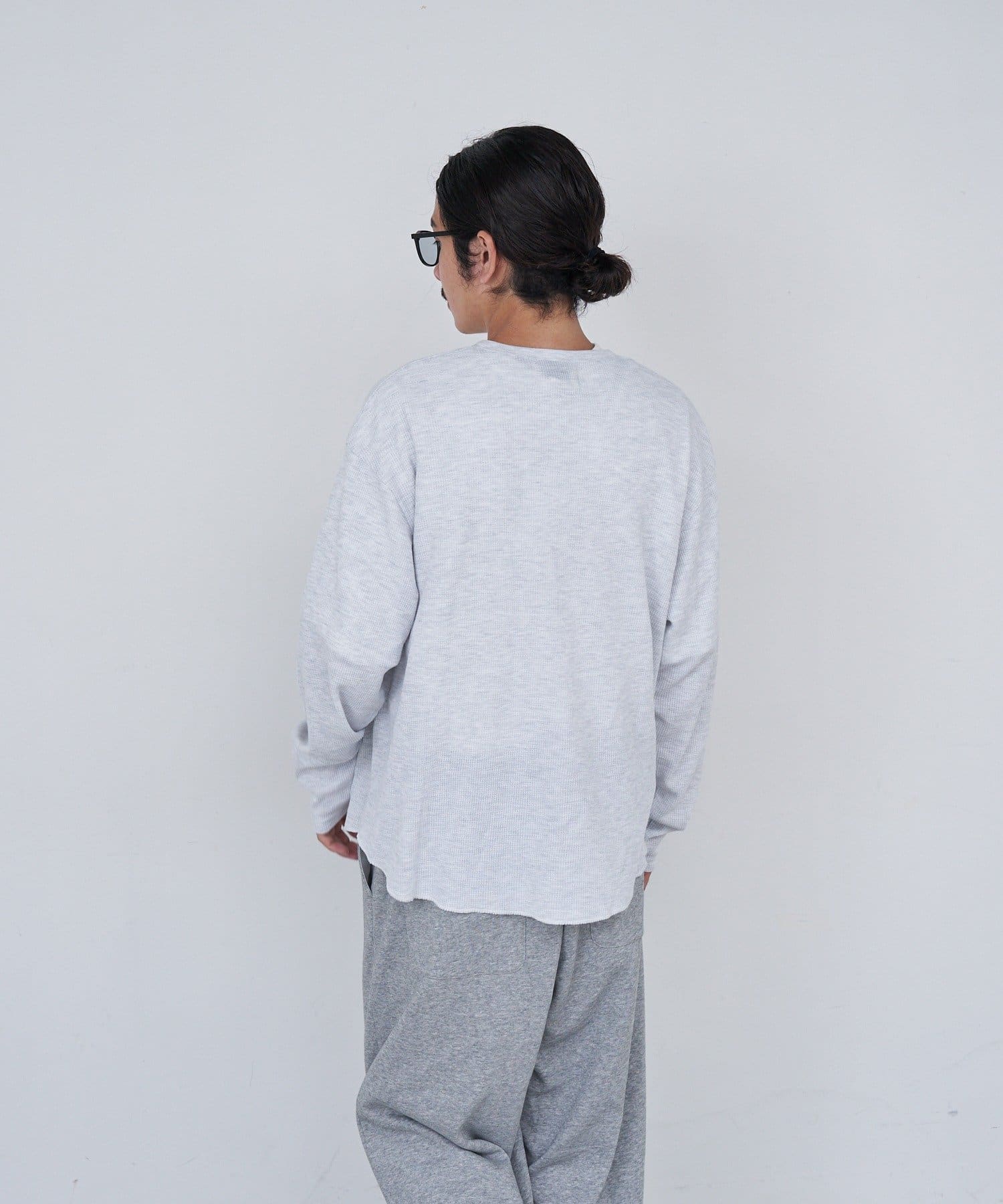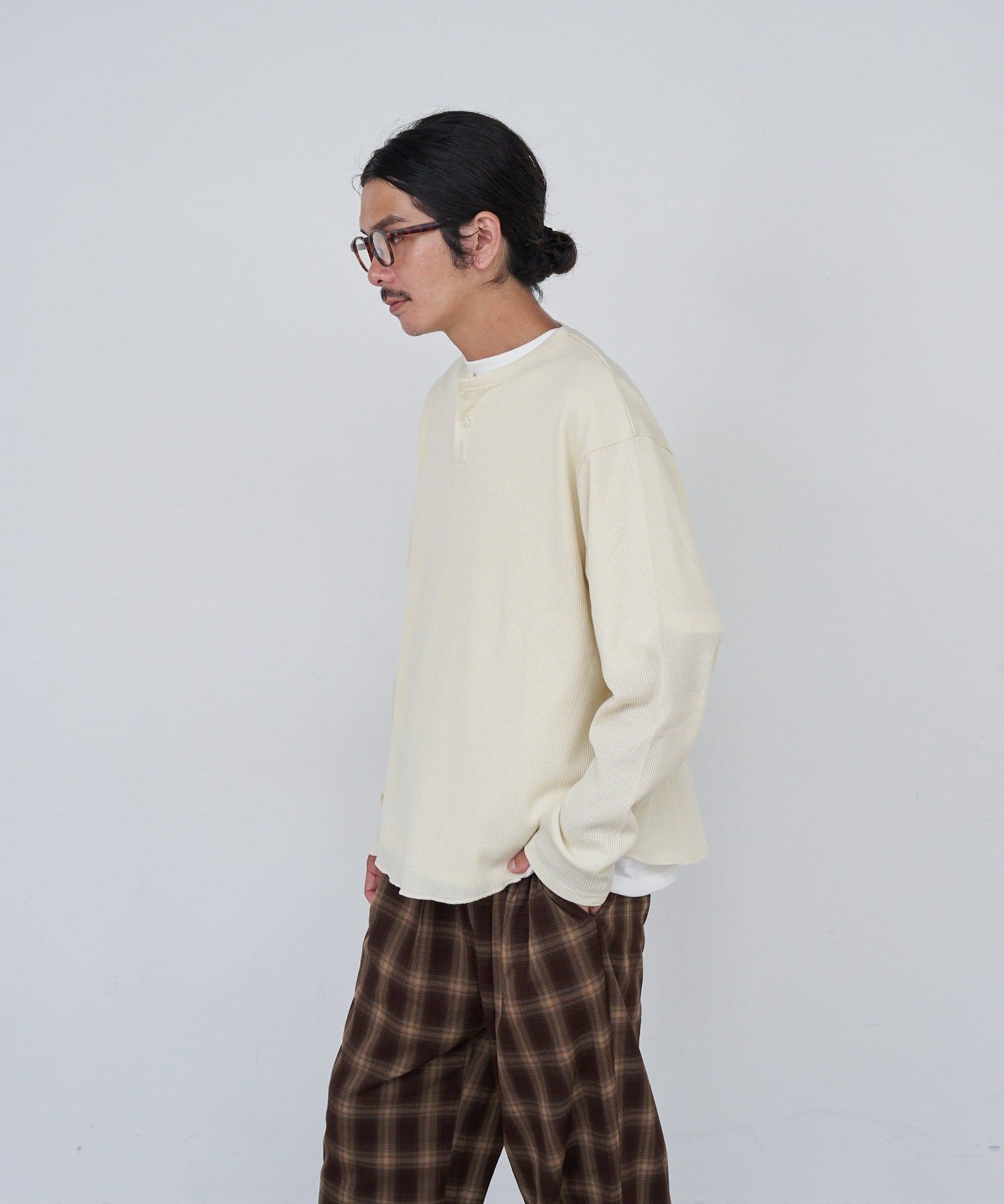 ワッフル素材ならではの表情が魅力のヘンリーネックトップス。