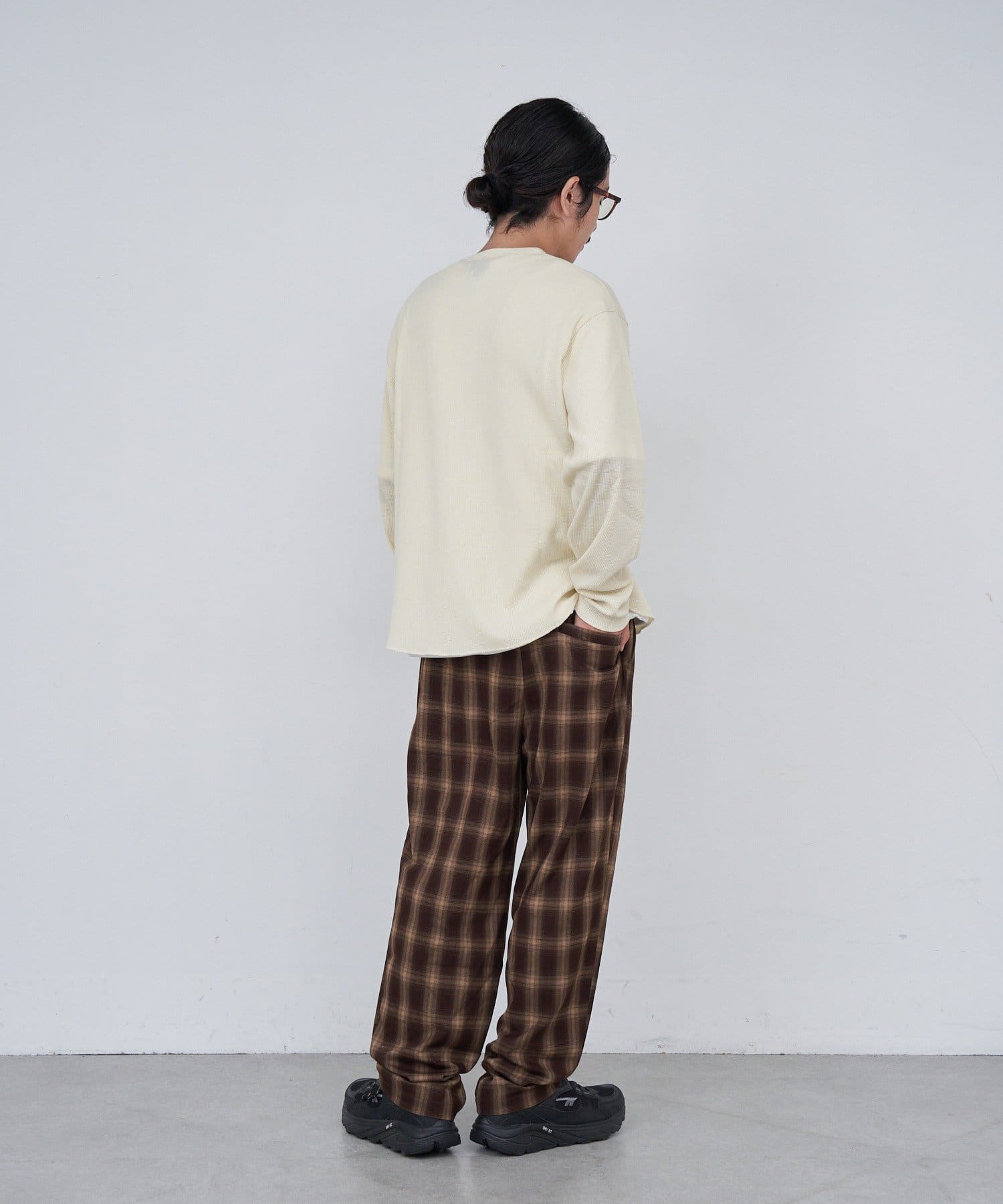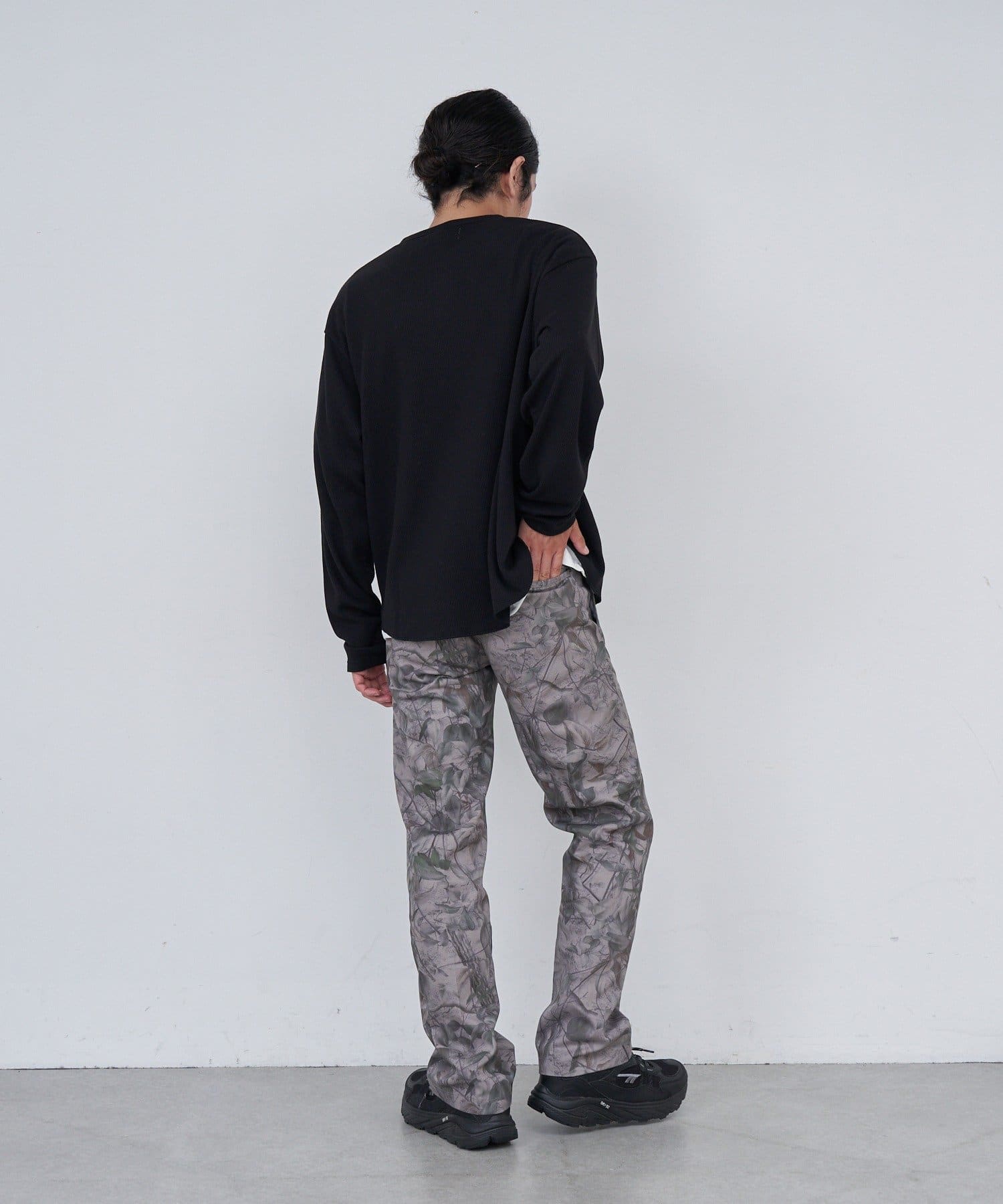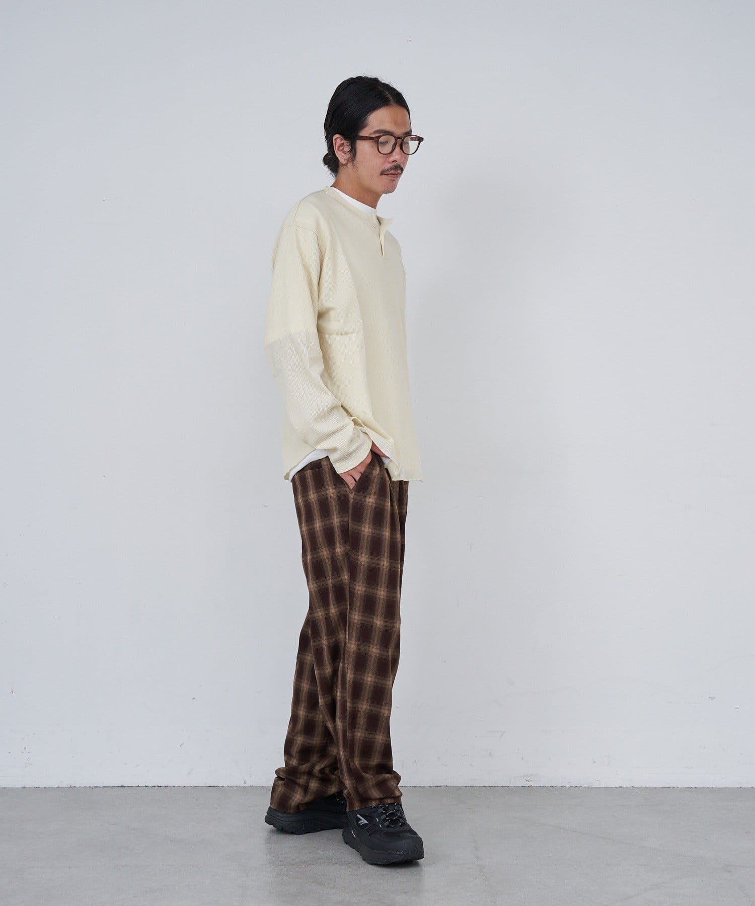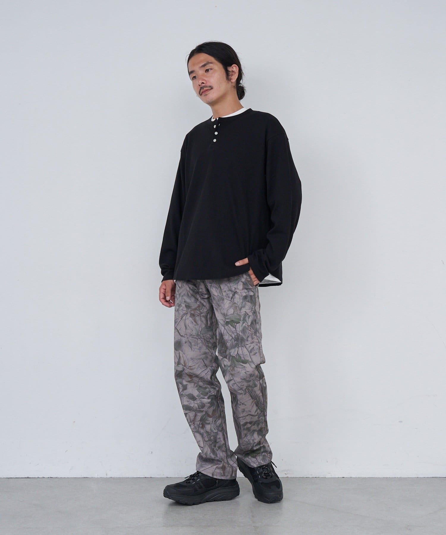 ワッフル素材ならではの表情が魅力のヘンリーネックトップス。