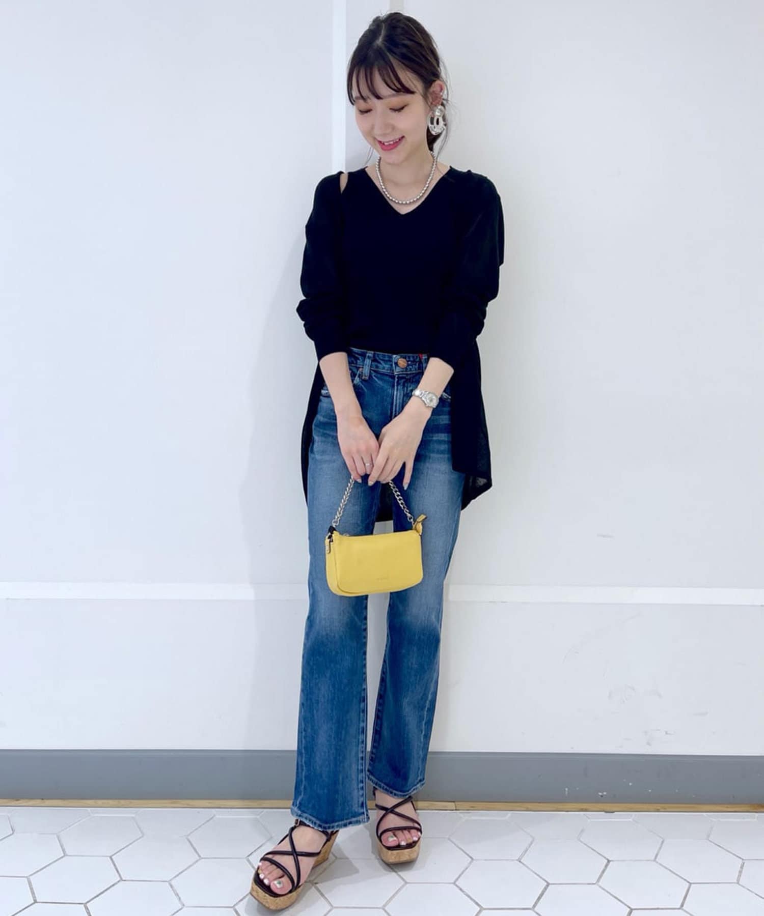 また、ミッドライズで脚長効果もある女性らしいデニムパンツです。