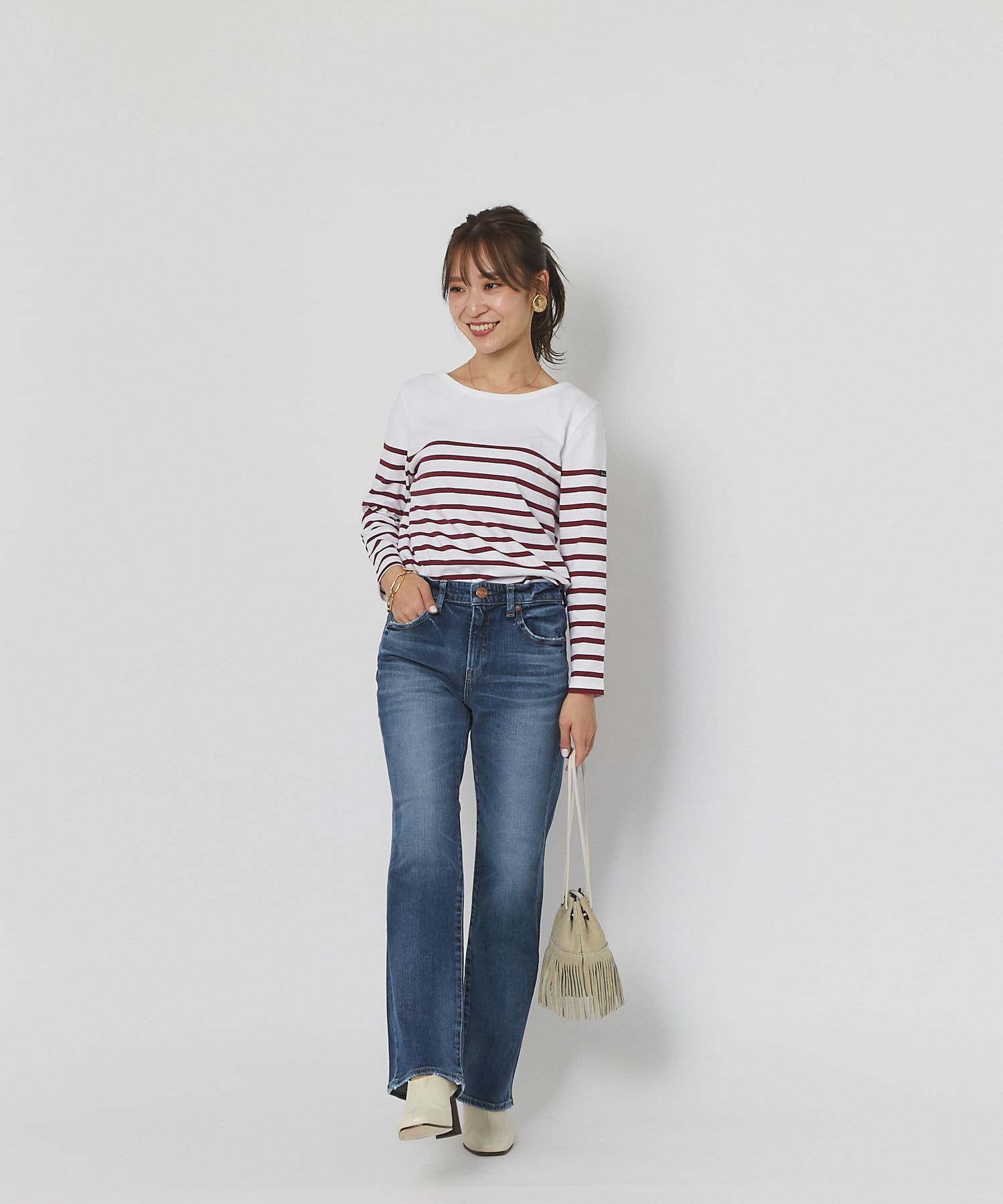 女性らしいシルエットのデニムパンツなので、ボーダーTシャツなどカジュアルなスタイルもカジュアル過ぎずにきれいに決まります。