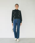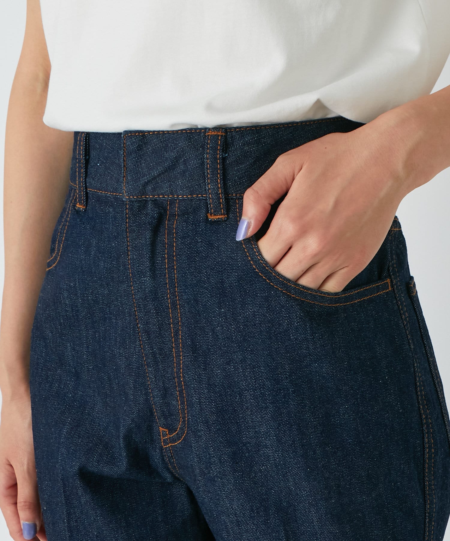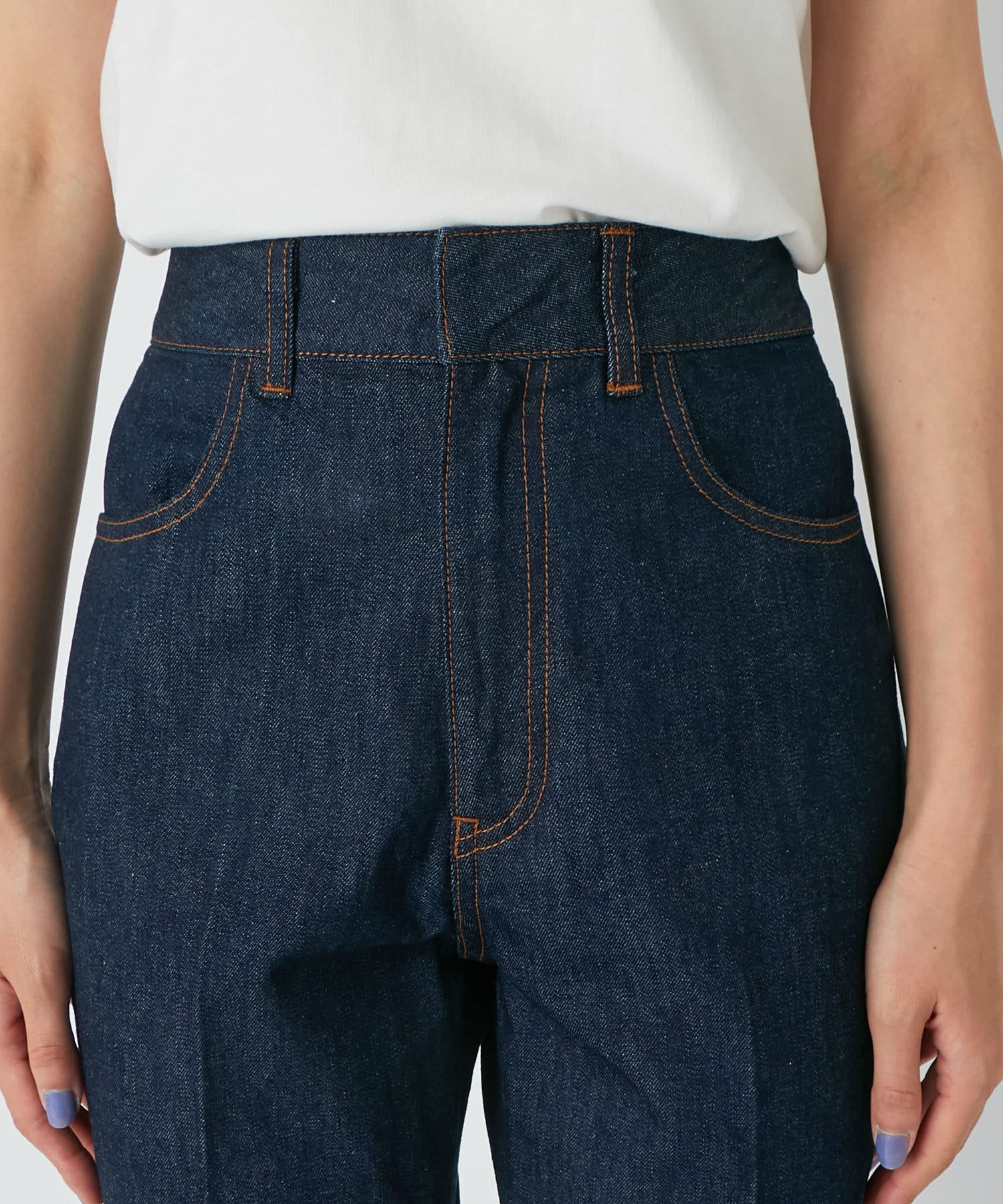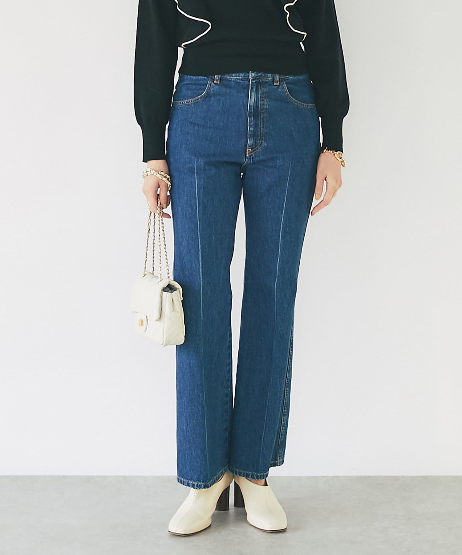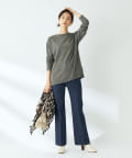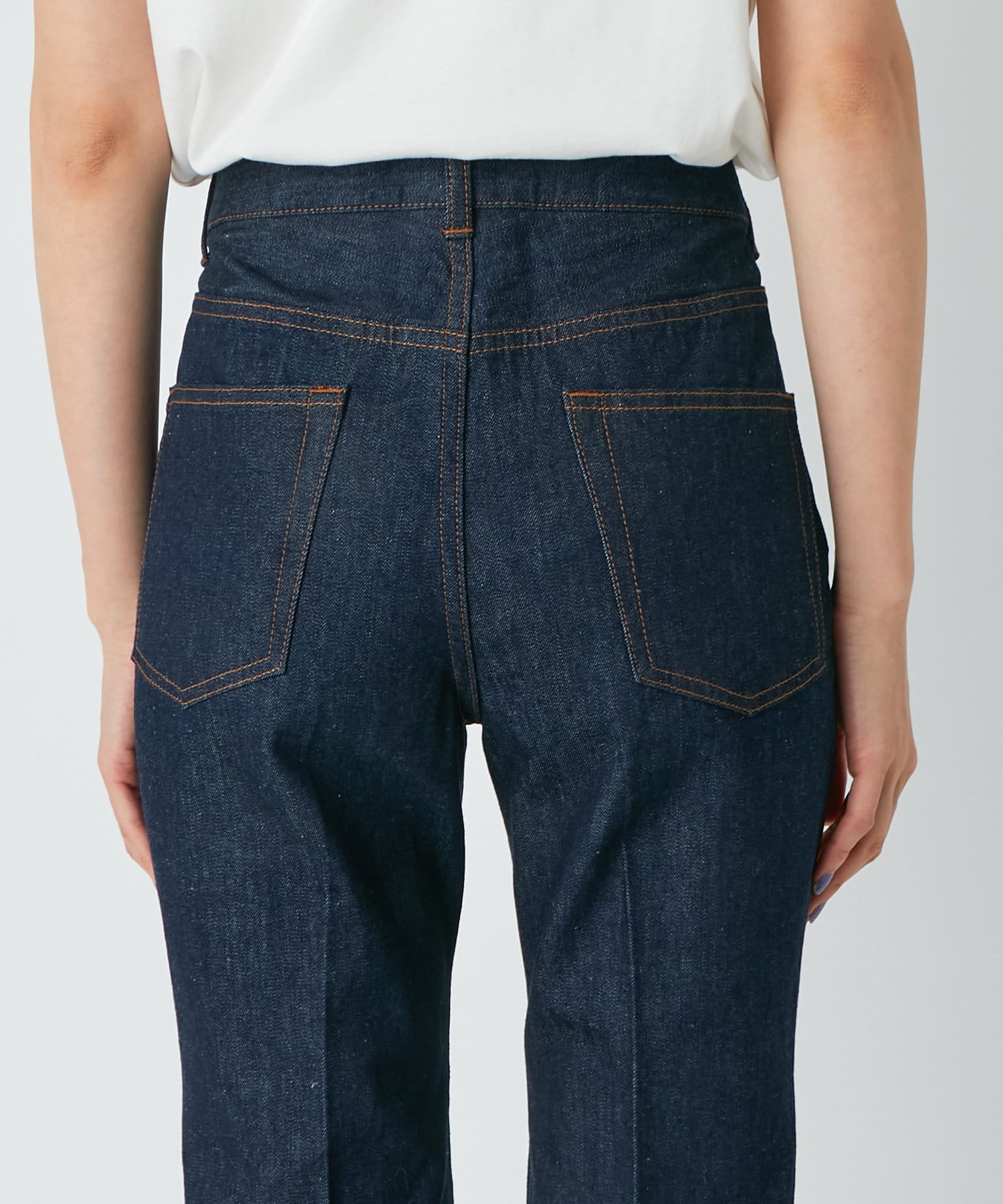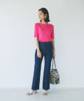 デニム素材でカジュアルながら、センタープレスにすることで上品さがプラスされたデニムパンツ。