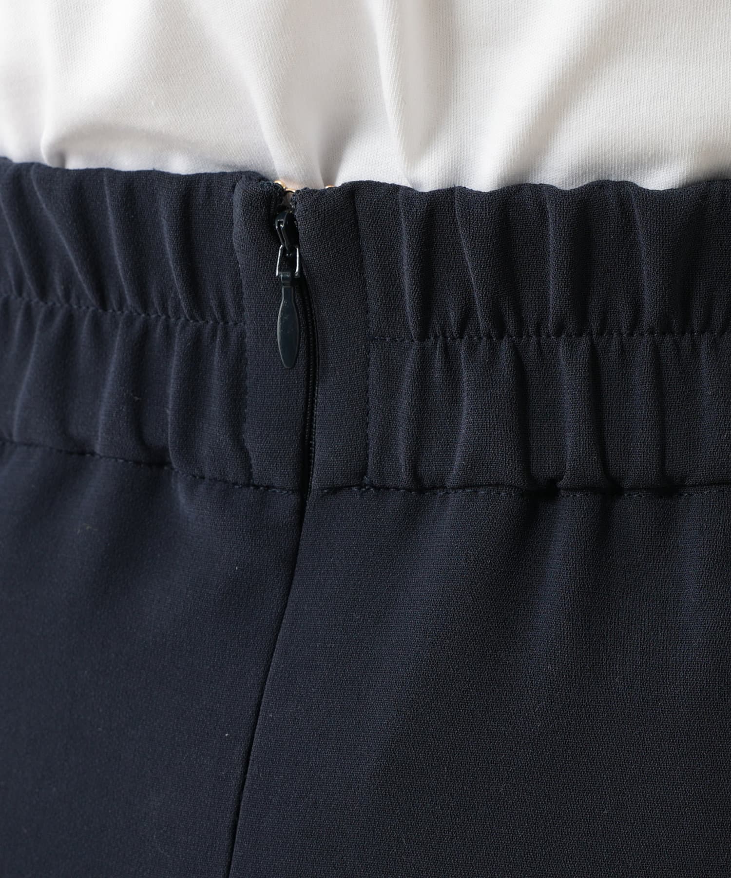 ハイウエストのベルト切り替えで脚長効果のある一枚で、後ろウエストがゴム仕様になっているのでストレスなく穿いていただけます。