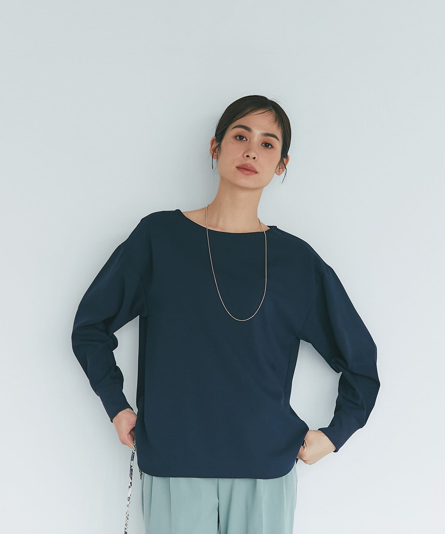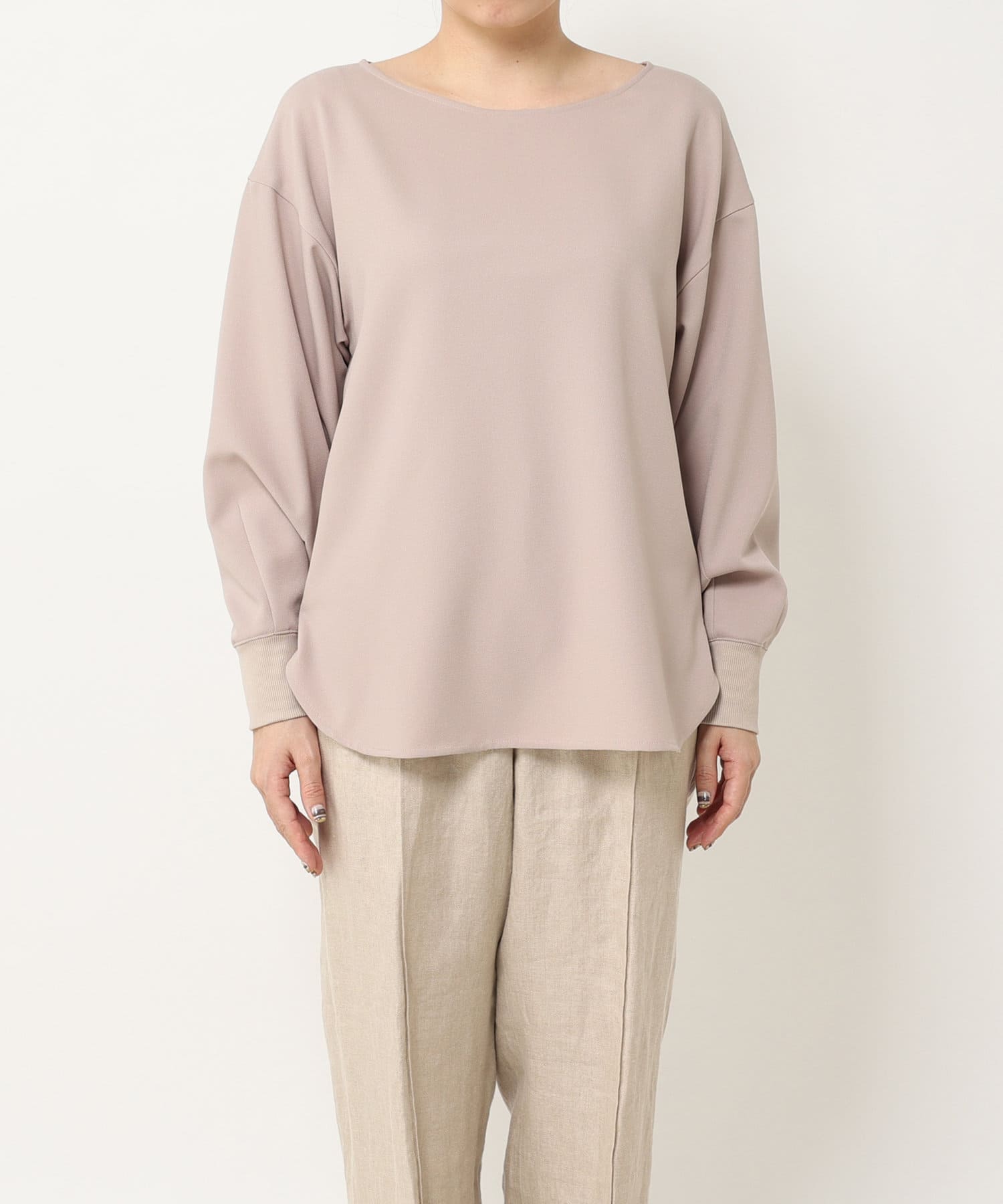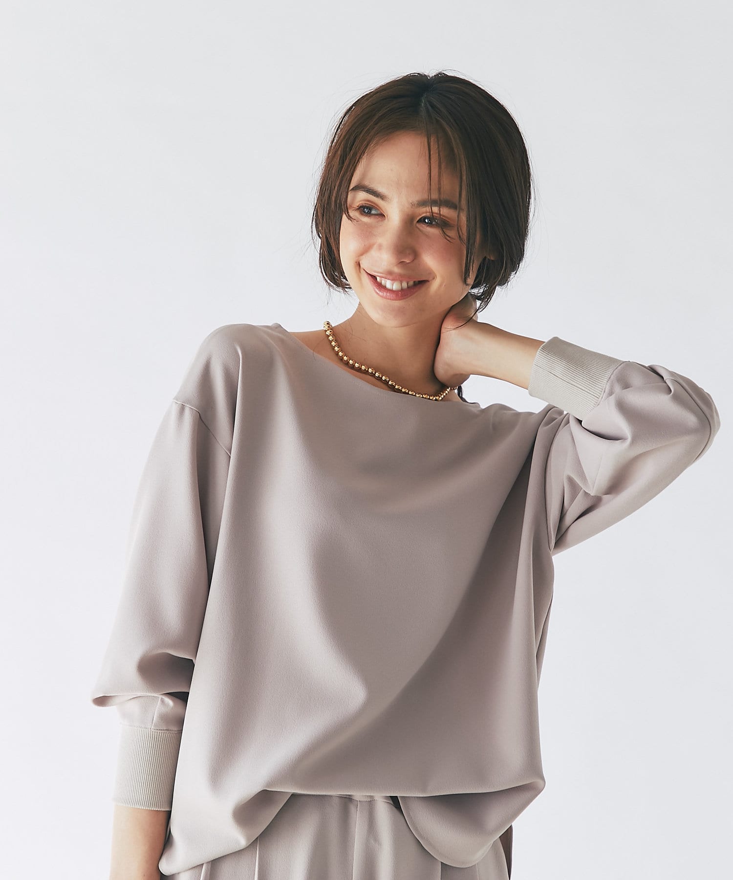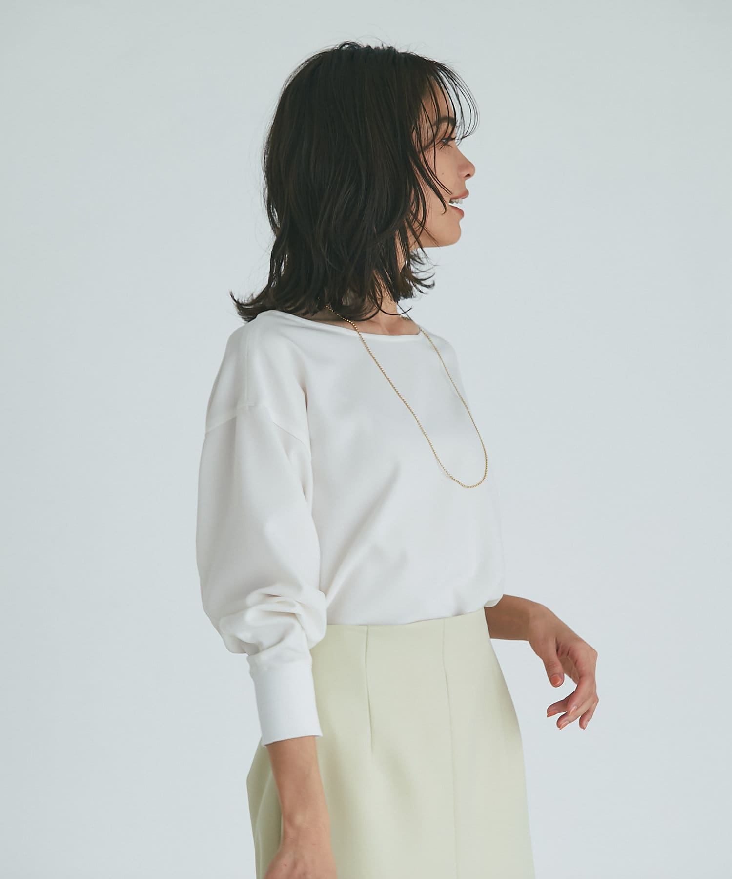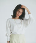 抜け感があり、デコルテをきれいに見せてくれるボートネックで、袖口にはリブを施し、トレンドのやや長めカフスに仕上げました。