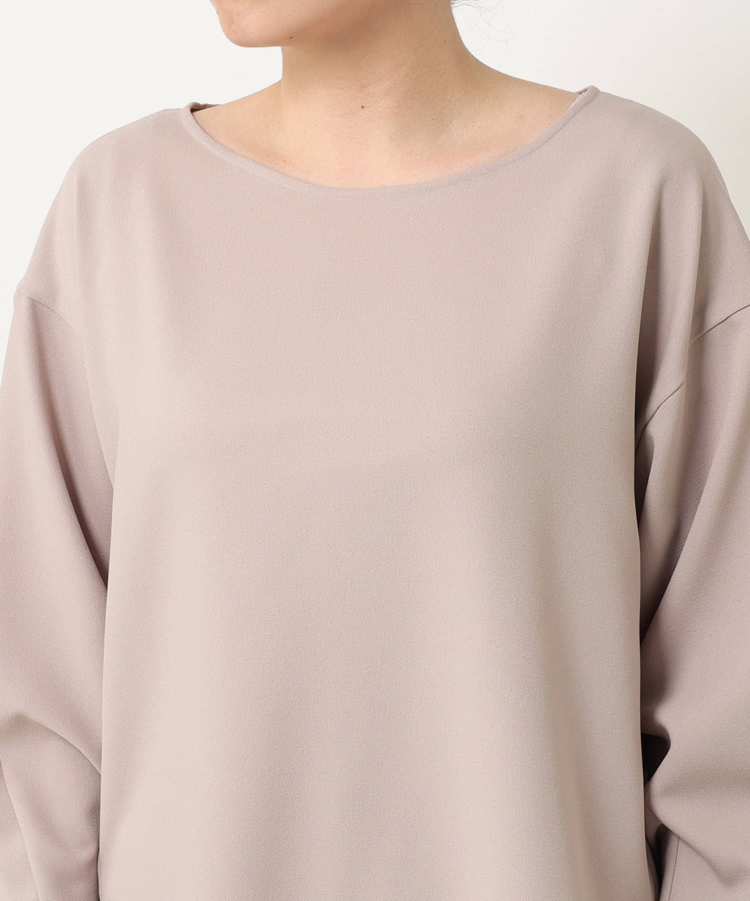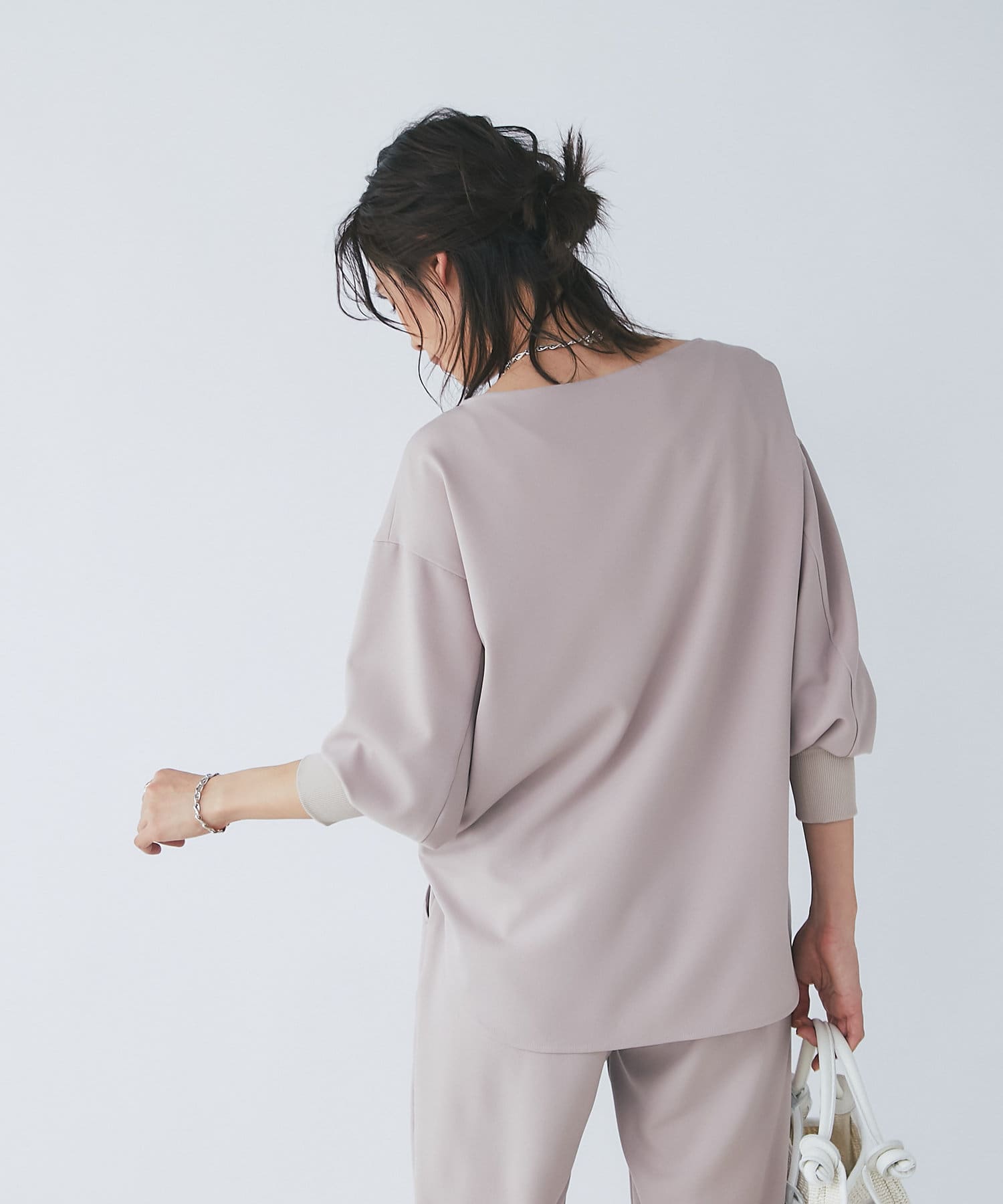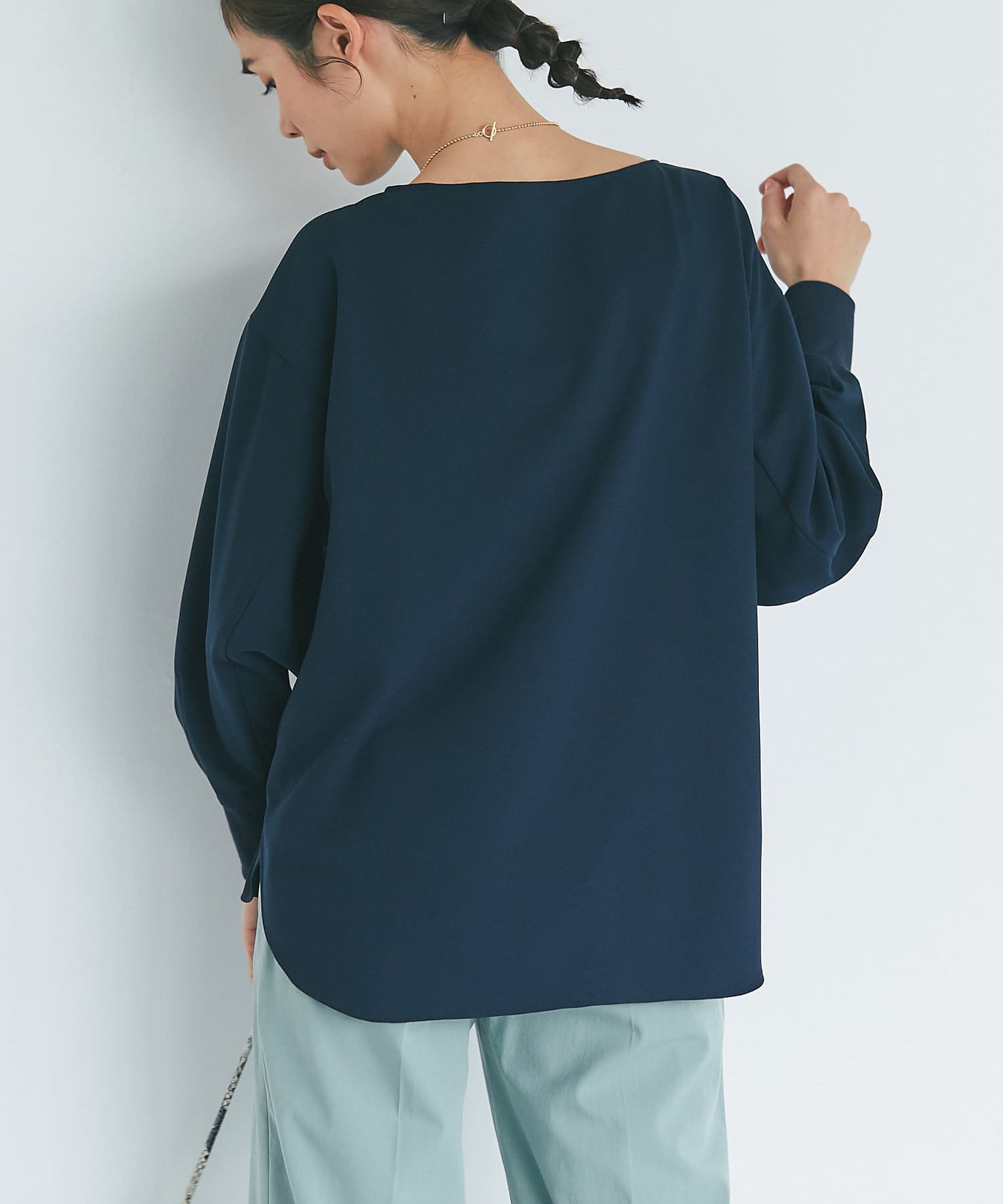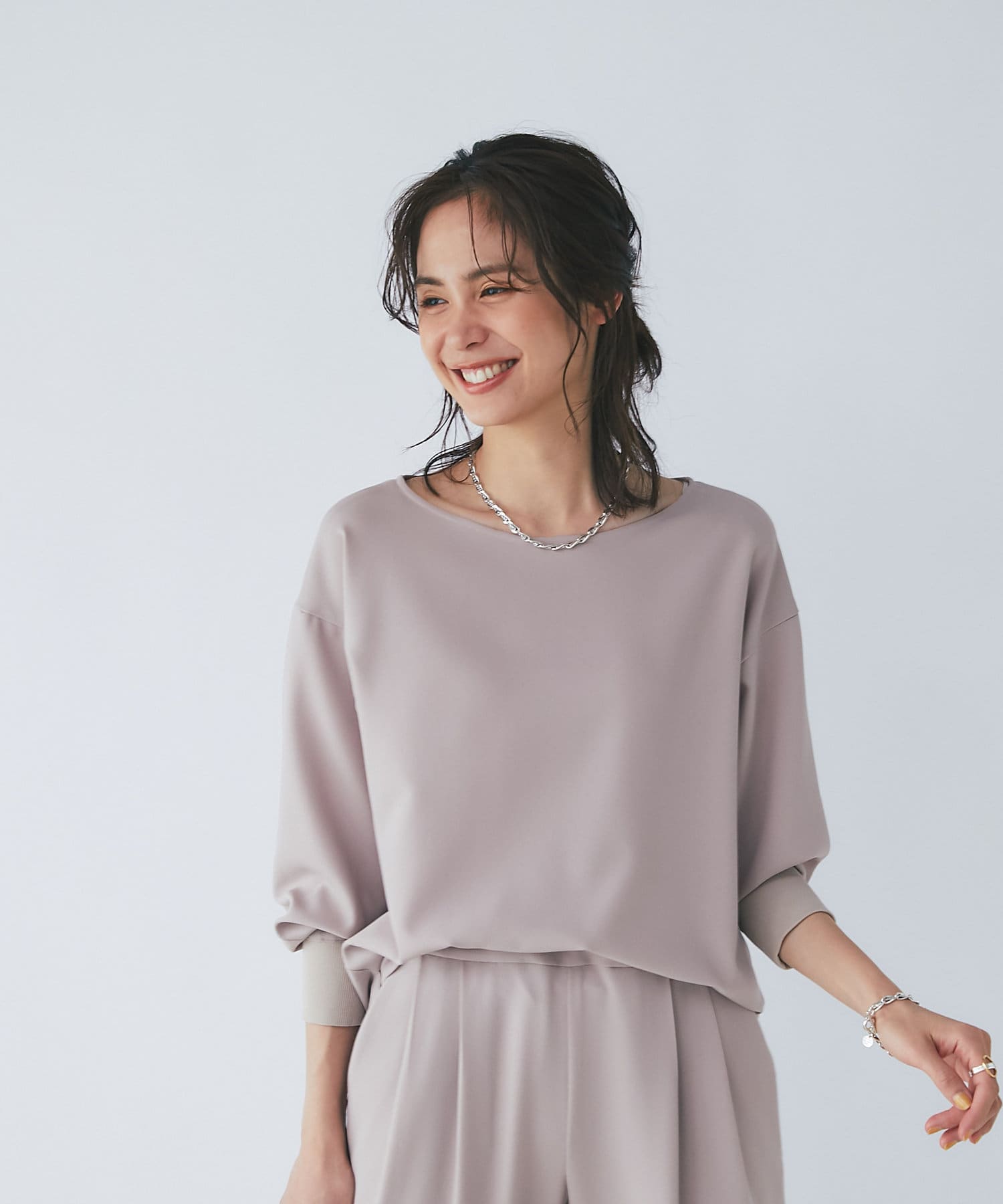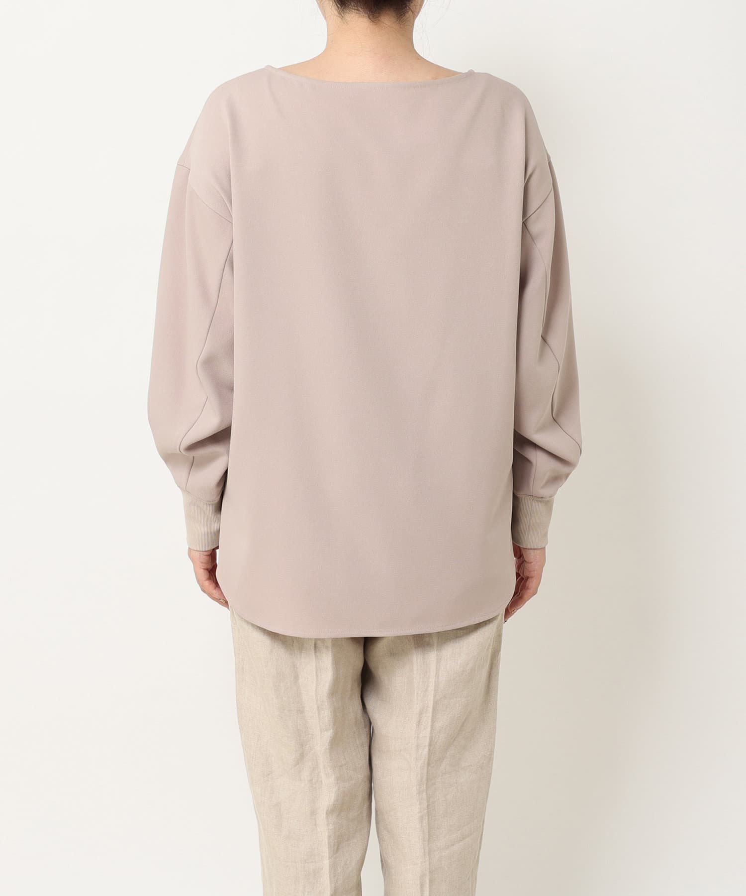 抜け感があり、デコルテをきれいに見せてくれるボートネックで、袖口にはリブを施し、トレンドのやや長めカフスに仕上げました。