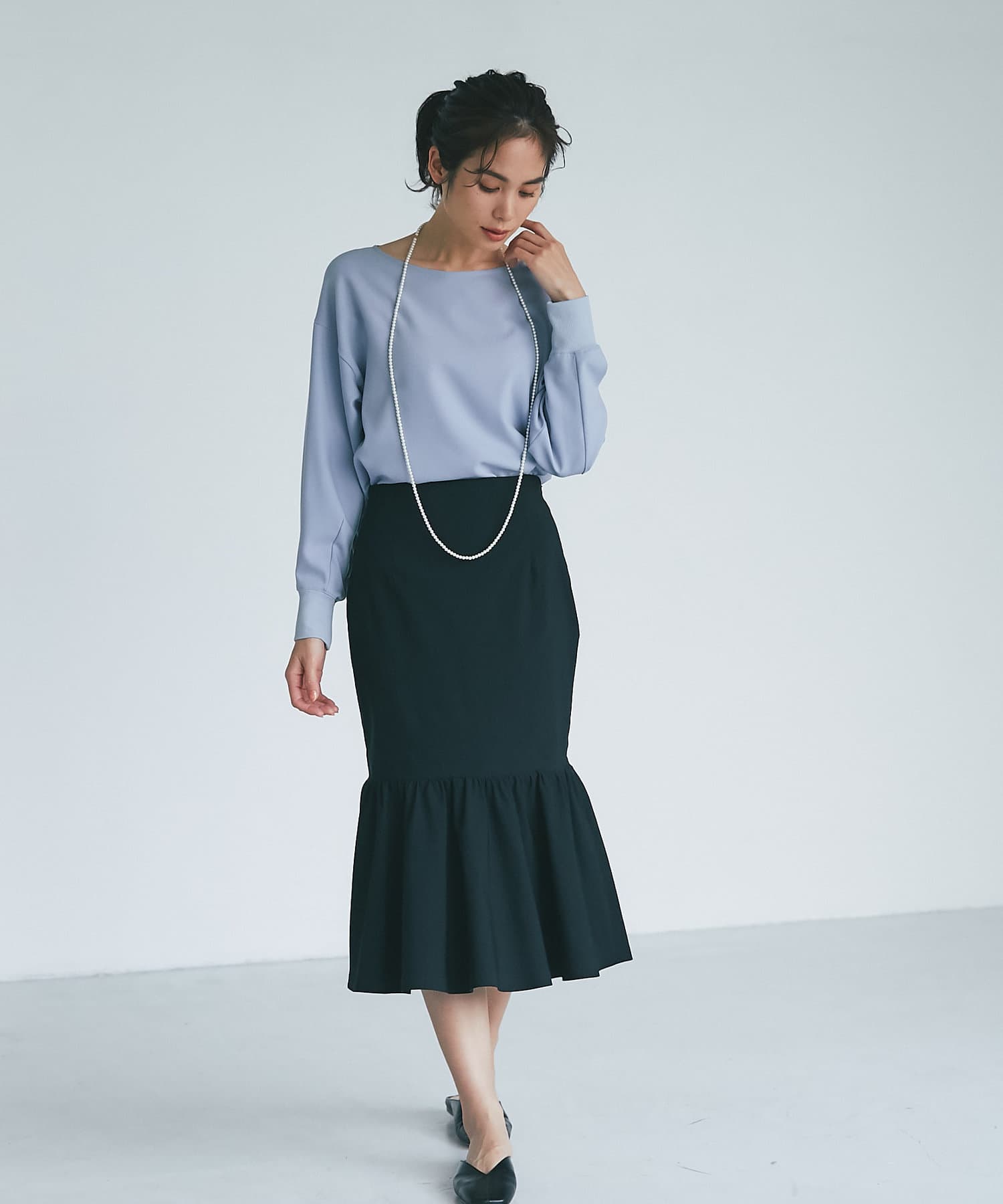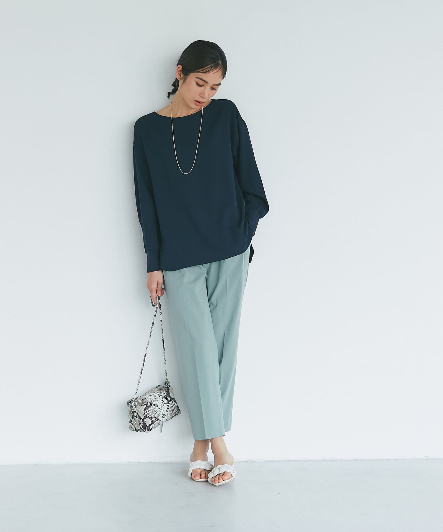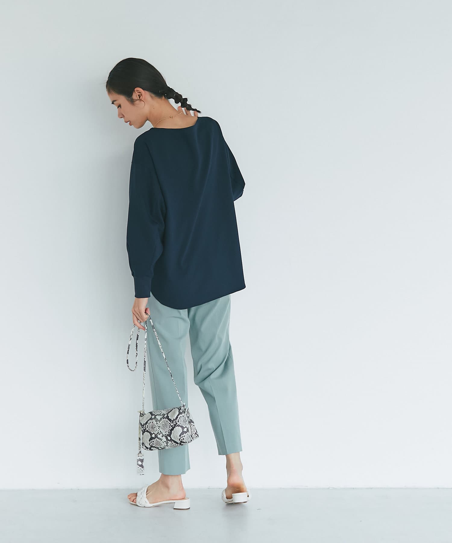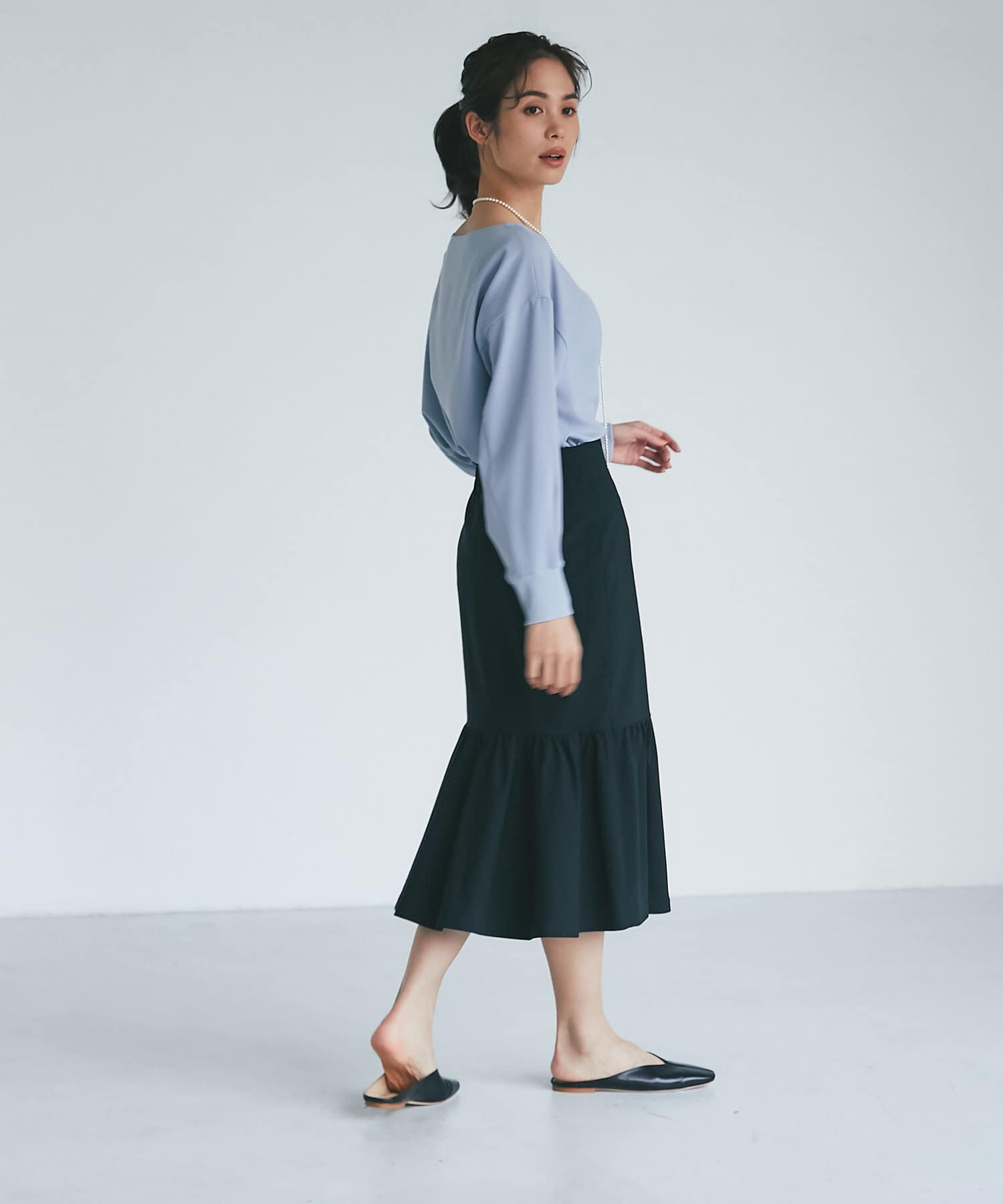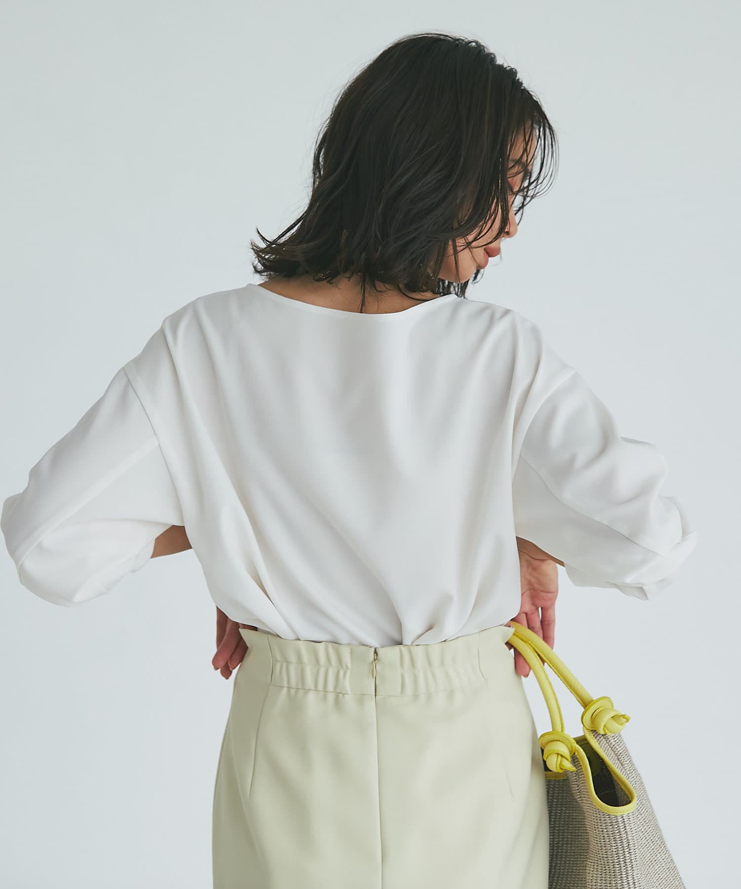 柔らかな素材と落ち感がきれいなブラウスは程よくゆったりとリラックスして着用でき、女らしいネックラインですっきり見せてくれます。
