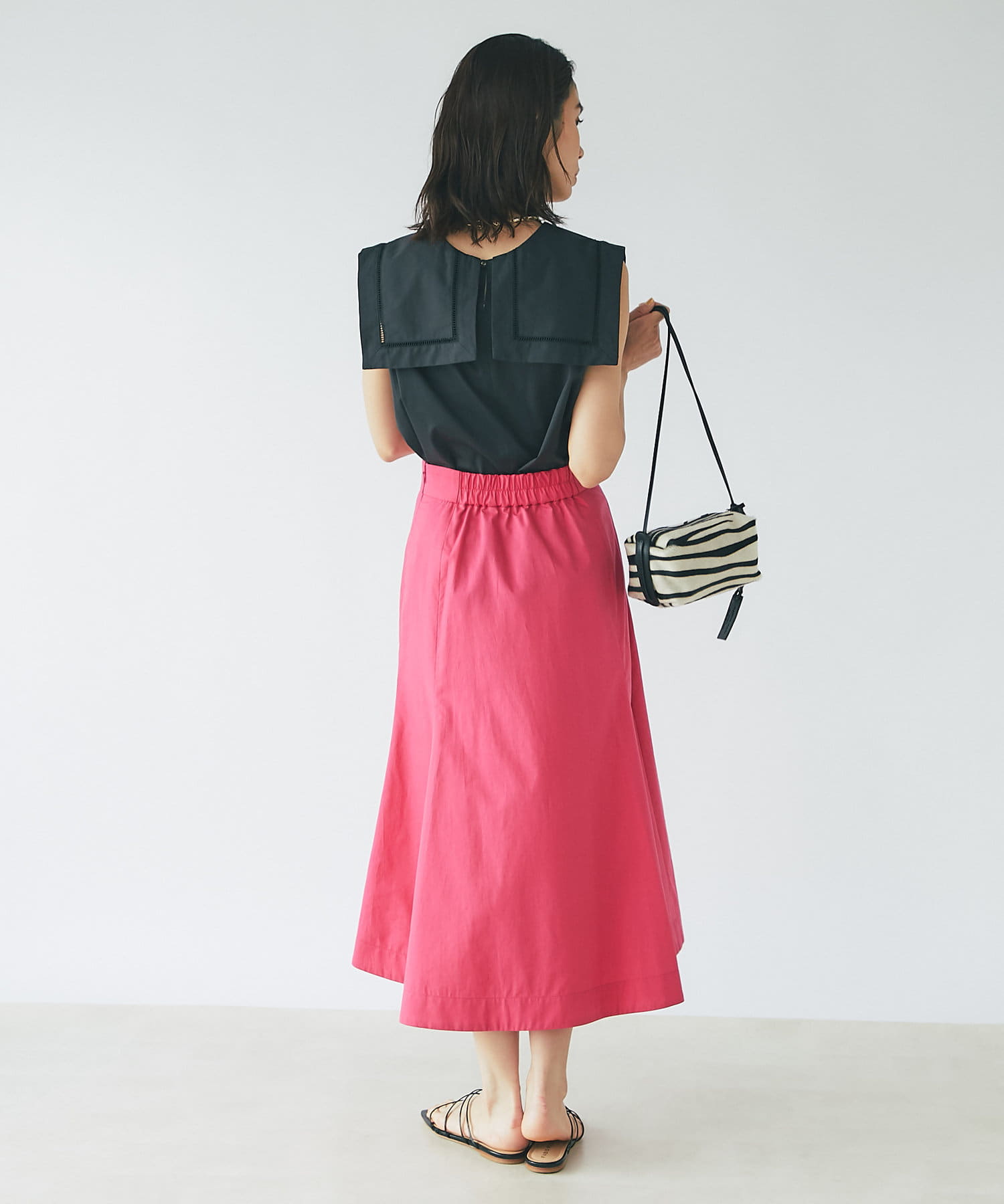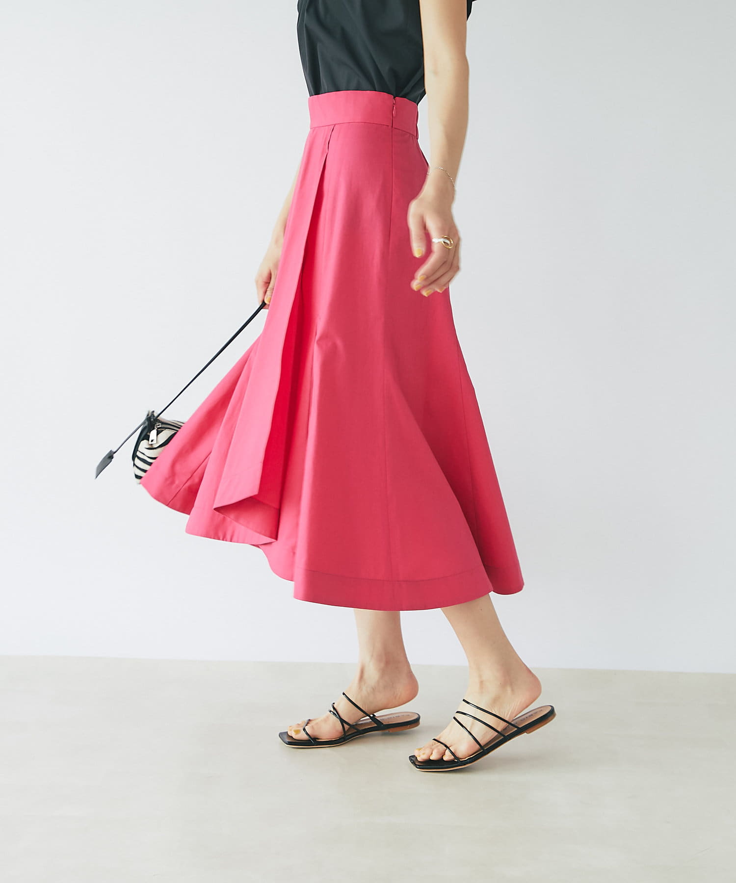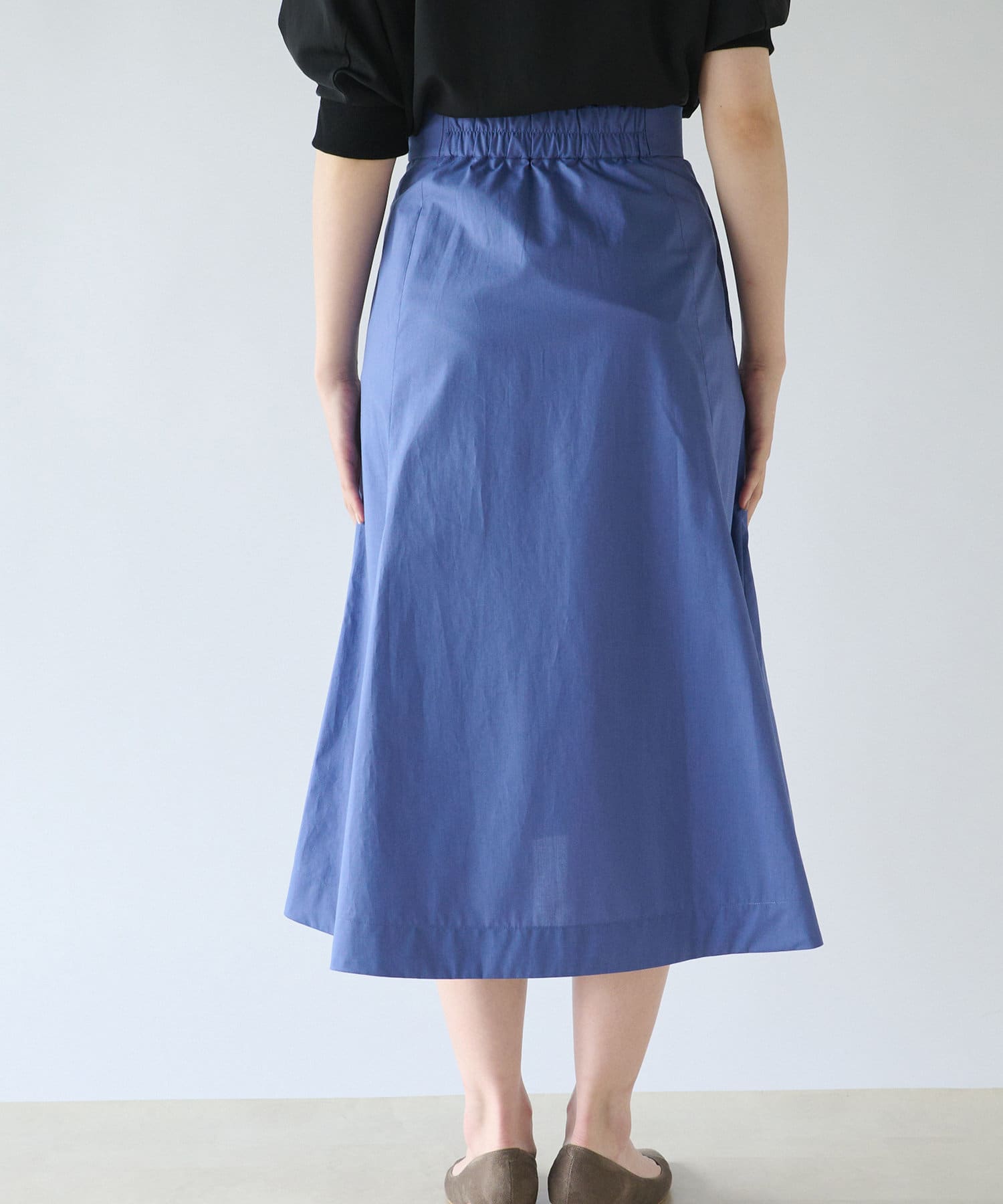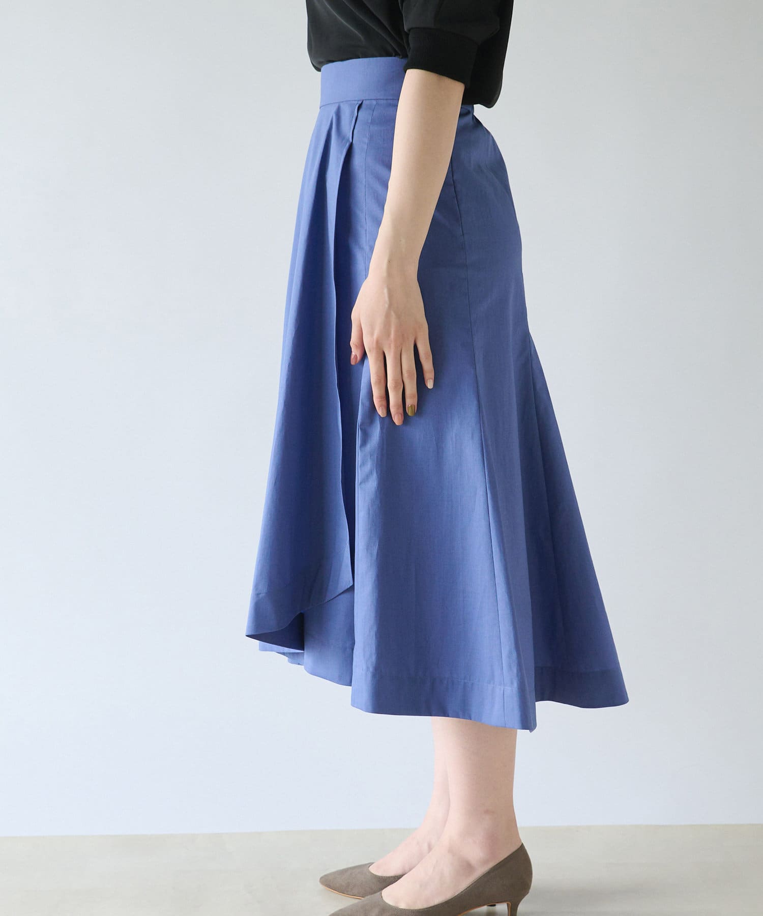 膝あたり位置からタックが入っており、生地をたっぷり使用しているのでふんわりと動きに合わせて揺れる裾もきれいで目を惹きます。