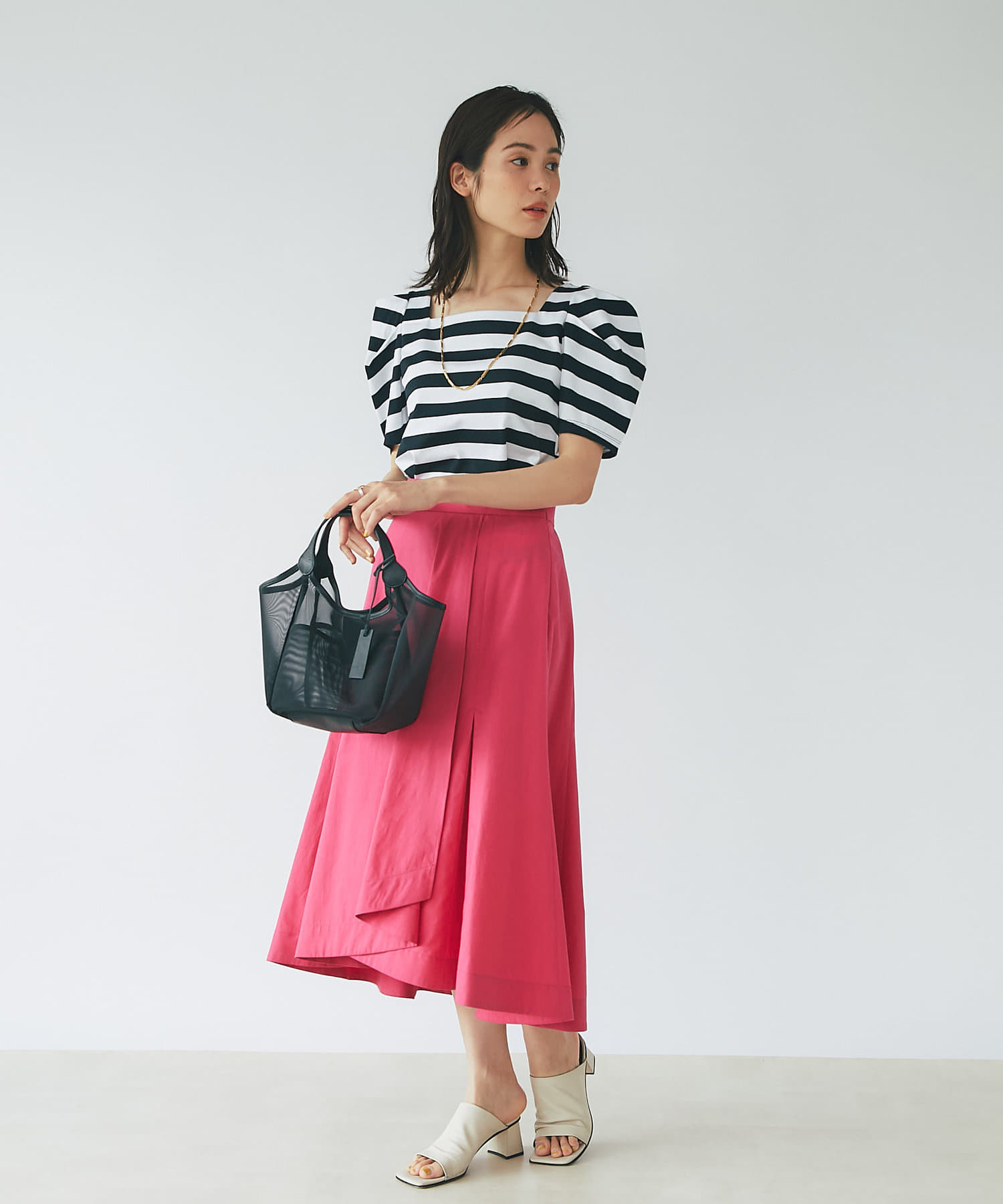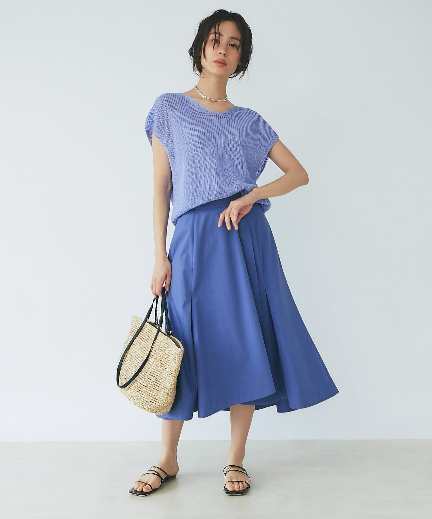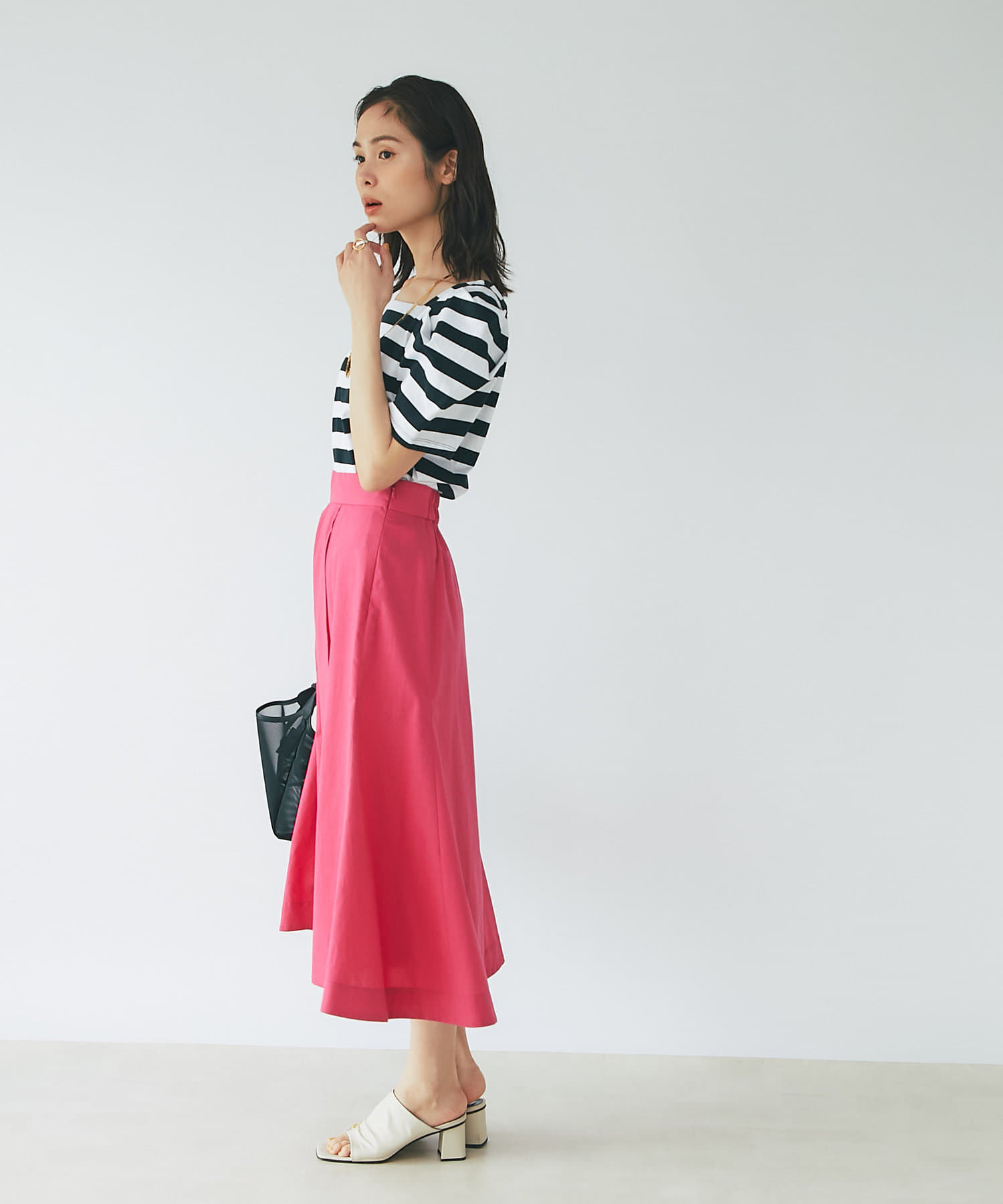 シンプルなスカートですが、イレヘムが女性らしいアイテムなのでニットやTシャツと合わせるだけでコーデが完成します。