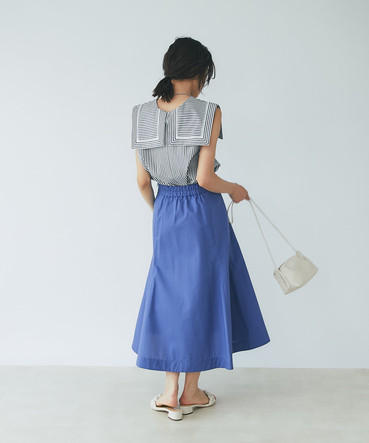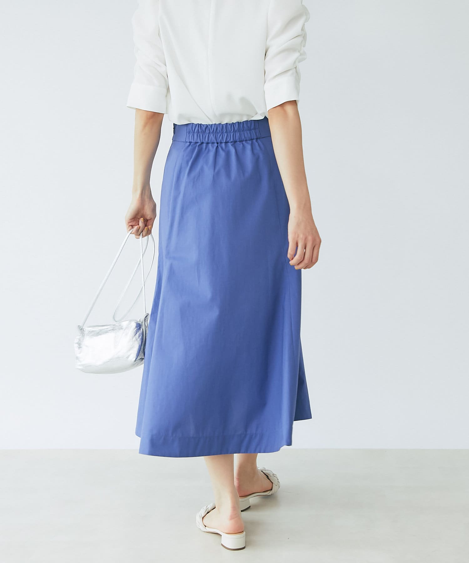 腰回りはすっきりとしたシルエットで、裾に向かって広がるマーメイドラインが美しい一枚です。