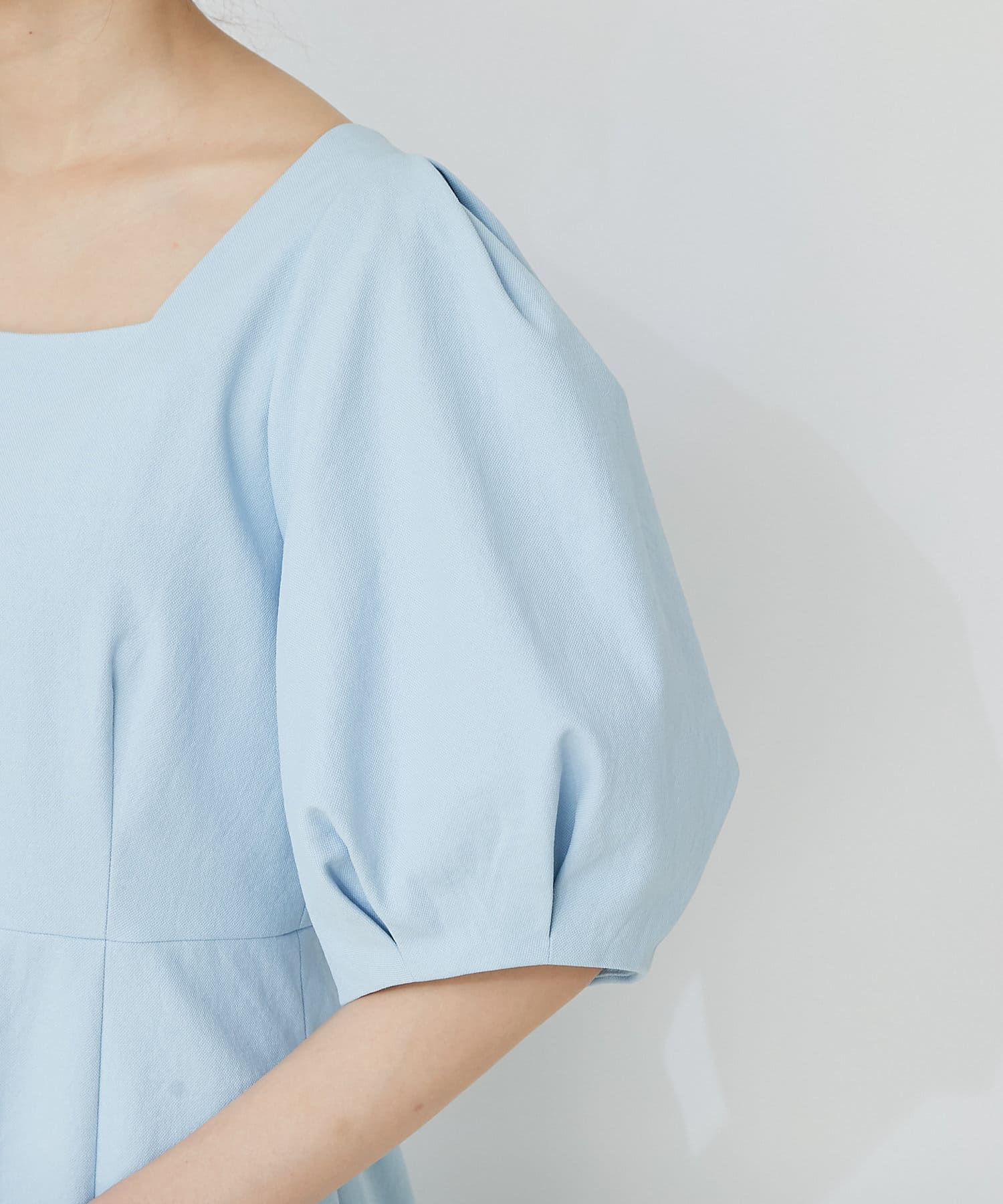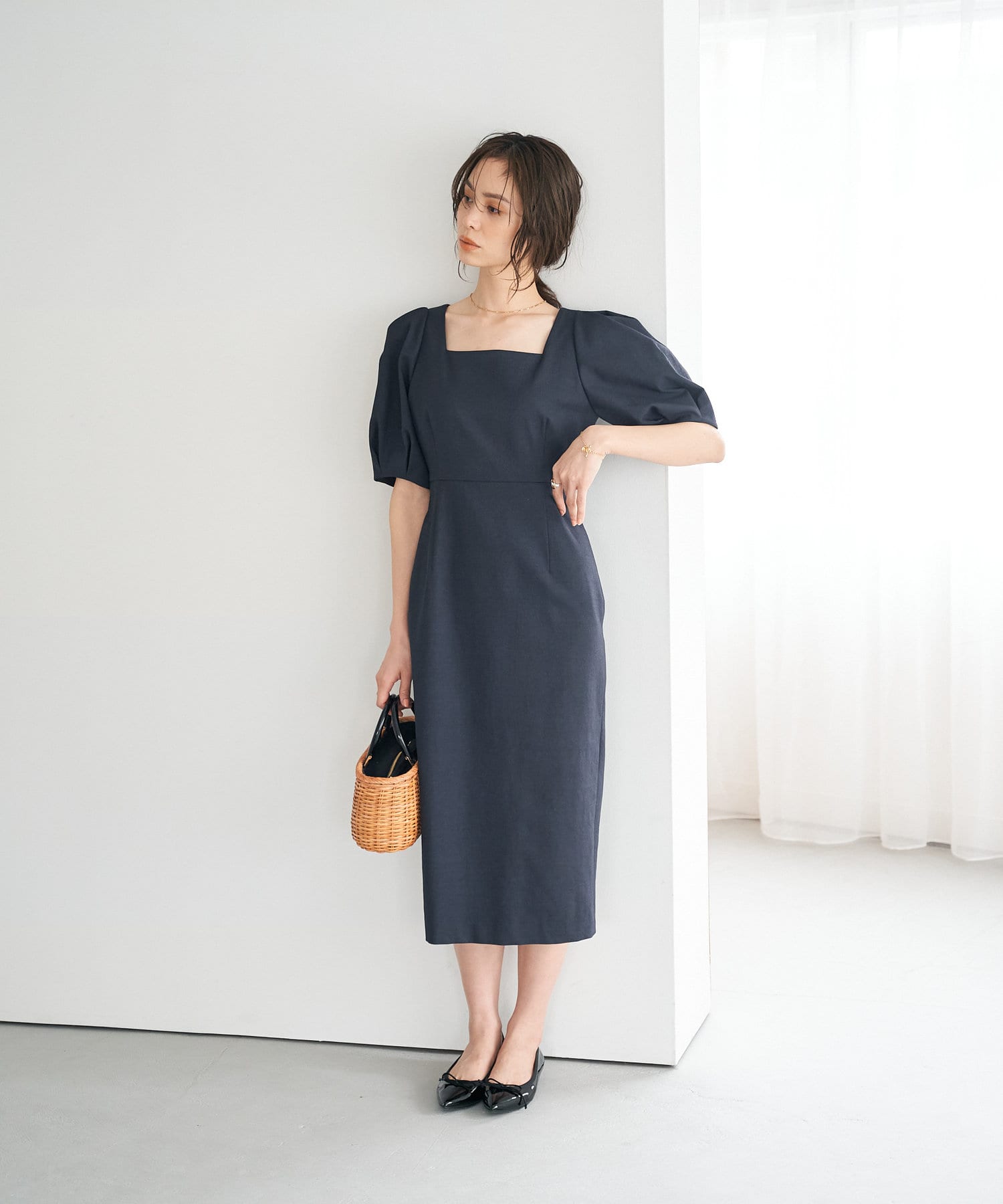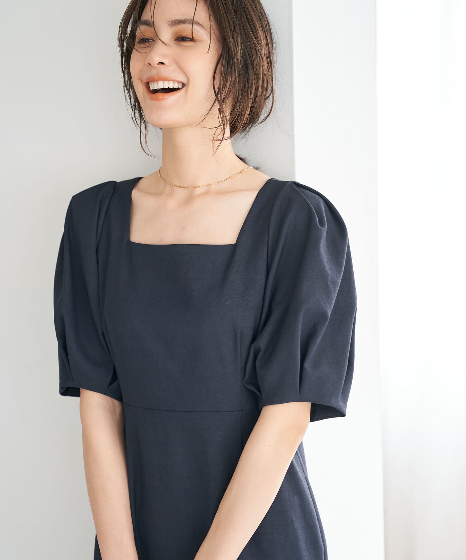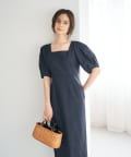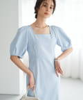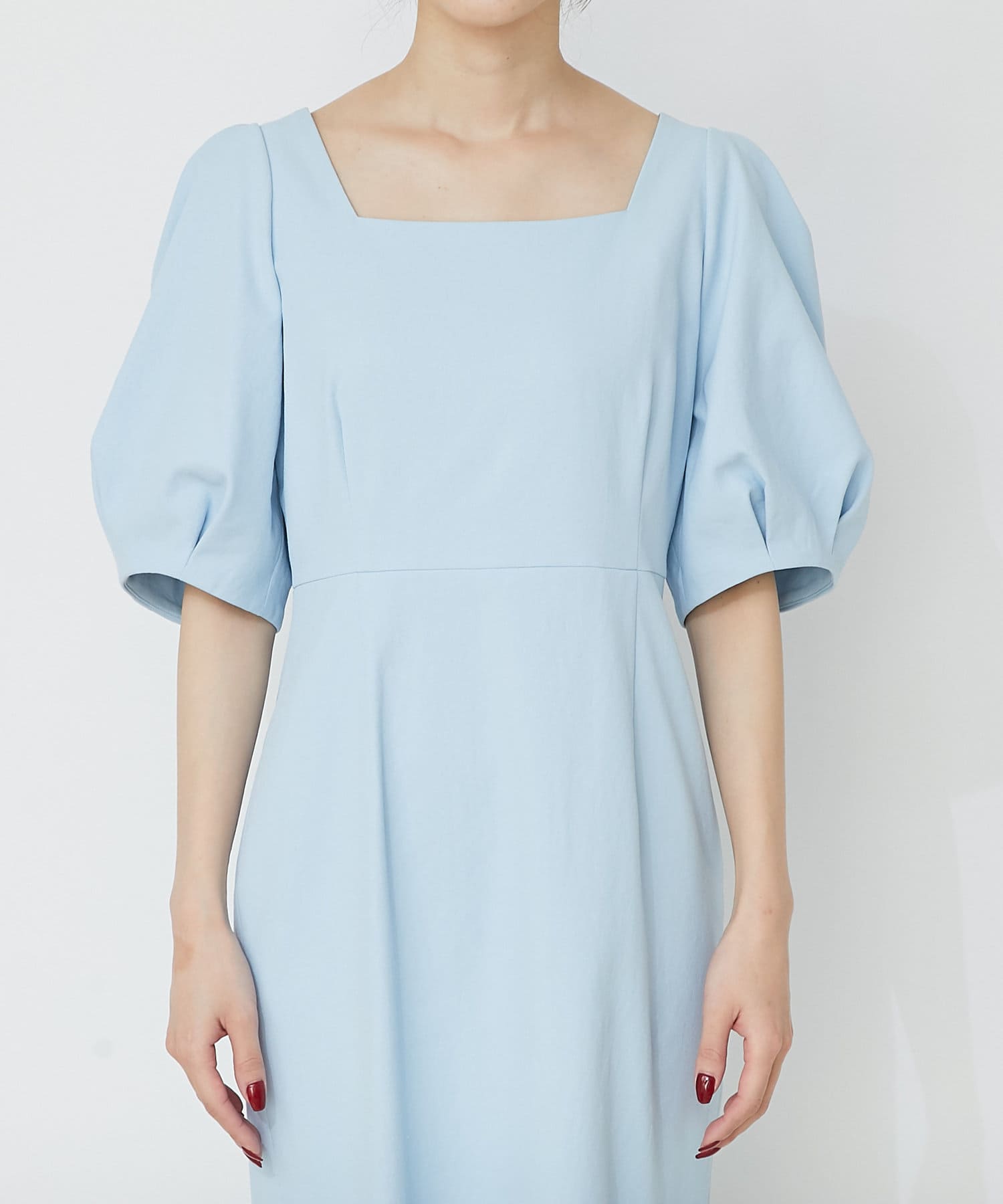 スクエアネックにボリュームスリーブのバランスが女らしい上品なワンピース。
