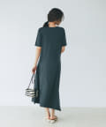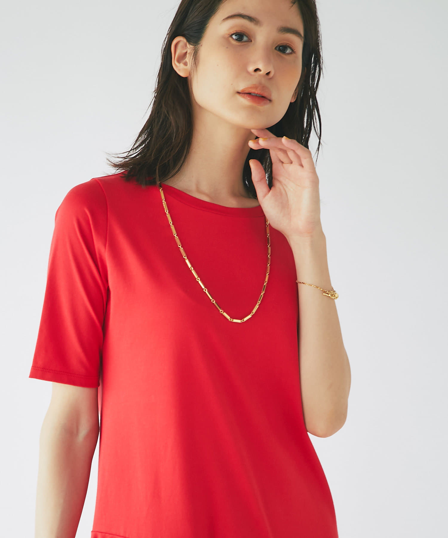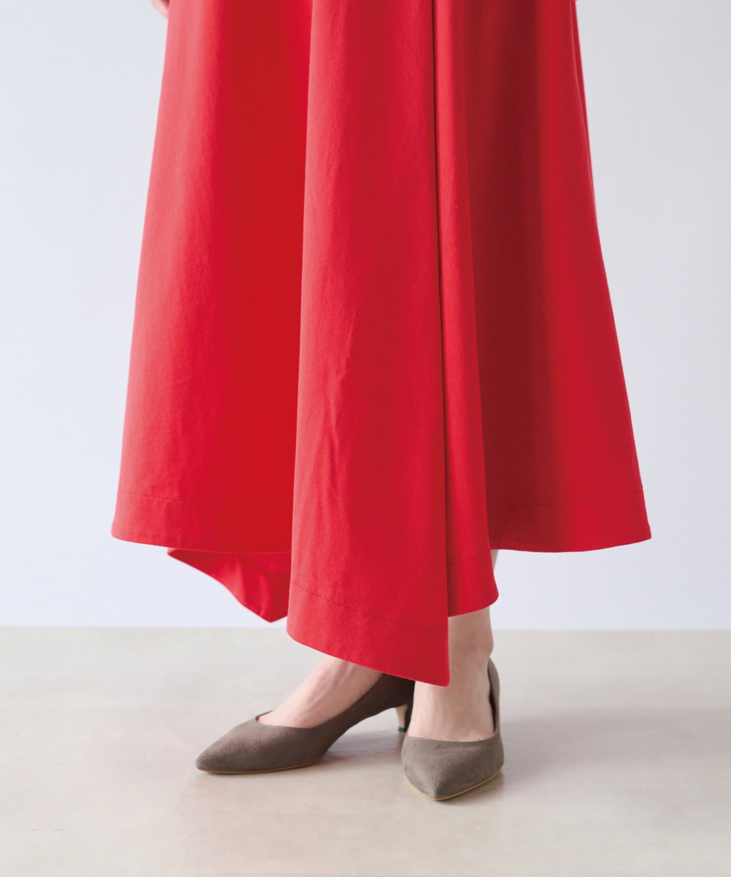 カットソー素材で楽な着心地ながら、マキシ丈のイレヘムカットのデザイン性が大人な雰囲気に。
