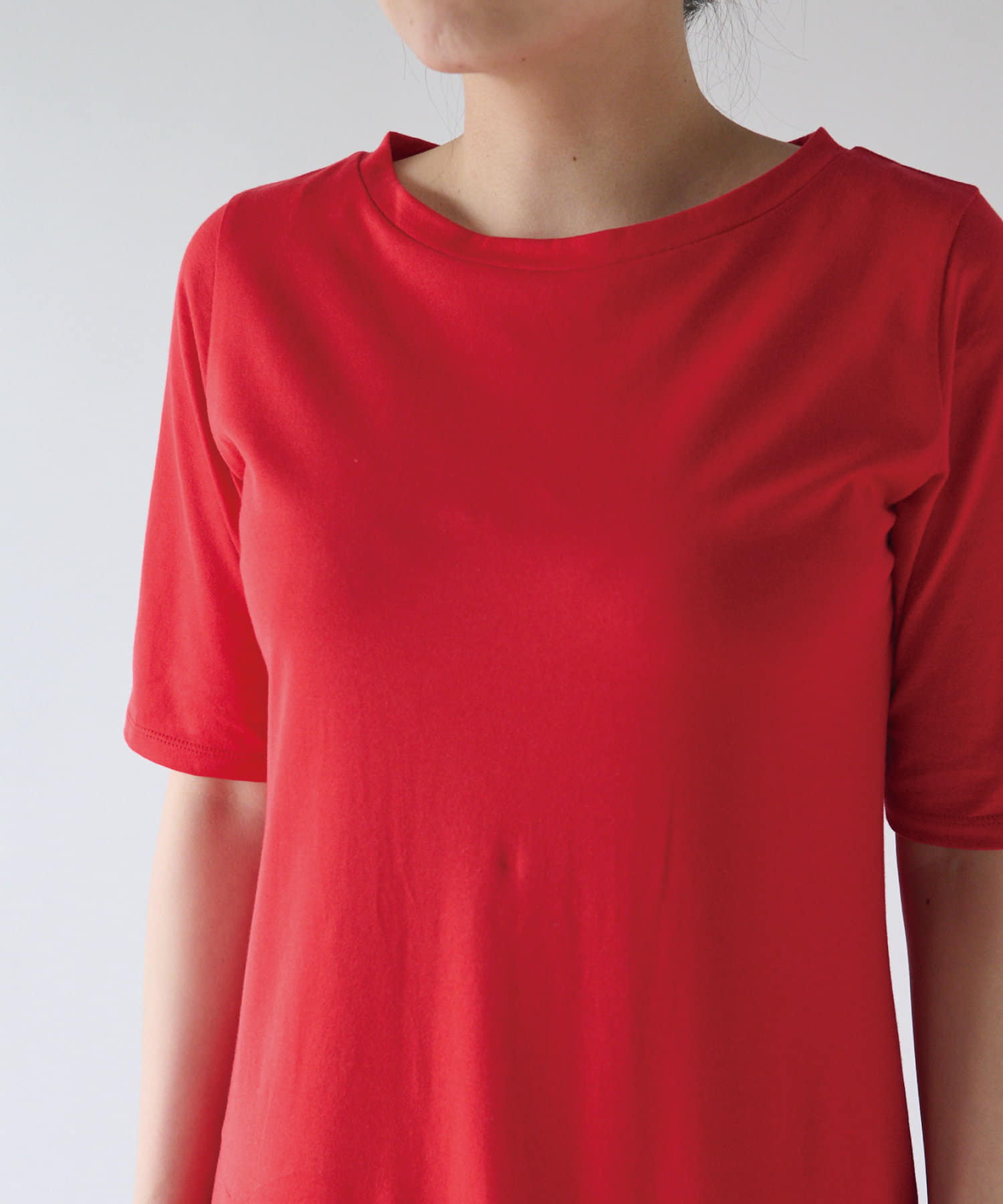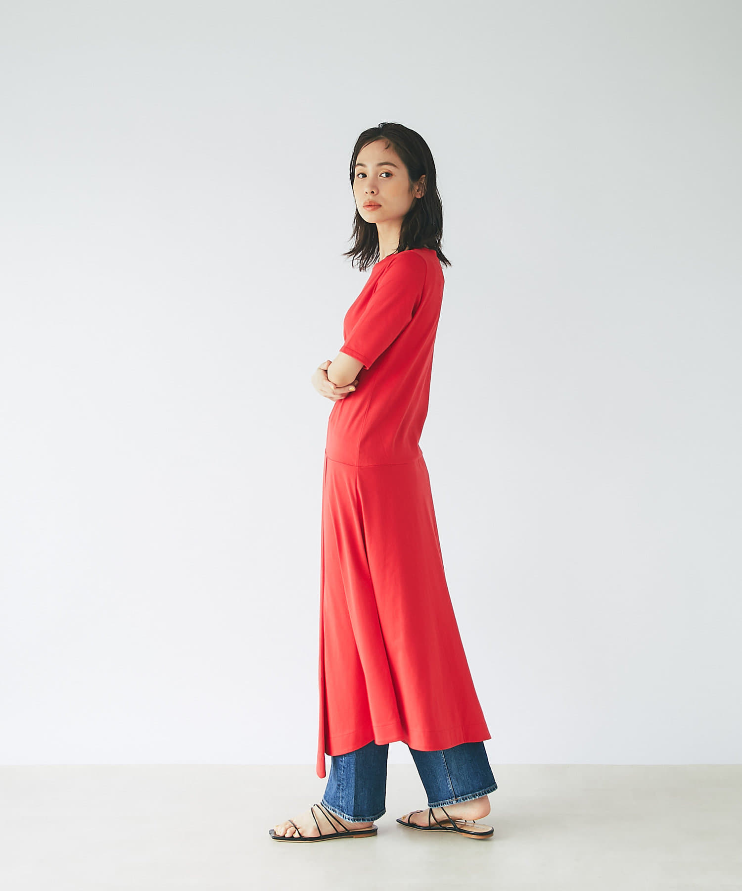 1枚でさらっと着られて楽なのに、ラインが綺麗で寸胴に見えないところが気に入っています。袖丈が長めなのも安心です。色も綺麗で、着ると元気になれる気がします。
