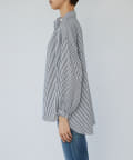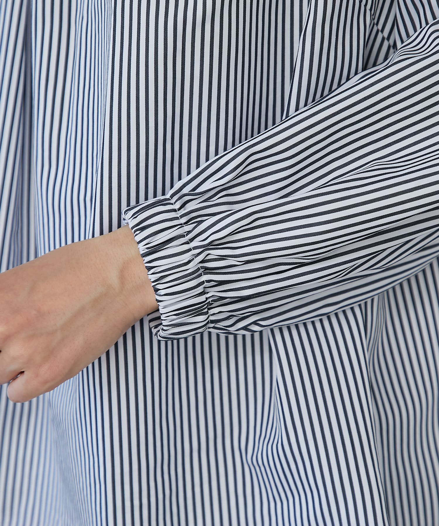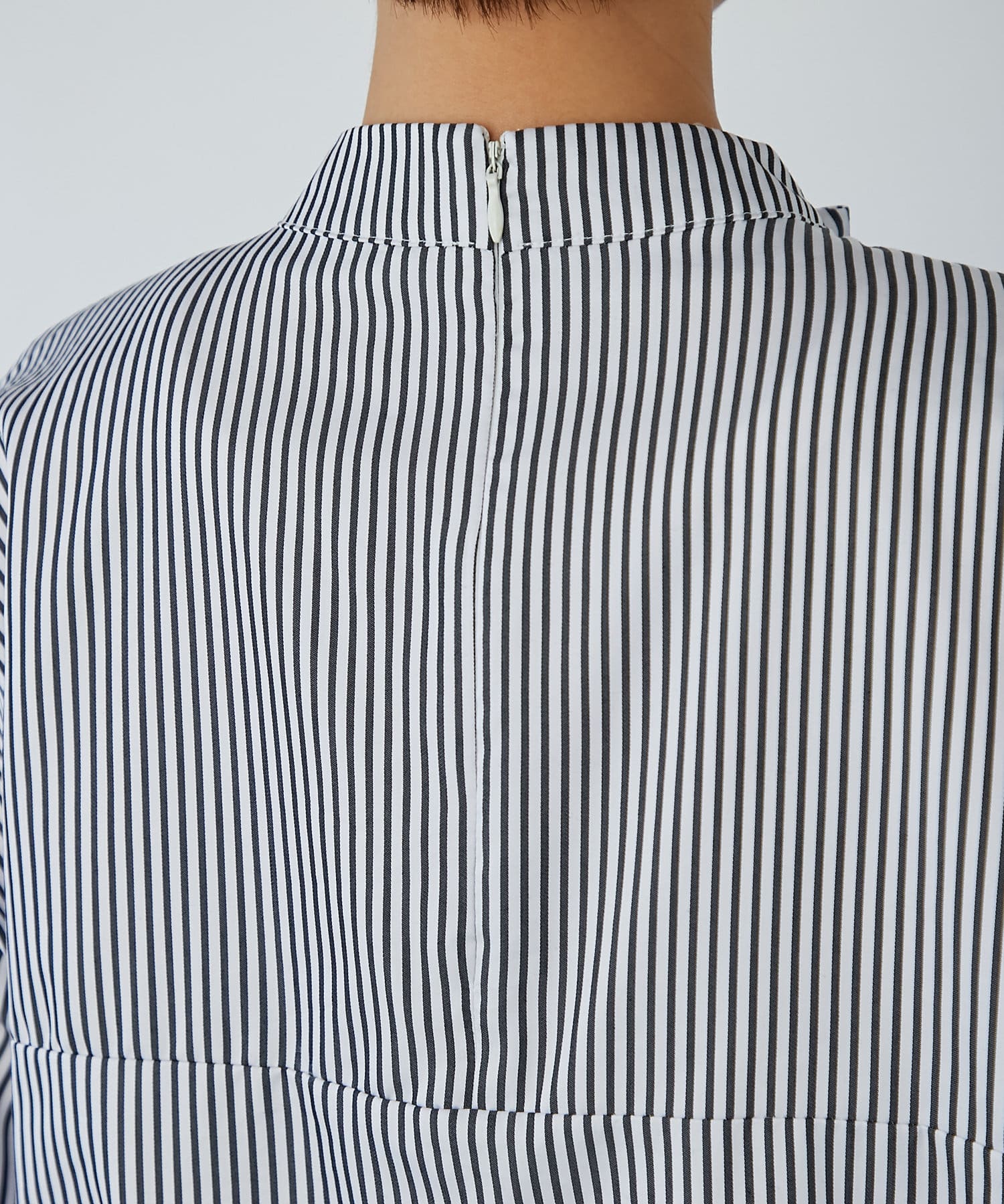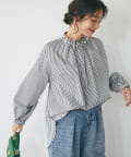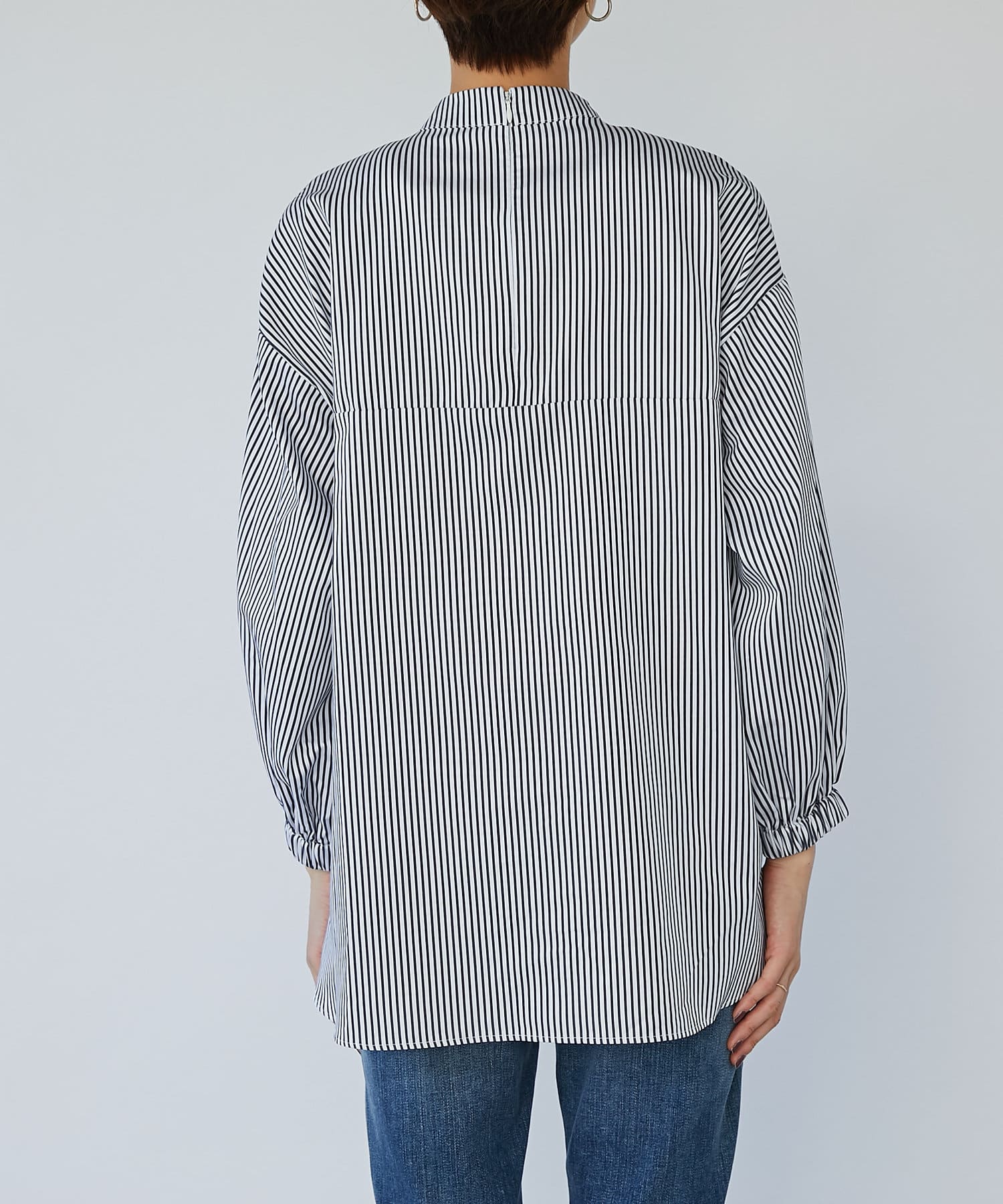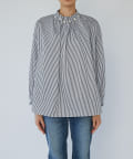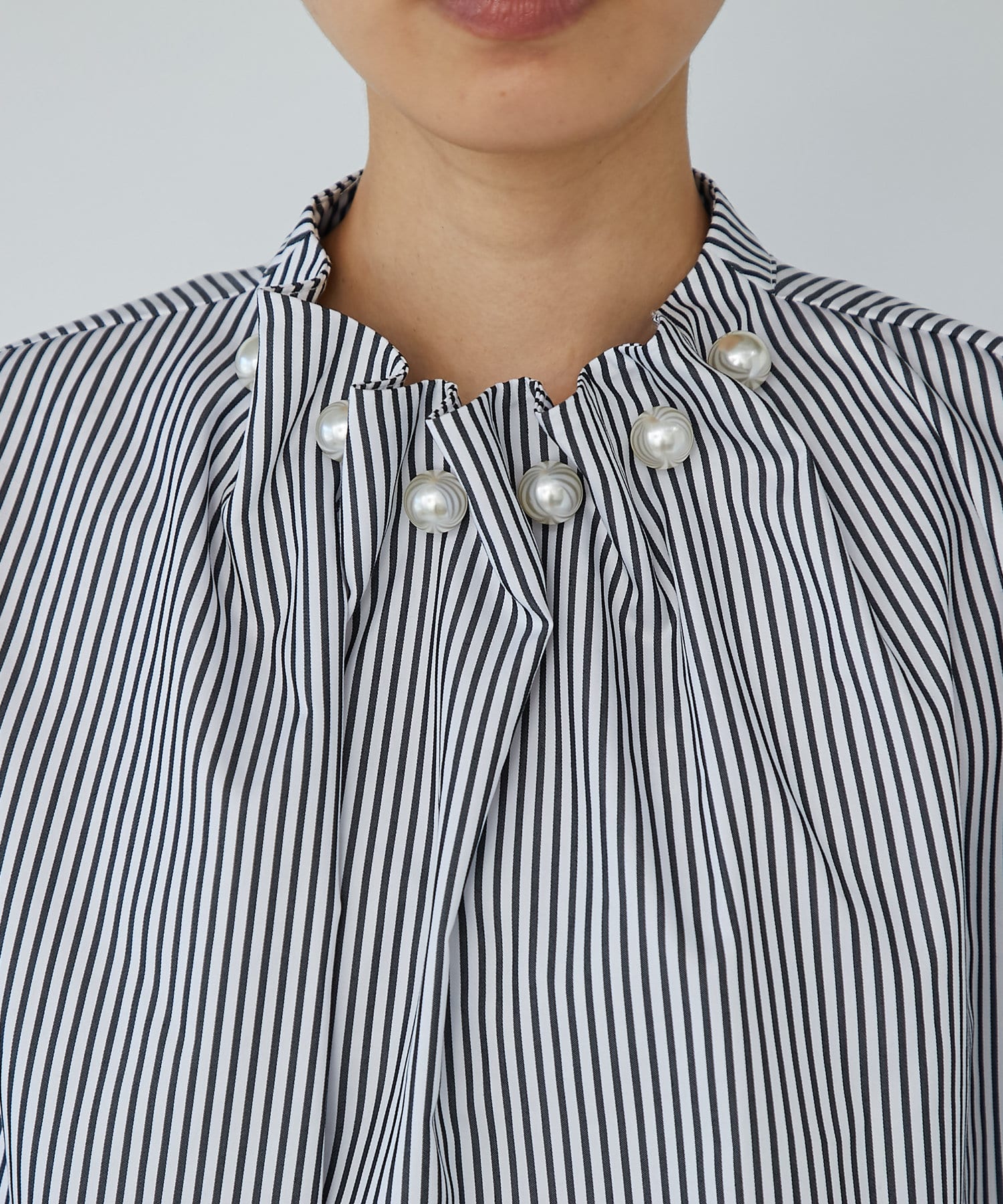 衿ぐりに施した大きめなパールと立体的なタックがデザインポイントのブラウス。