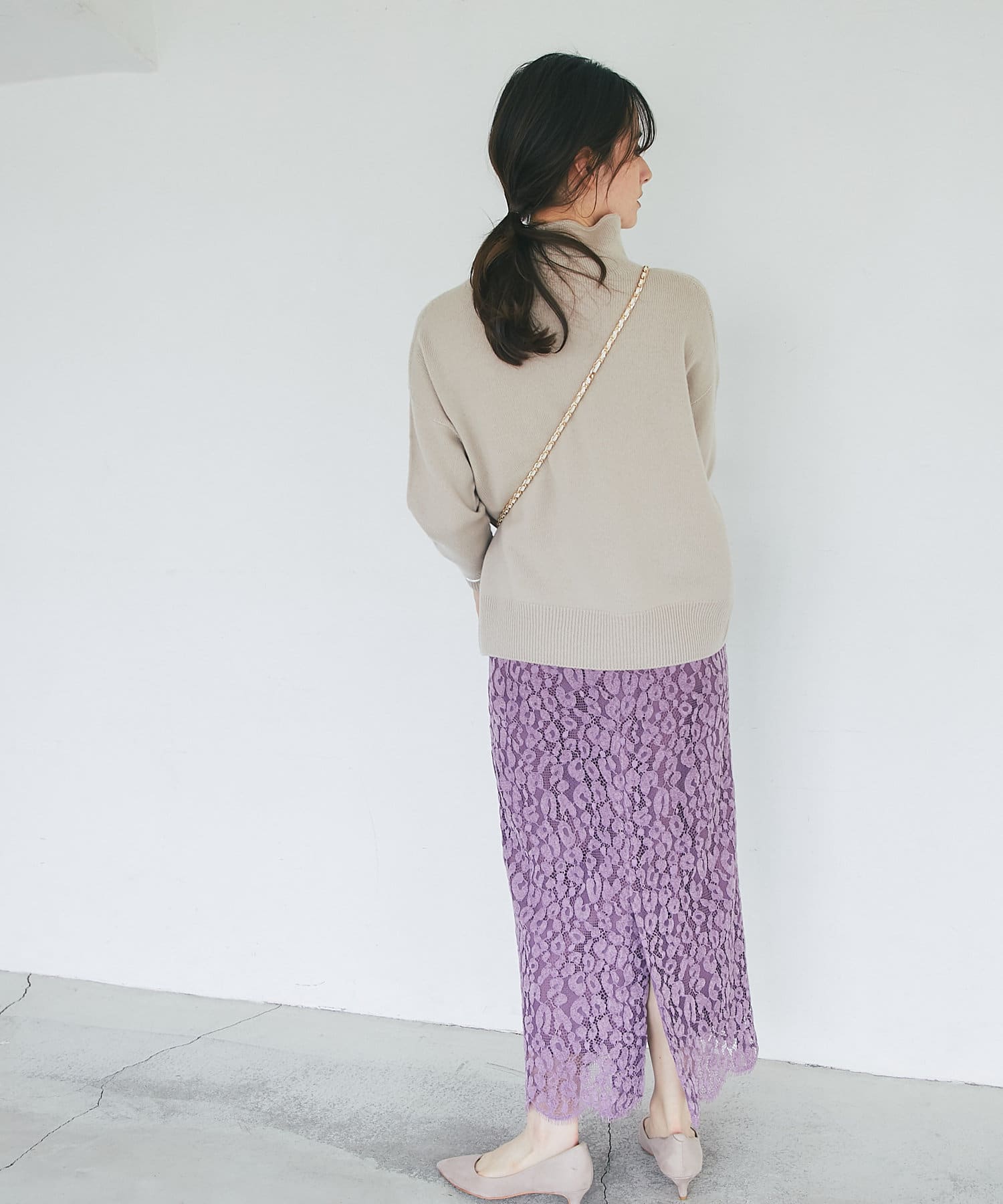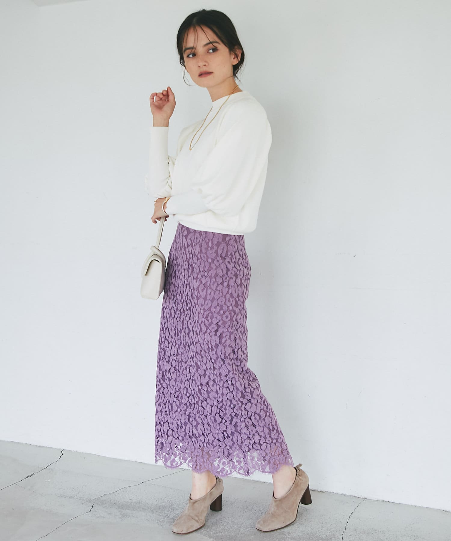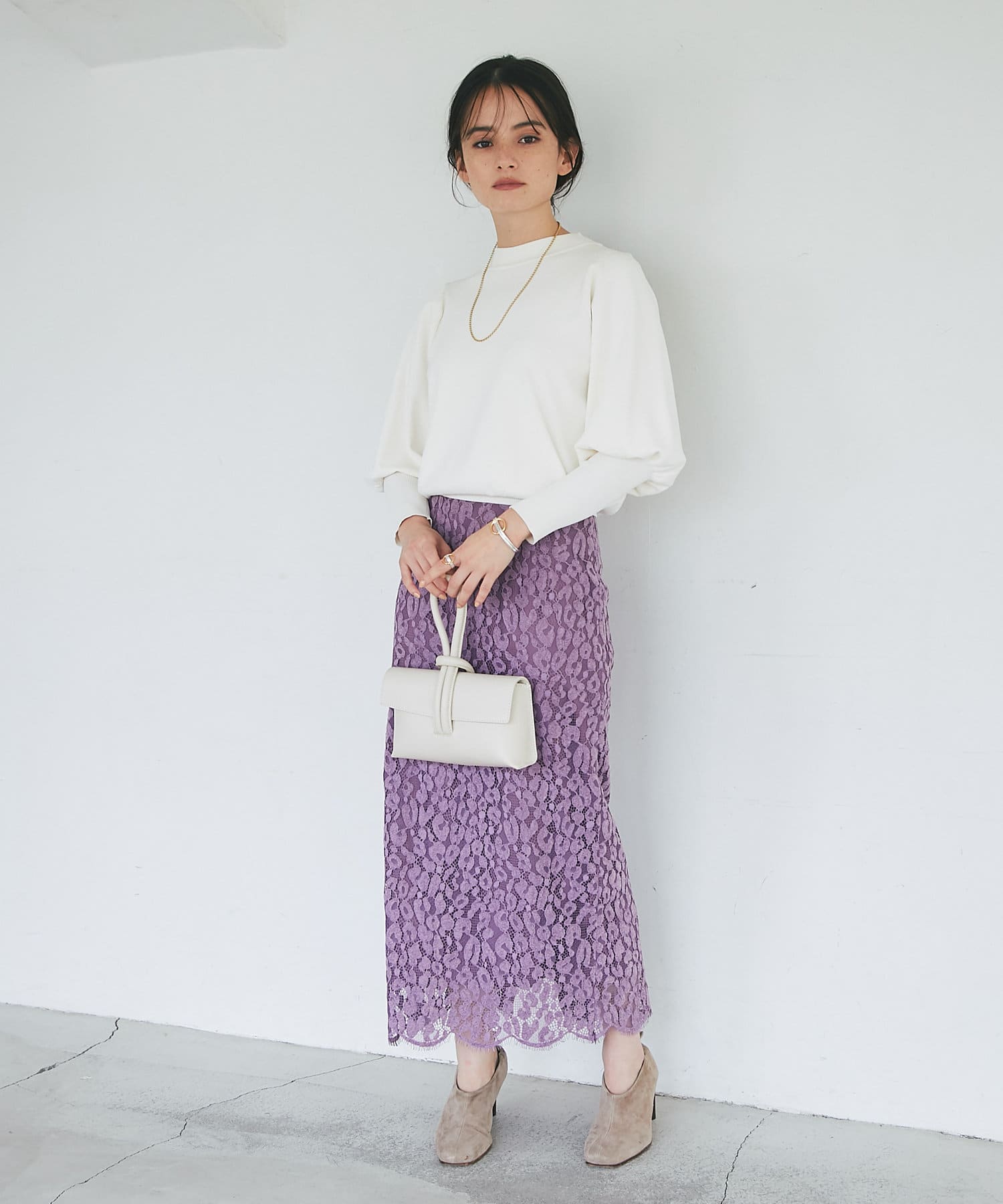 総レースで華やかなアイテムなので、シンプルなトップスを合わせるだけでコーディネートが完成。