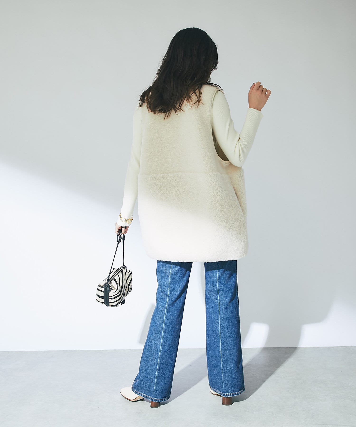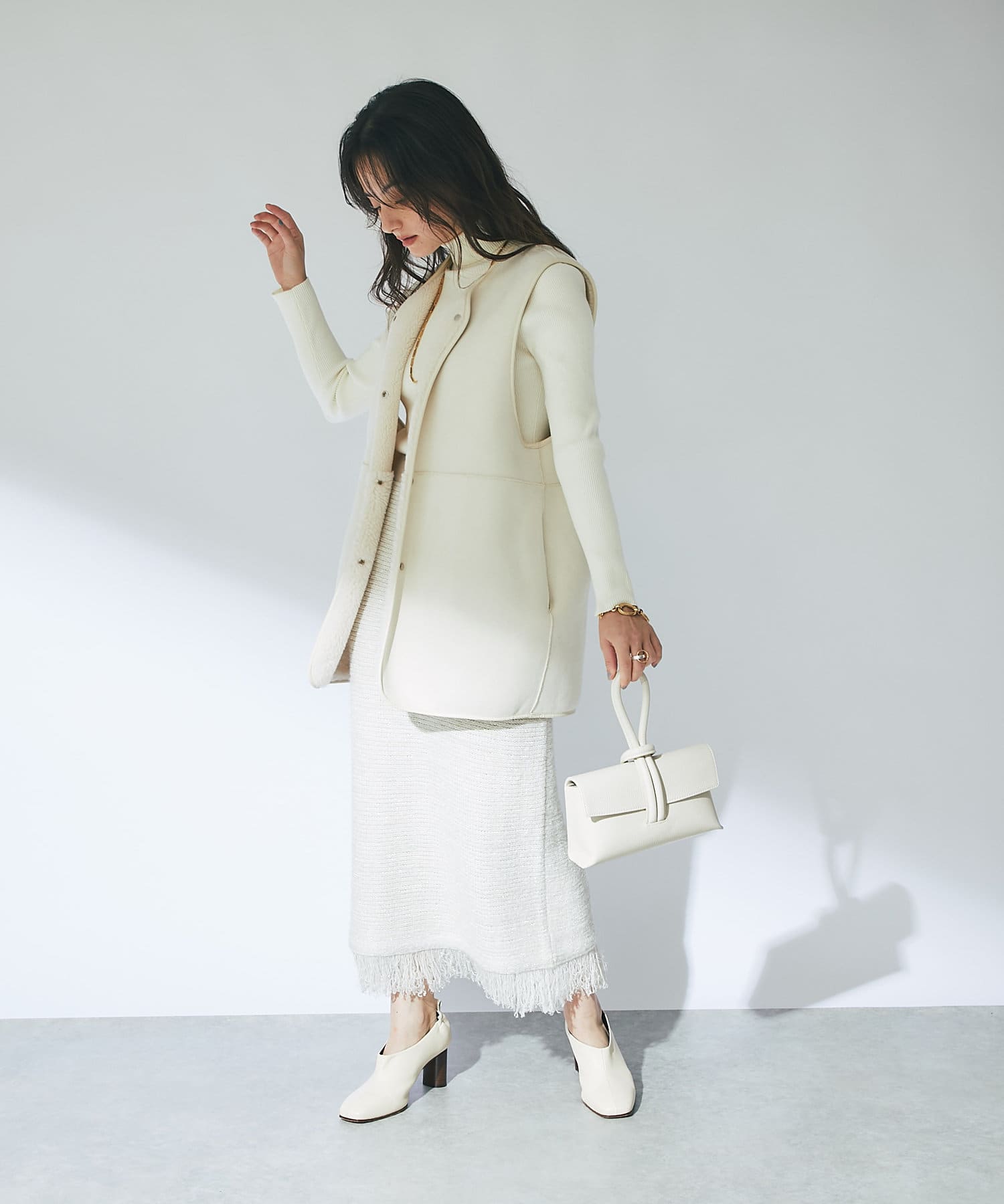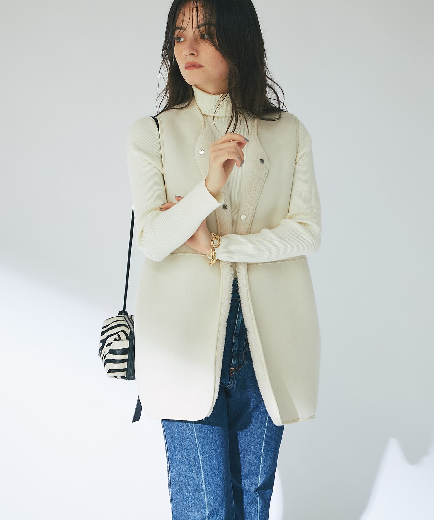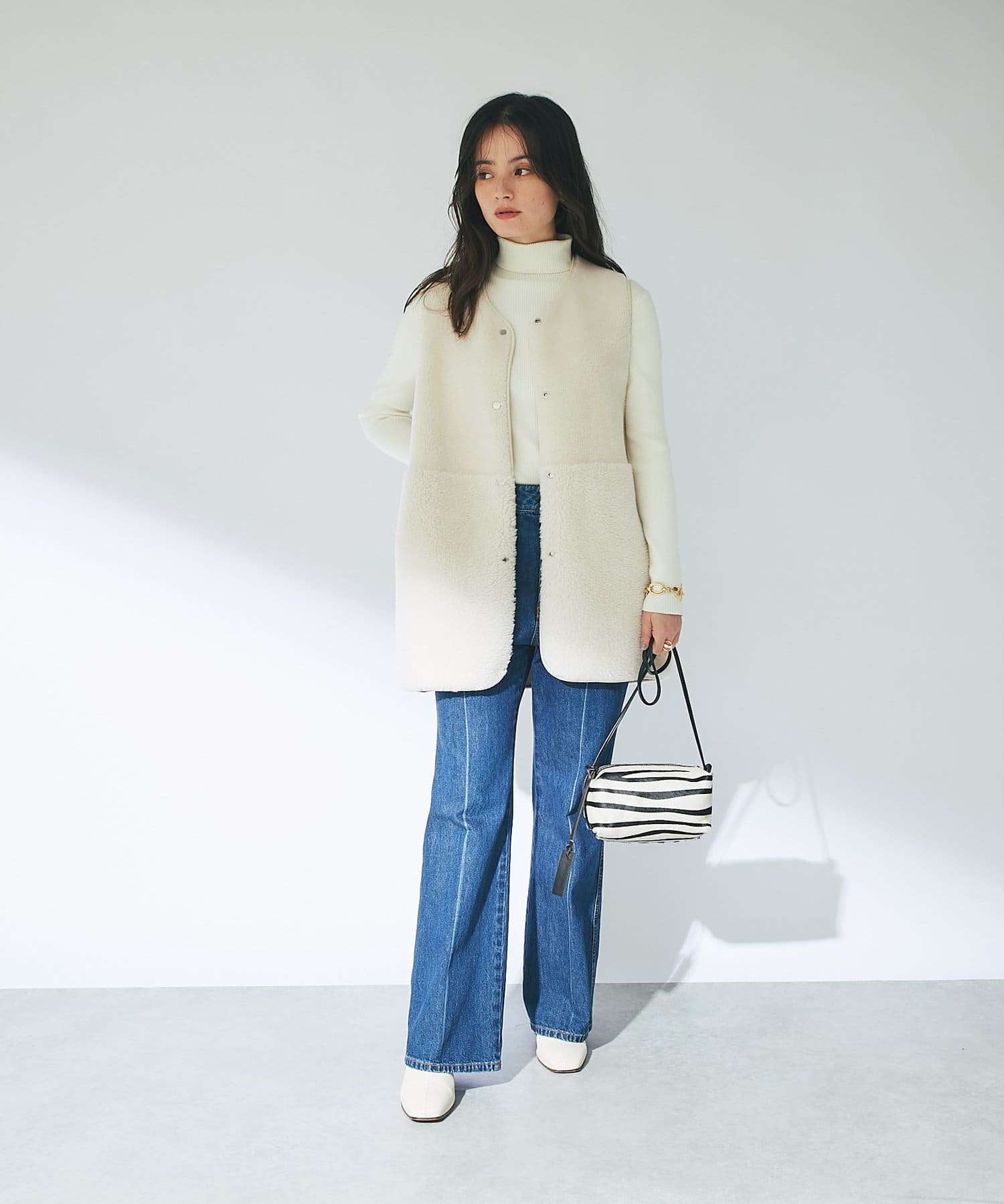 シンプルなアイテムも、ボアの素材がトレンド感のあるスタイリングに。