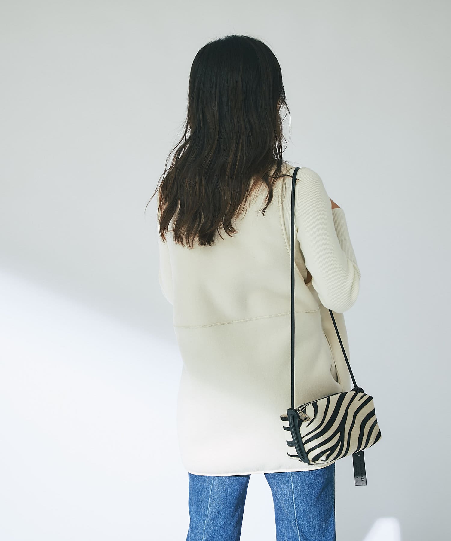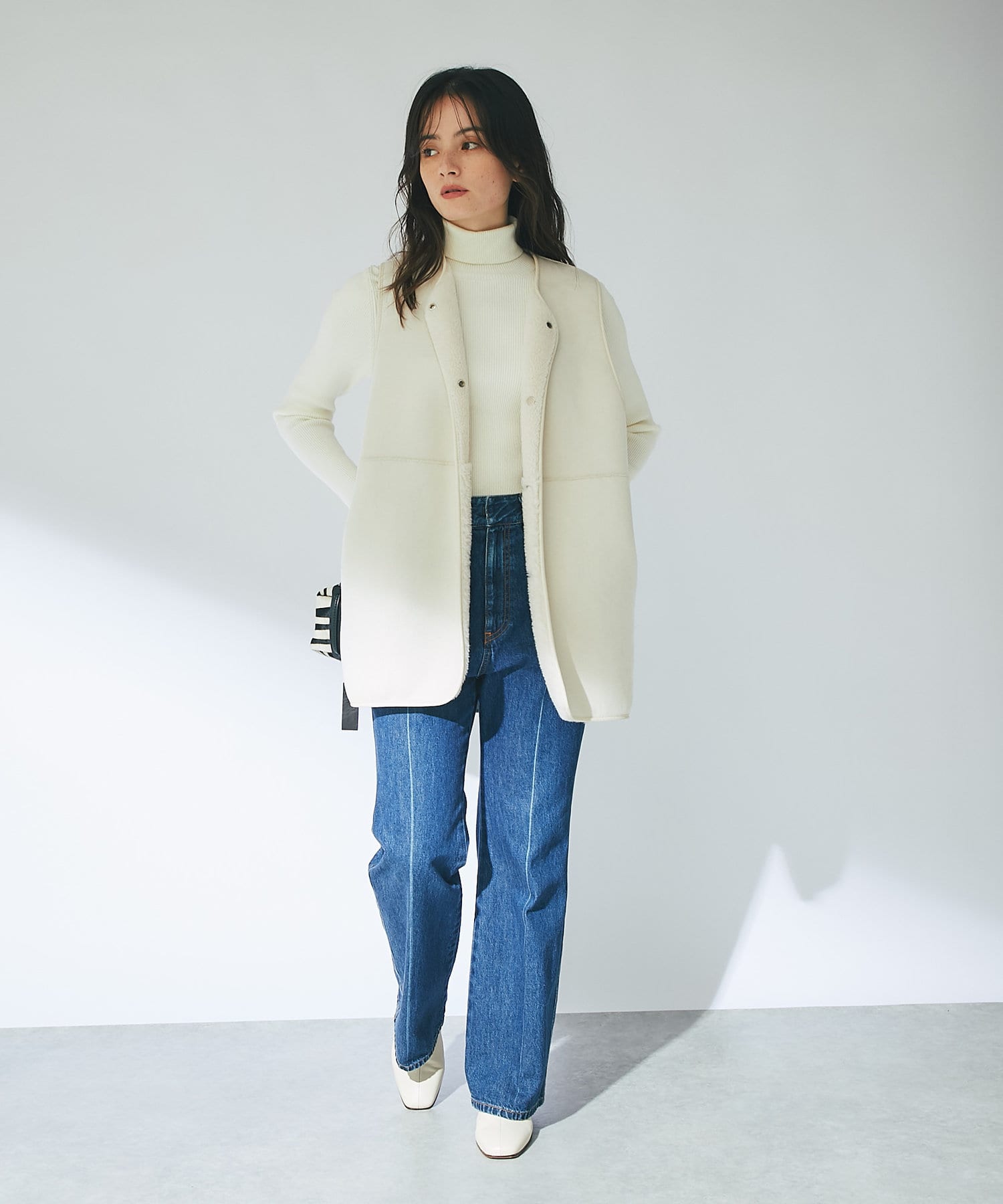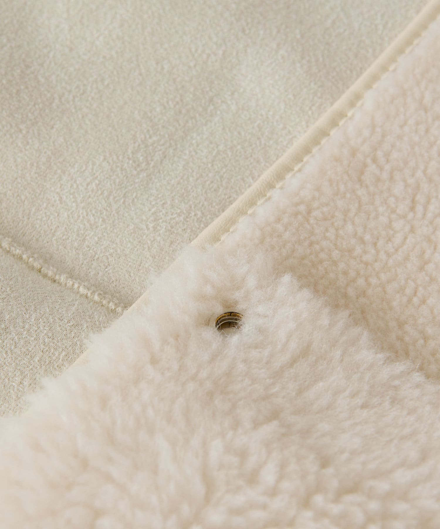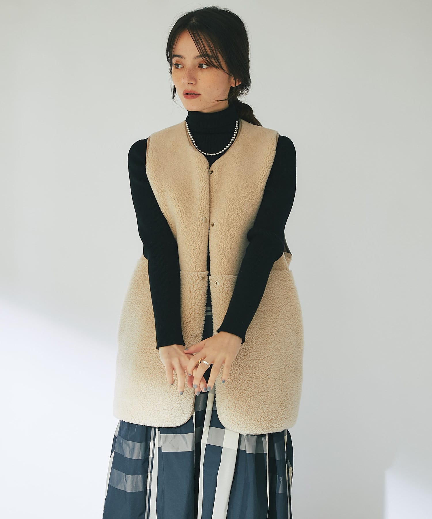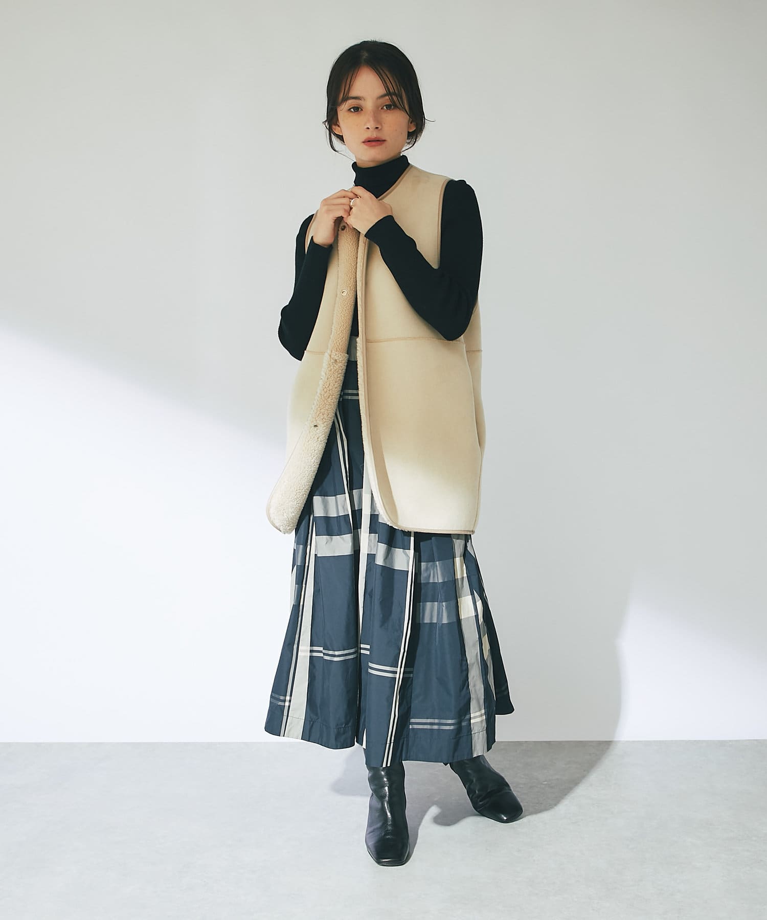 シンプルなアイテムも、ボアの素材がトレンド感のあるスタイリングに。