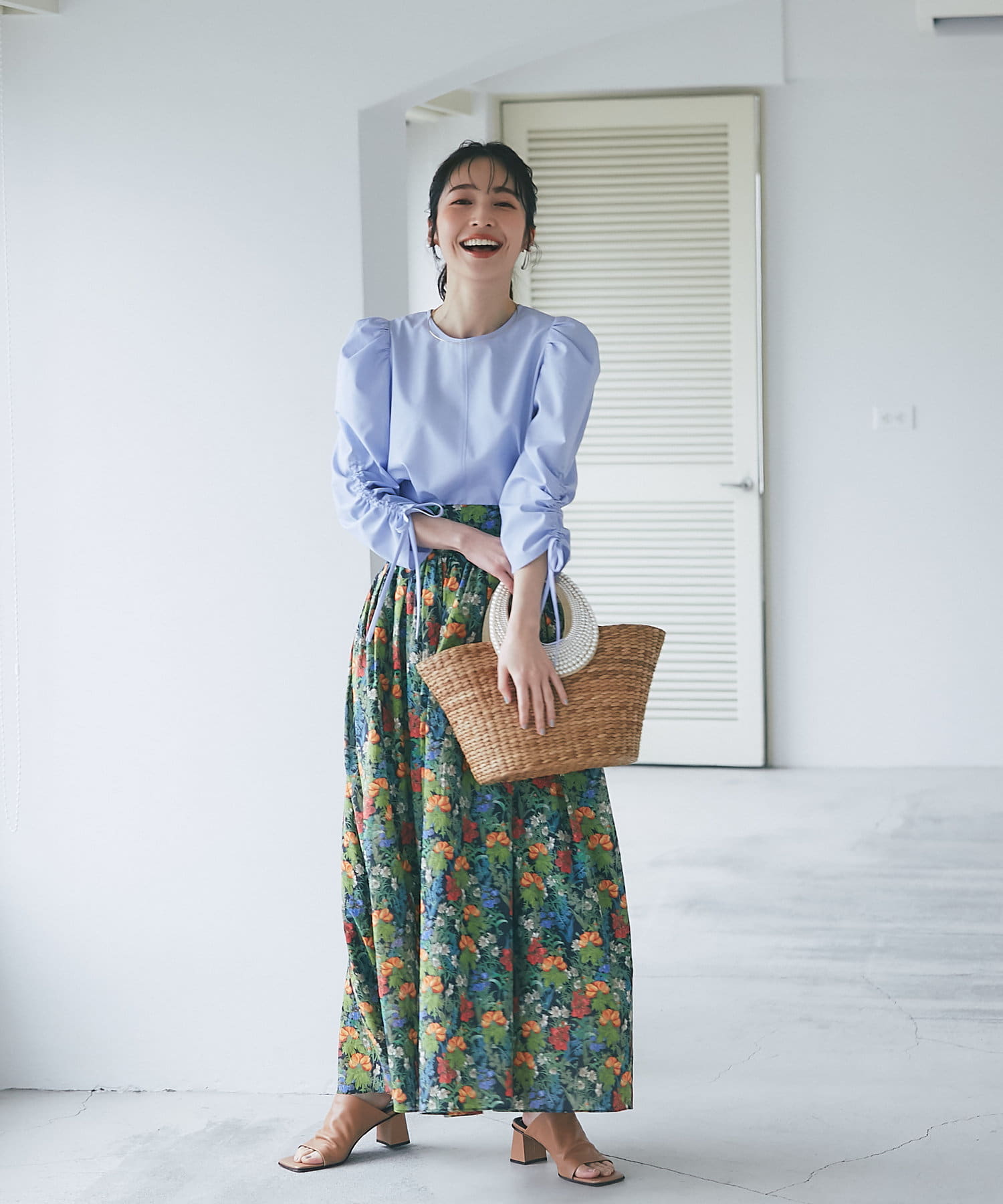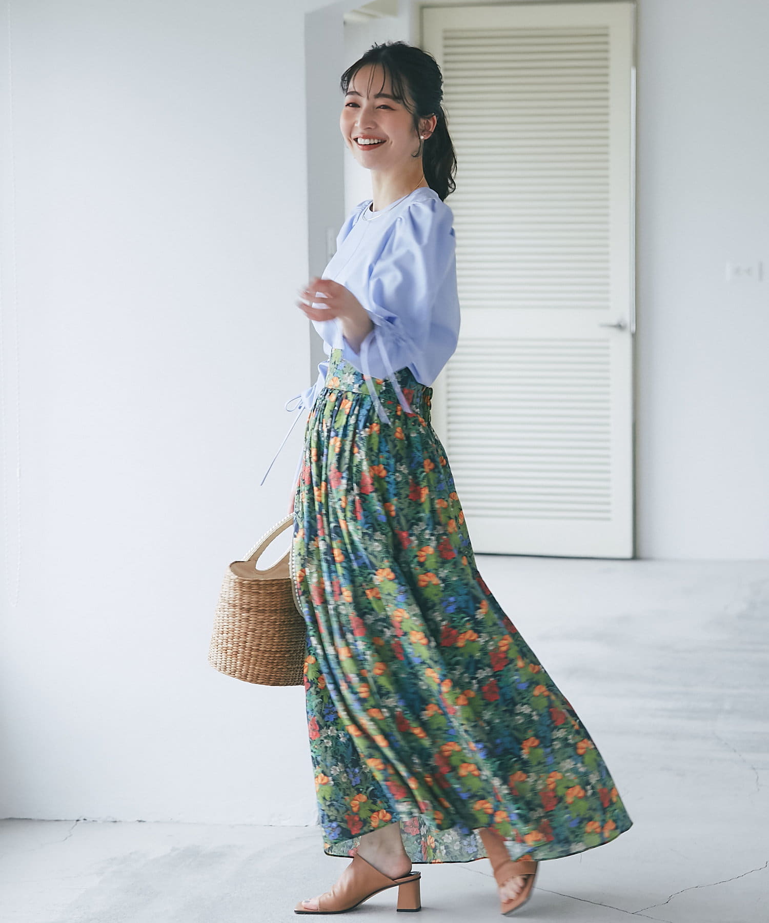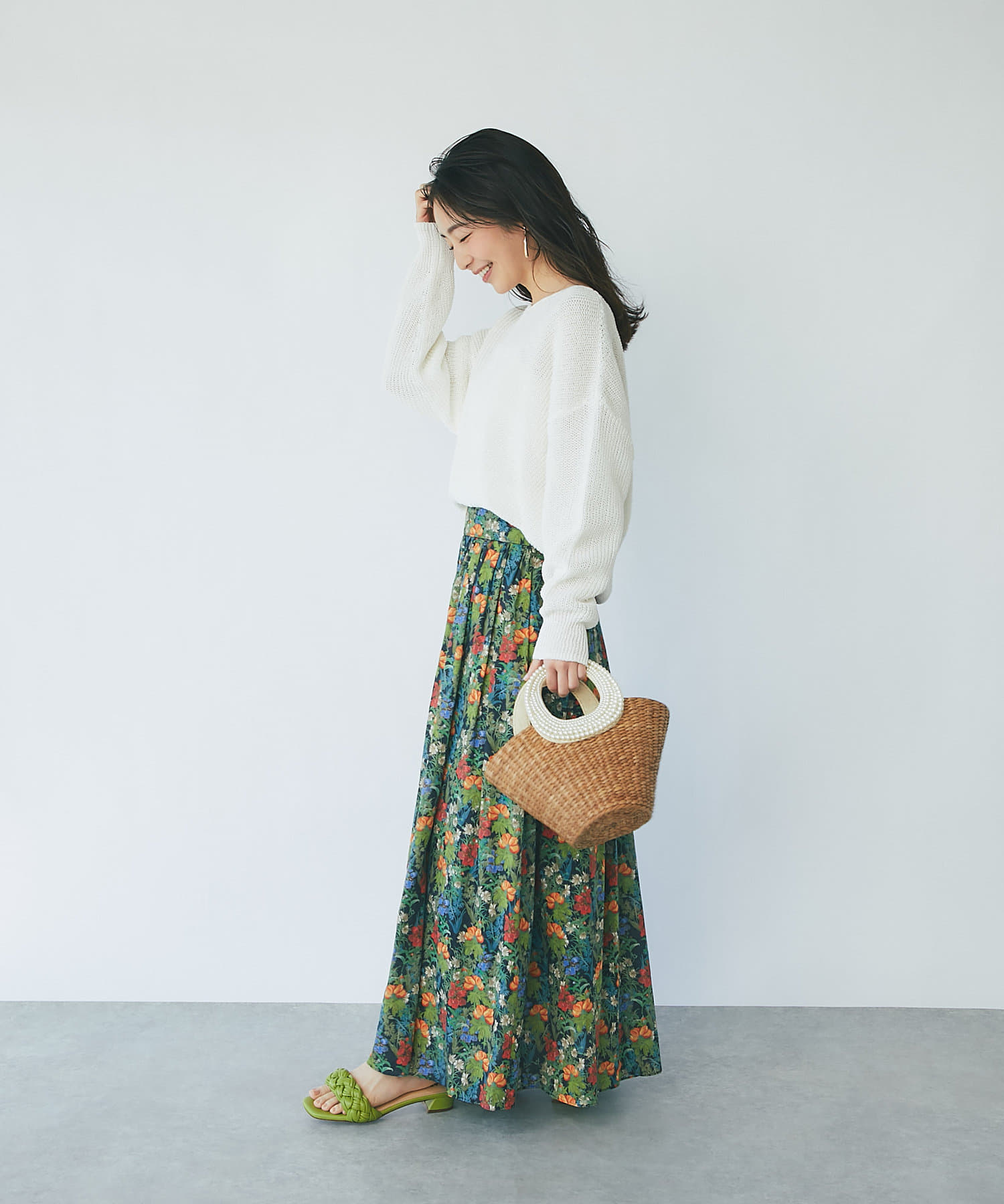 #大人カジュアル #きれいめカジュアル #上品カジュアル #大人女子 #大人可愛い #フラワープリント #花柄 #総柄 #ボタニカル #ギャザースカート #ロングスカート