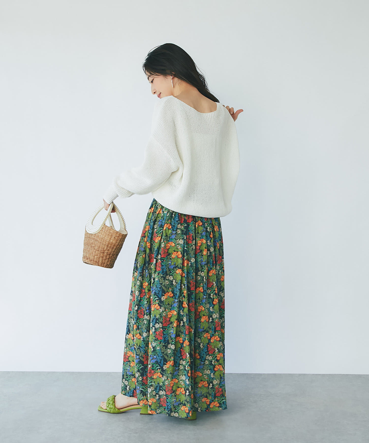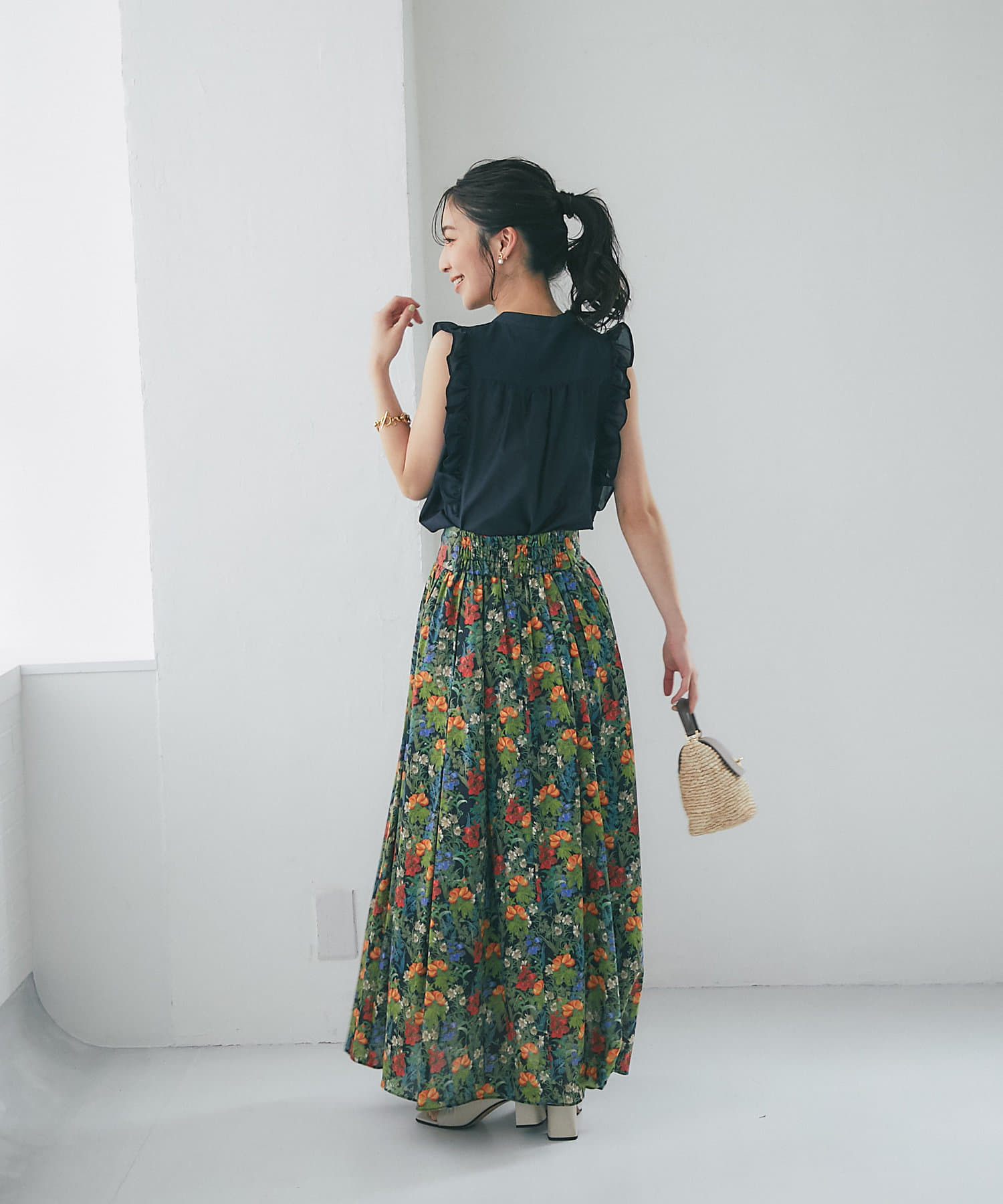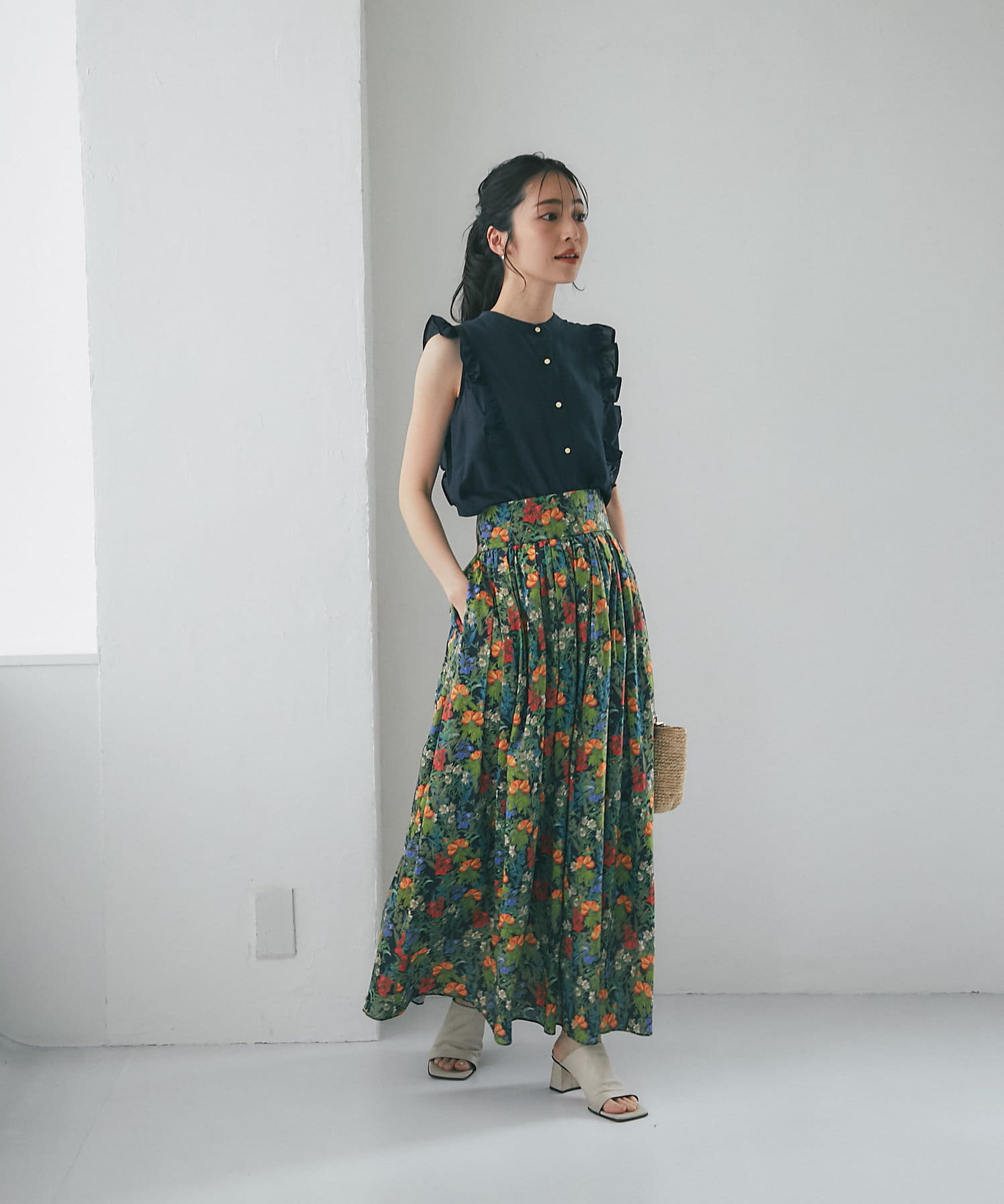#大人カジュアル #きれいめカジュアル #上品カジュアル #大人女子 #大人可愛い #フラワープリント #花柄 #総柄 #ボタニカル #ギャザースカート #ロングスカート
