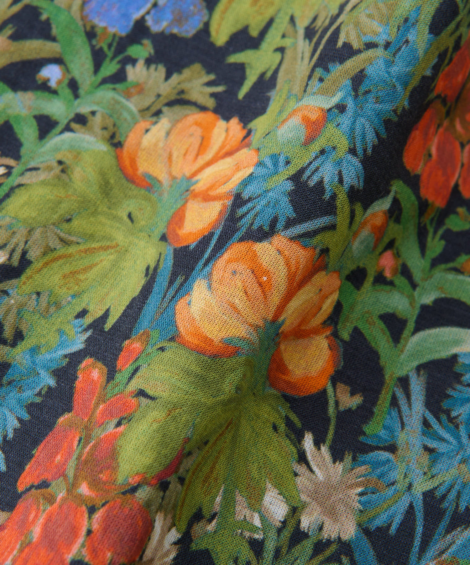 薄くて柔らかなハリのあるコットンボイル素材にのせた華やかなボタニカルプリントを使用。