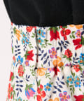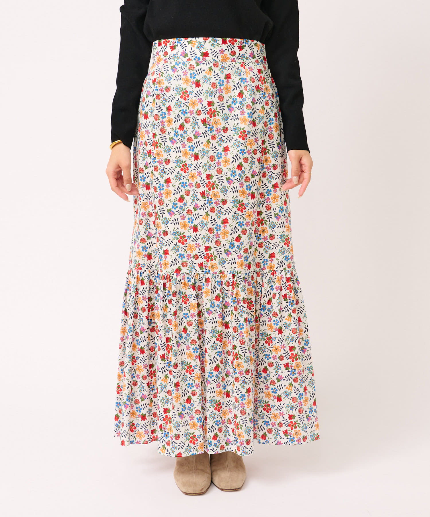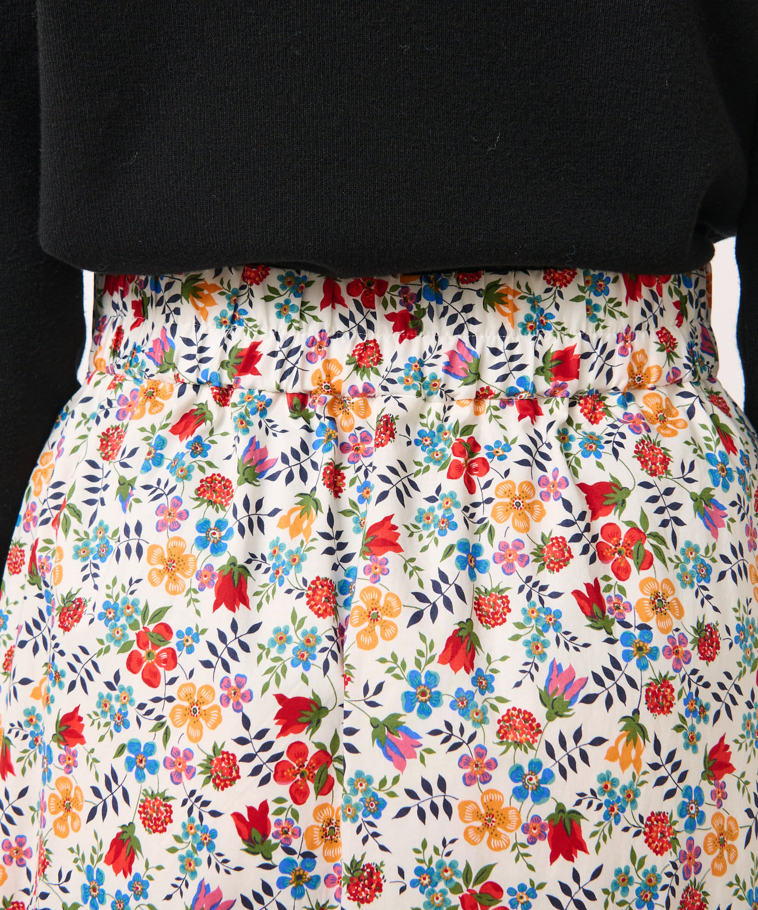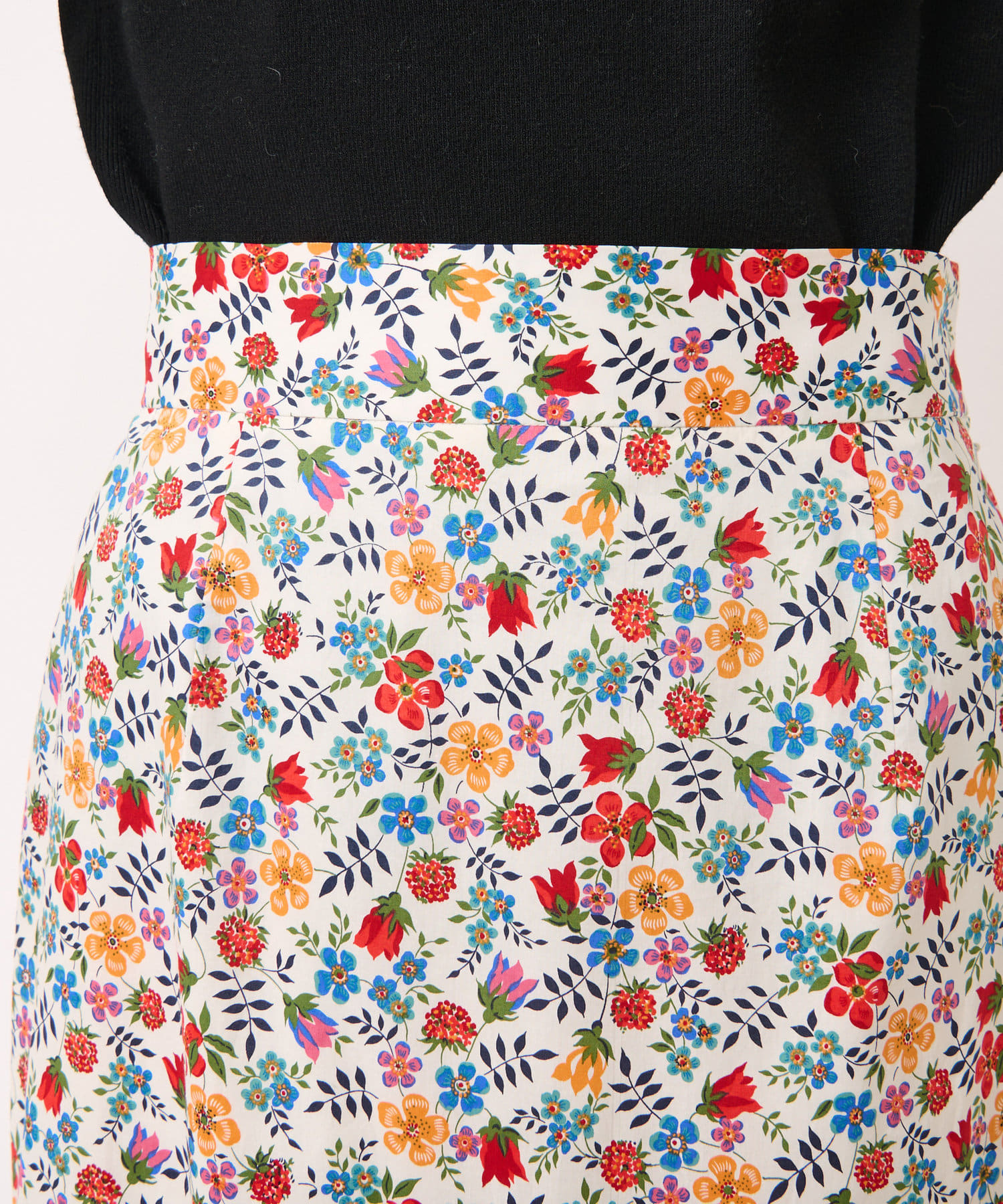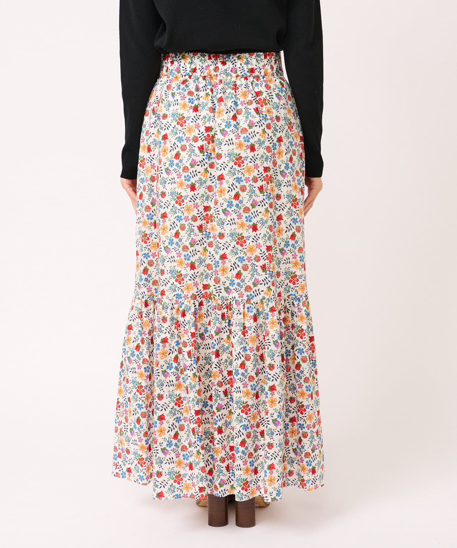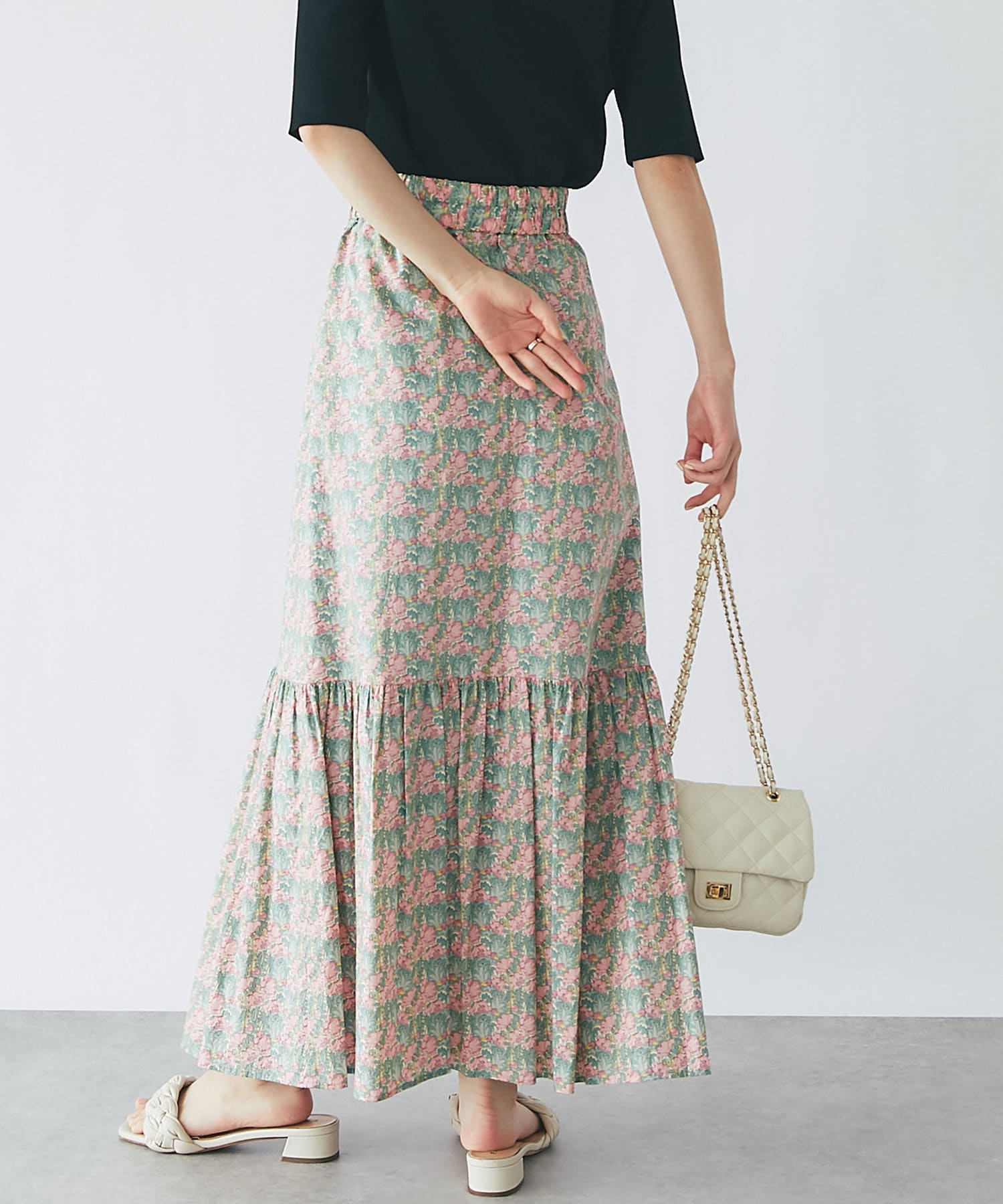 イギリスのリバティ社のプリント生地をたっぷり使用した贅沢な一枚で、膝下切り替えのティアードスカートになっています。