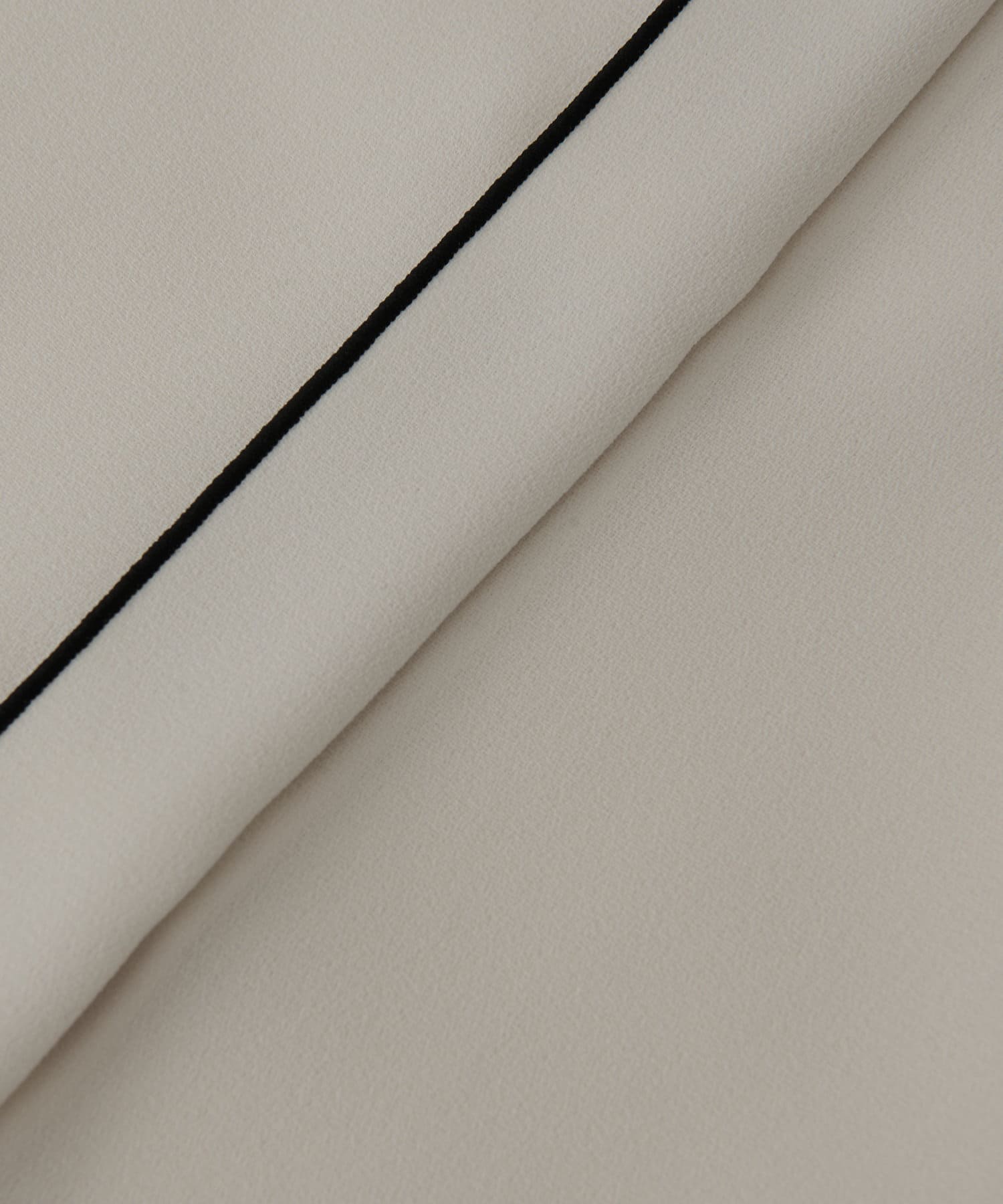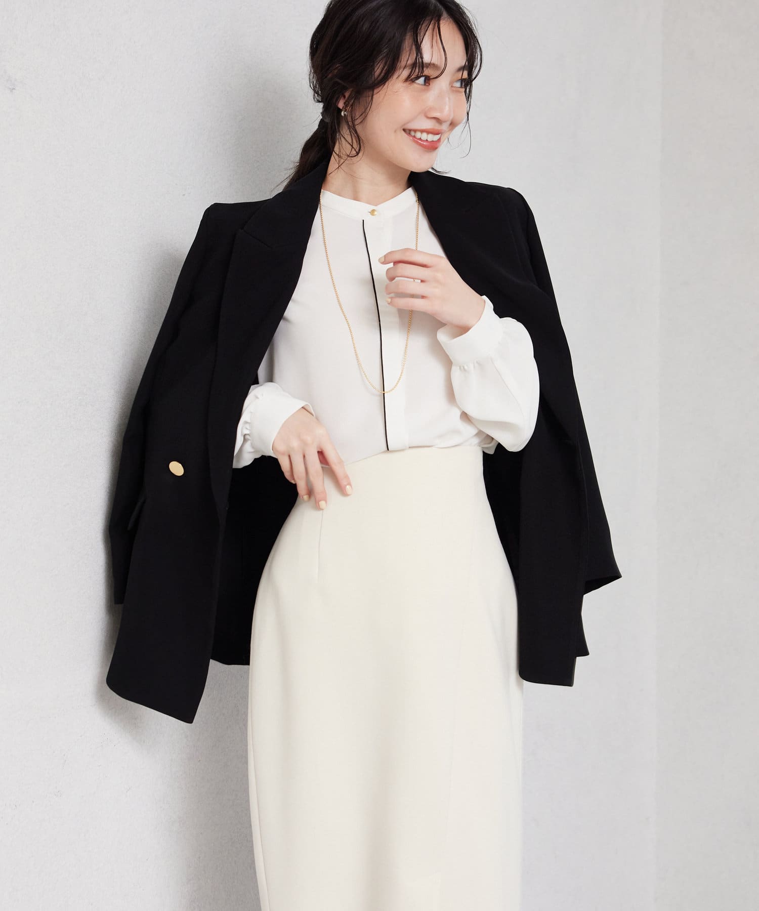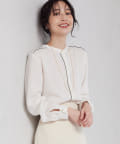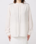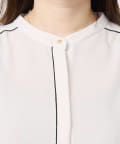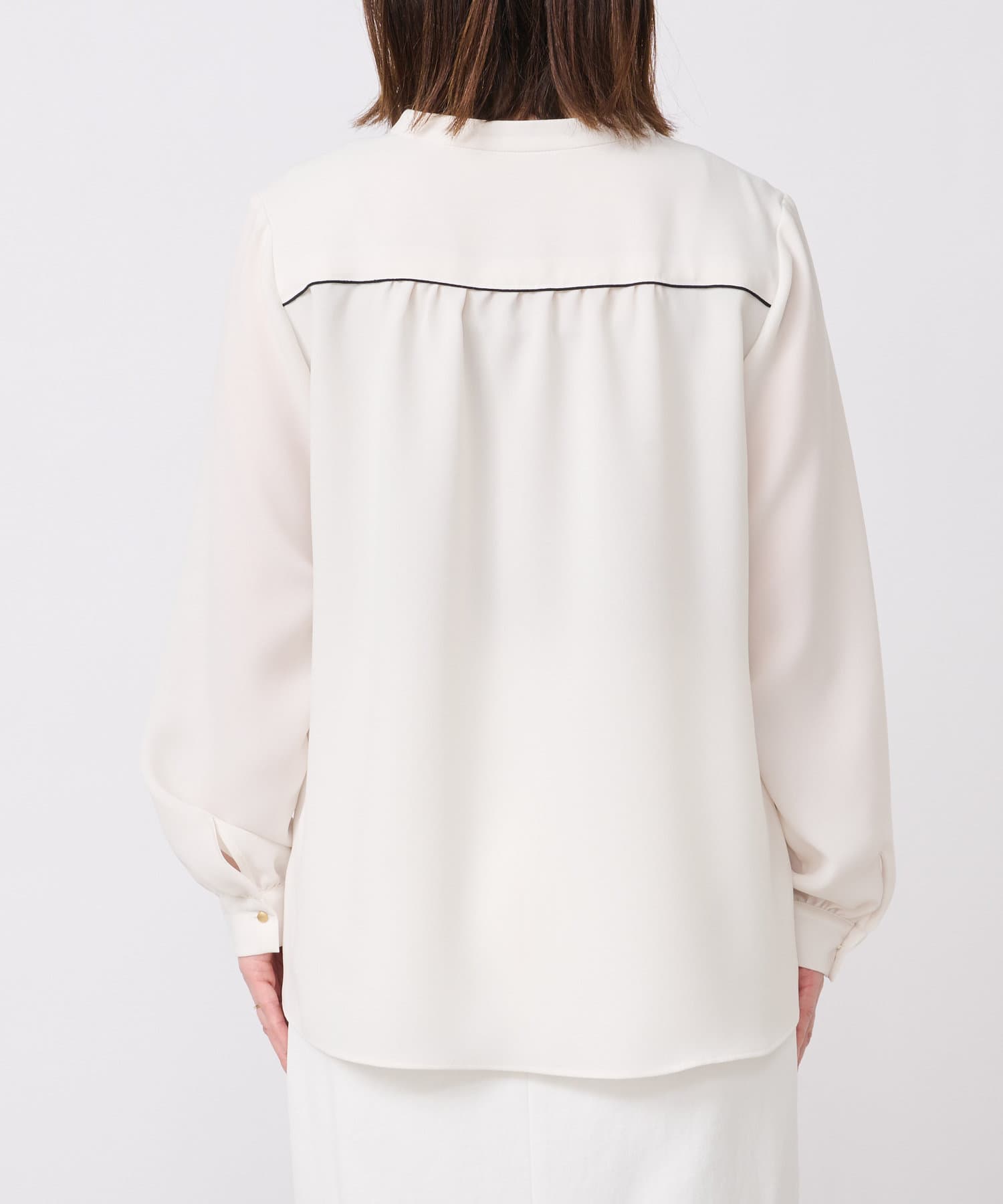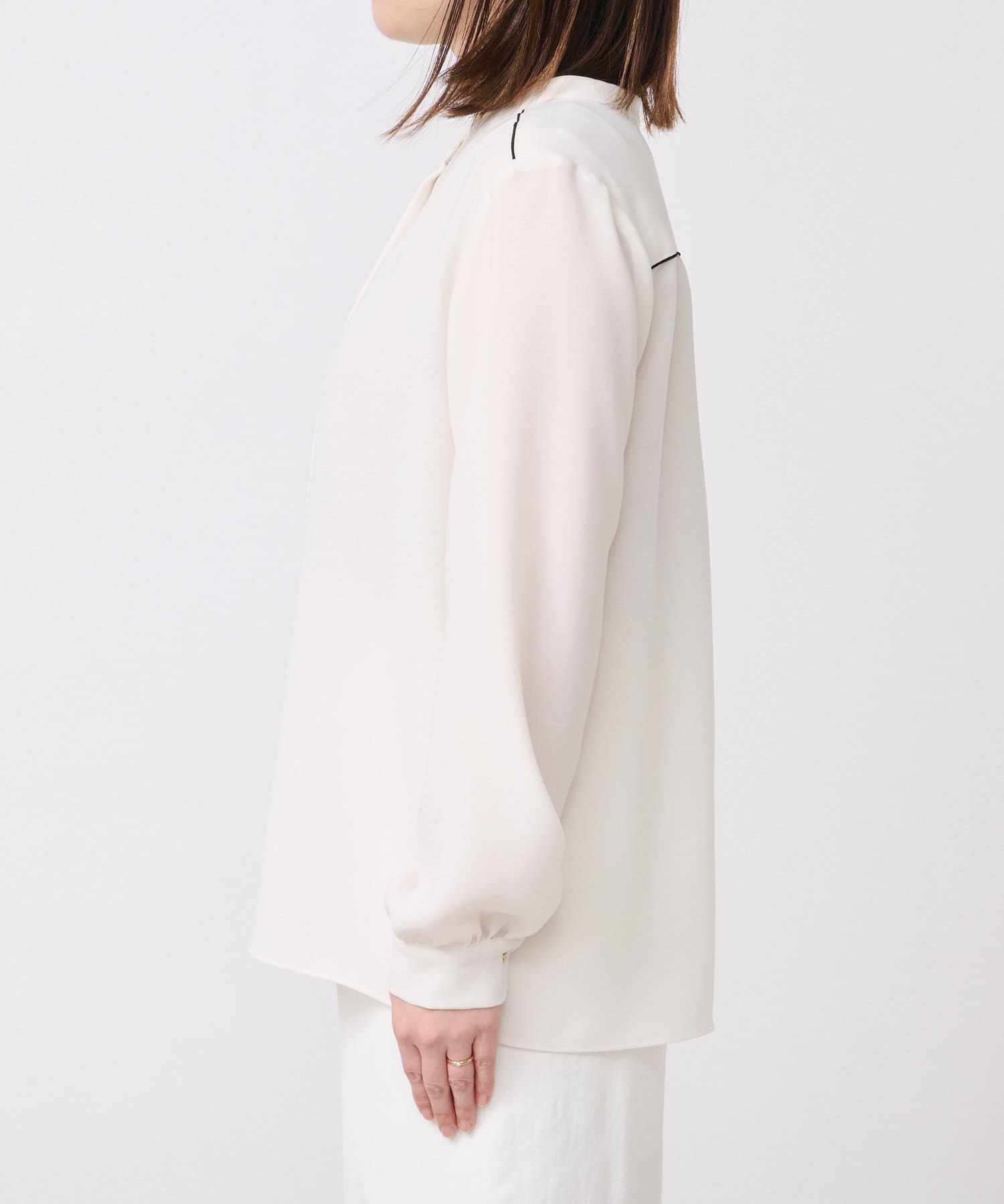 バイカラーのラインがデザインのポイントになっているスタンドカラーのブラウス。