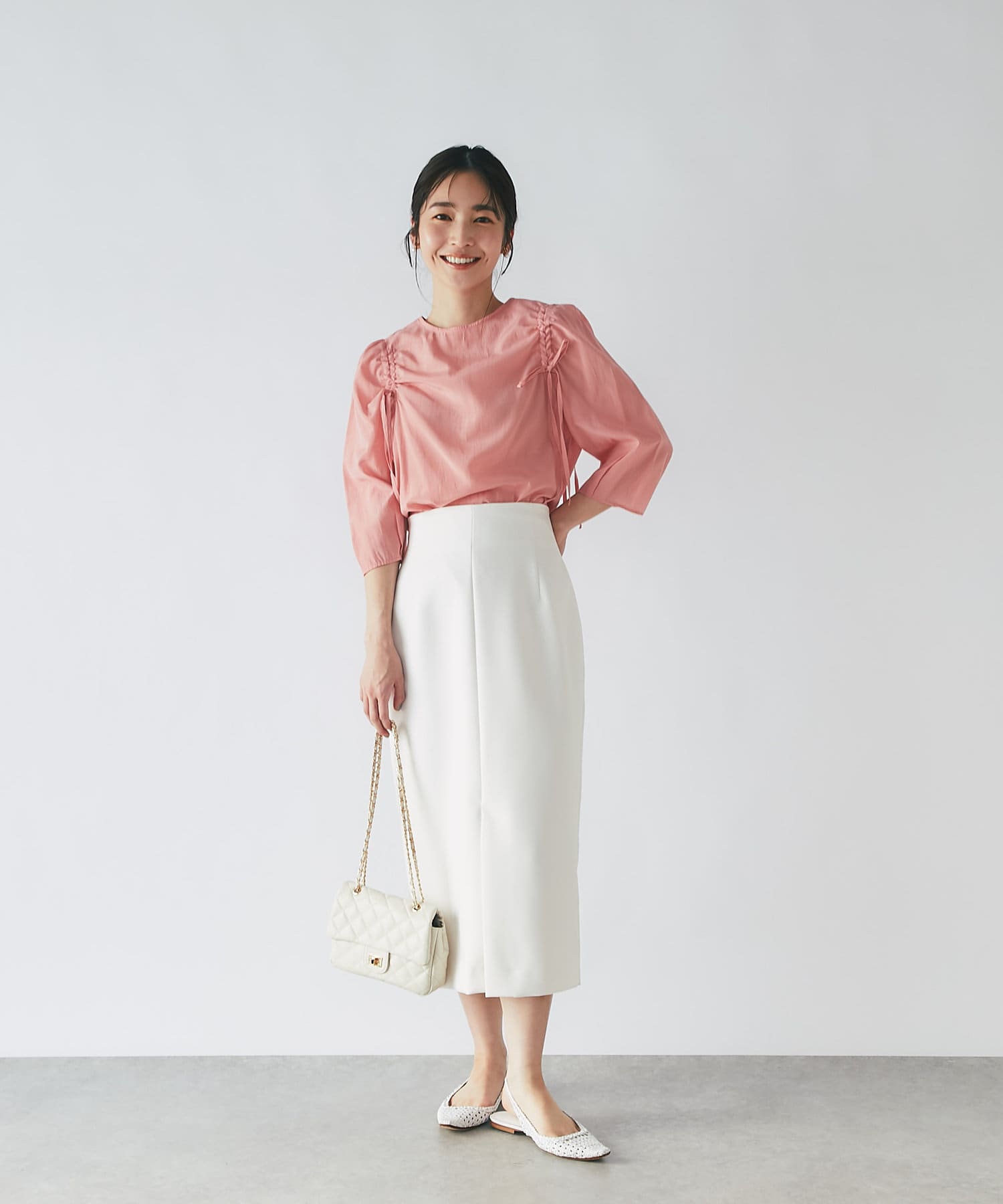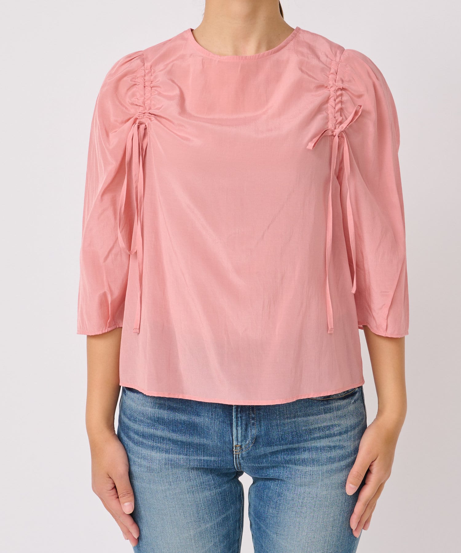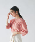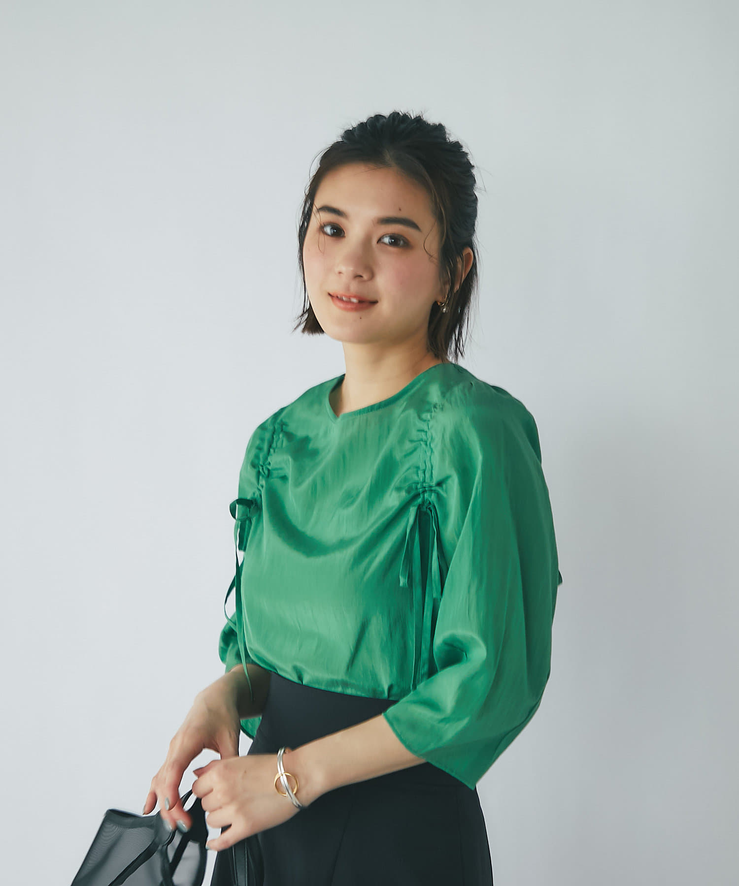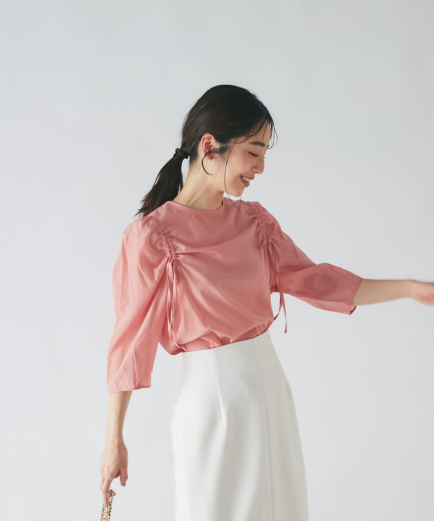 肩のドロストが大人可愛い雰囲気を演出してくれるブラウス。