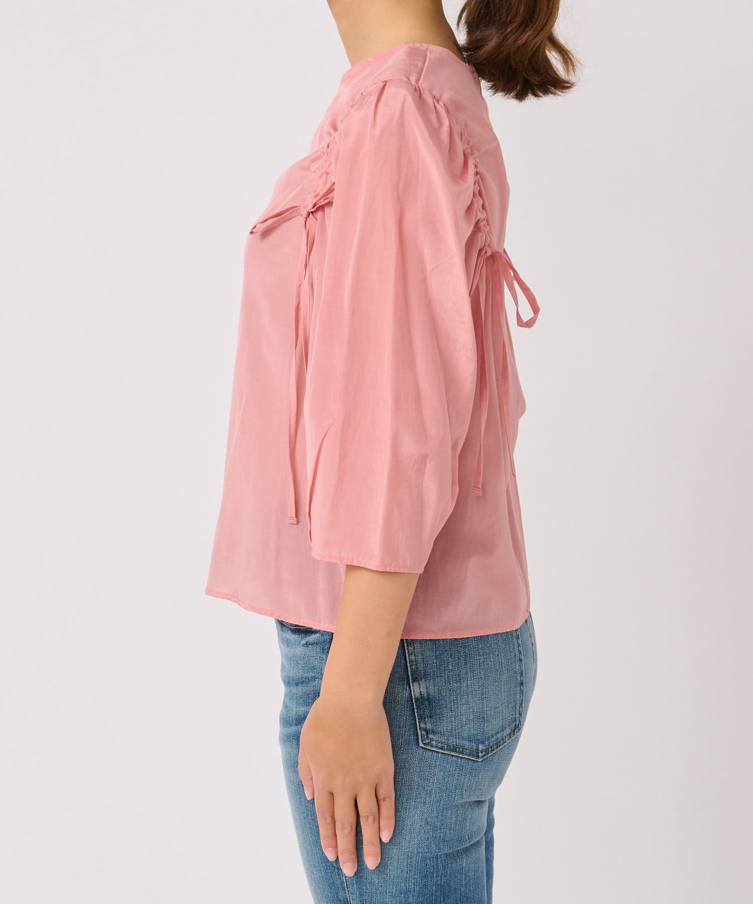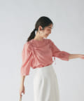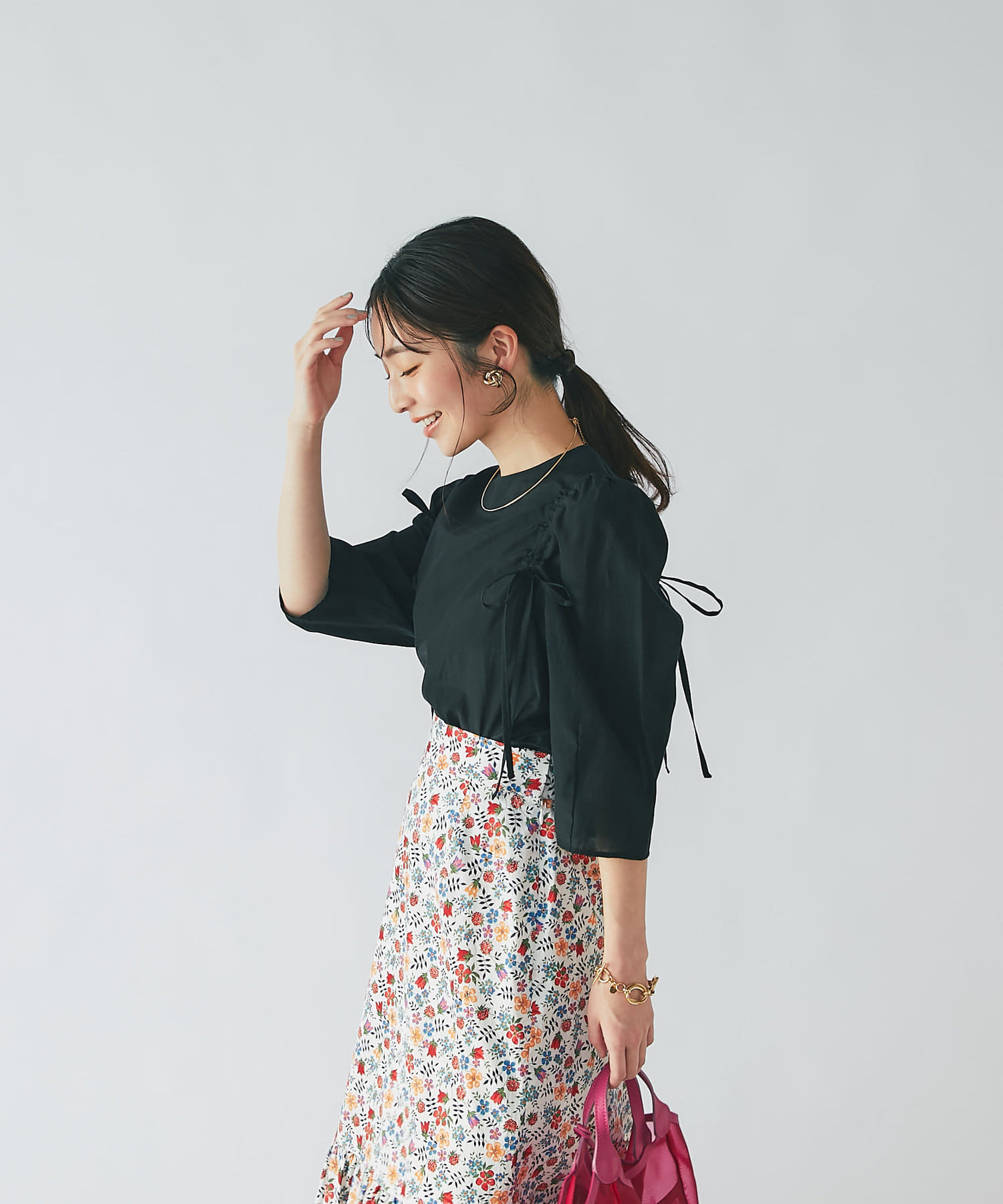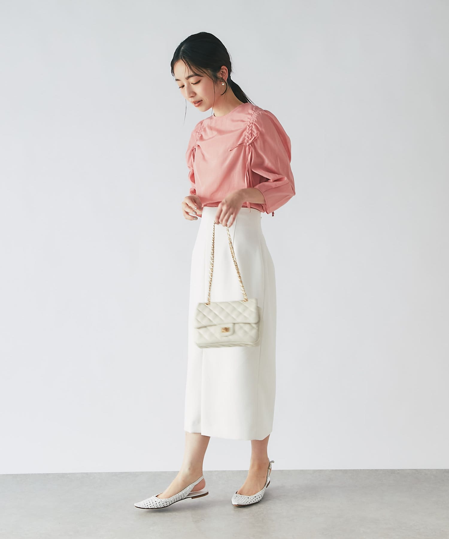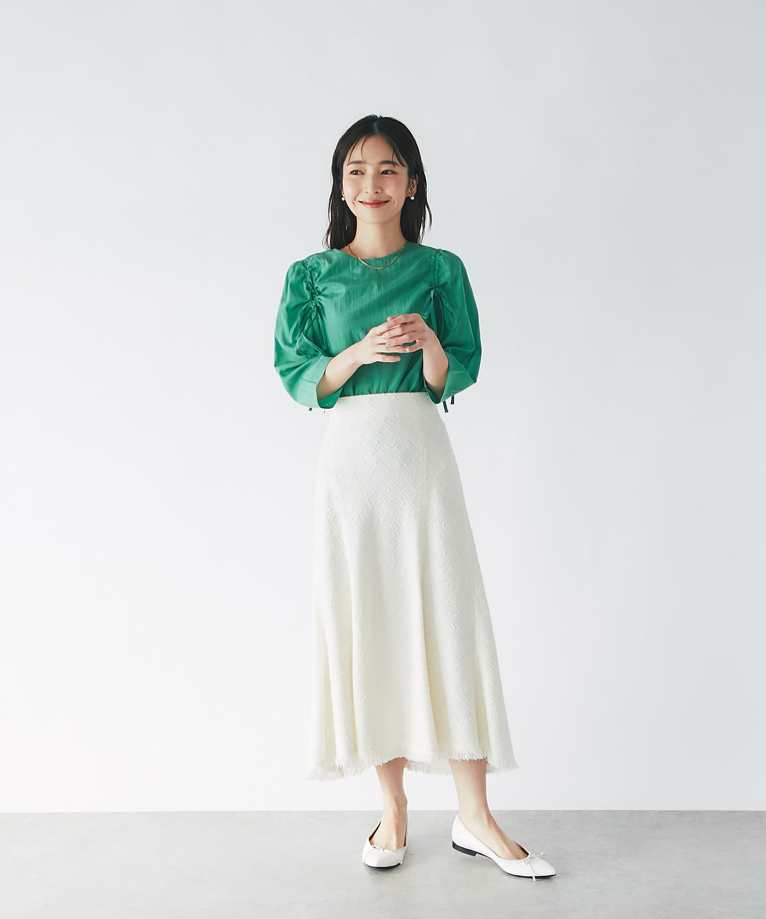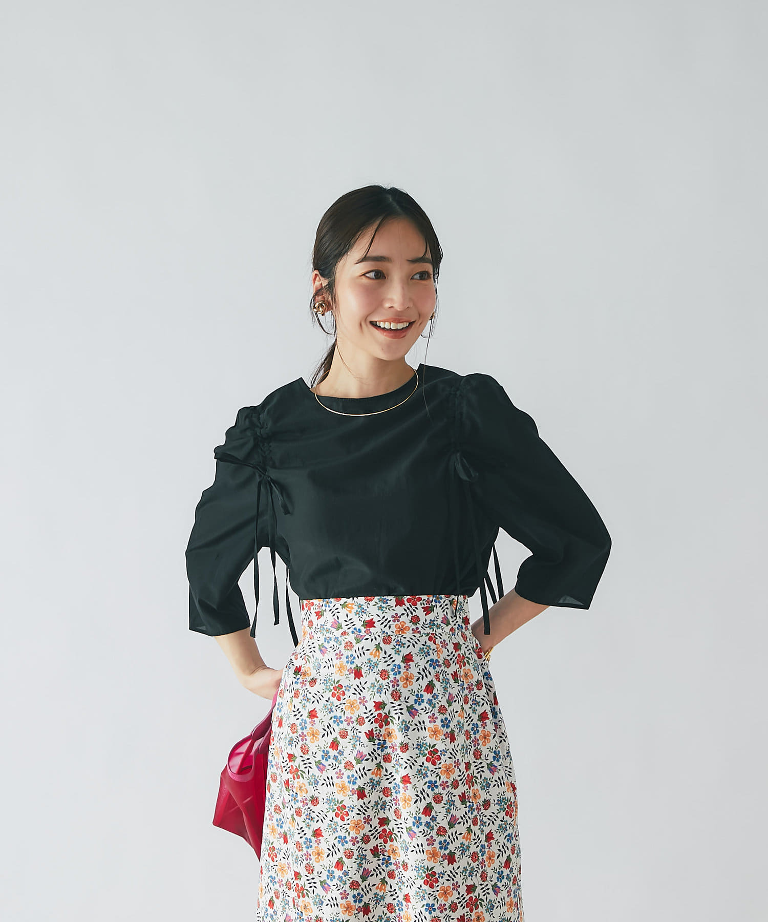 肩のドロストが大人可愛い雰囲気を演出してくれるブラウス。