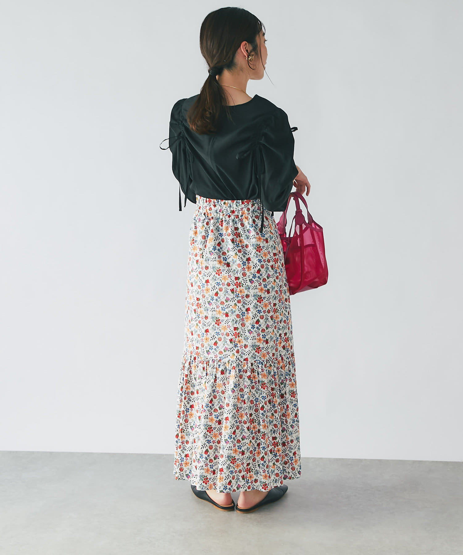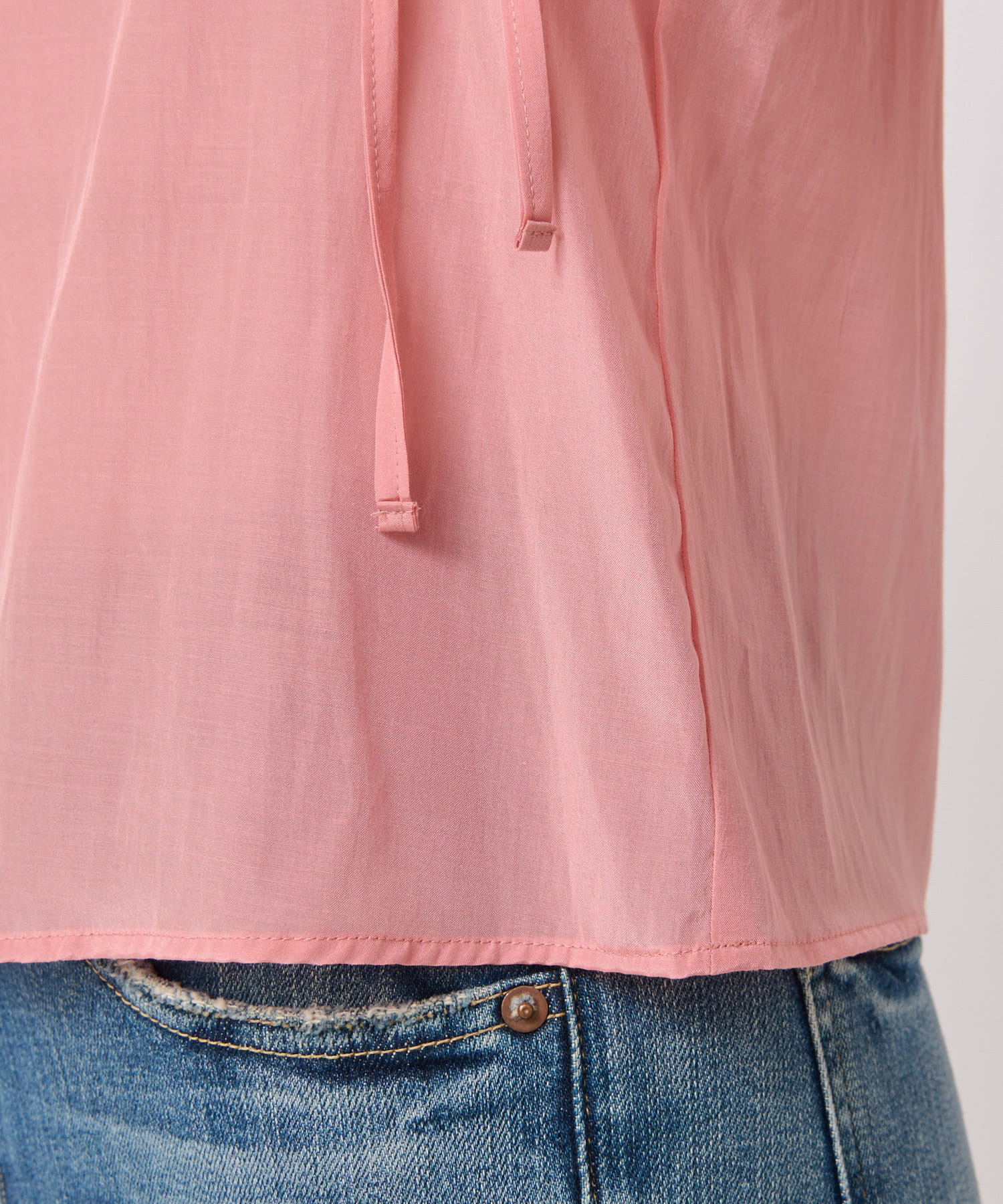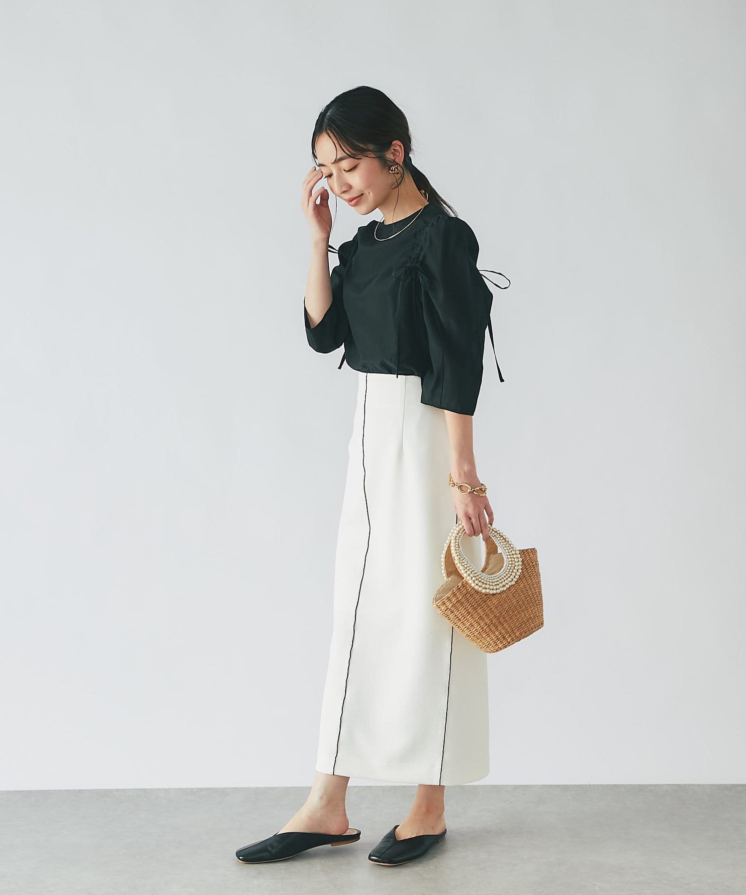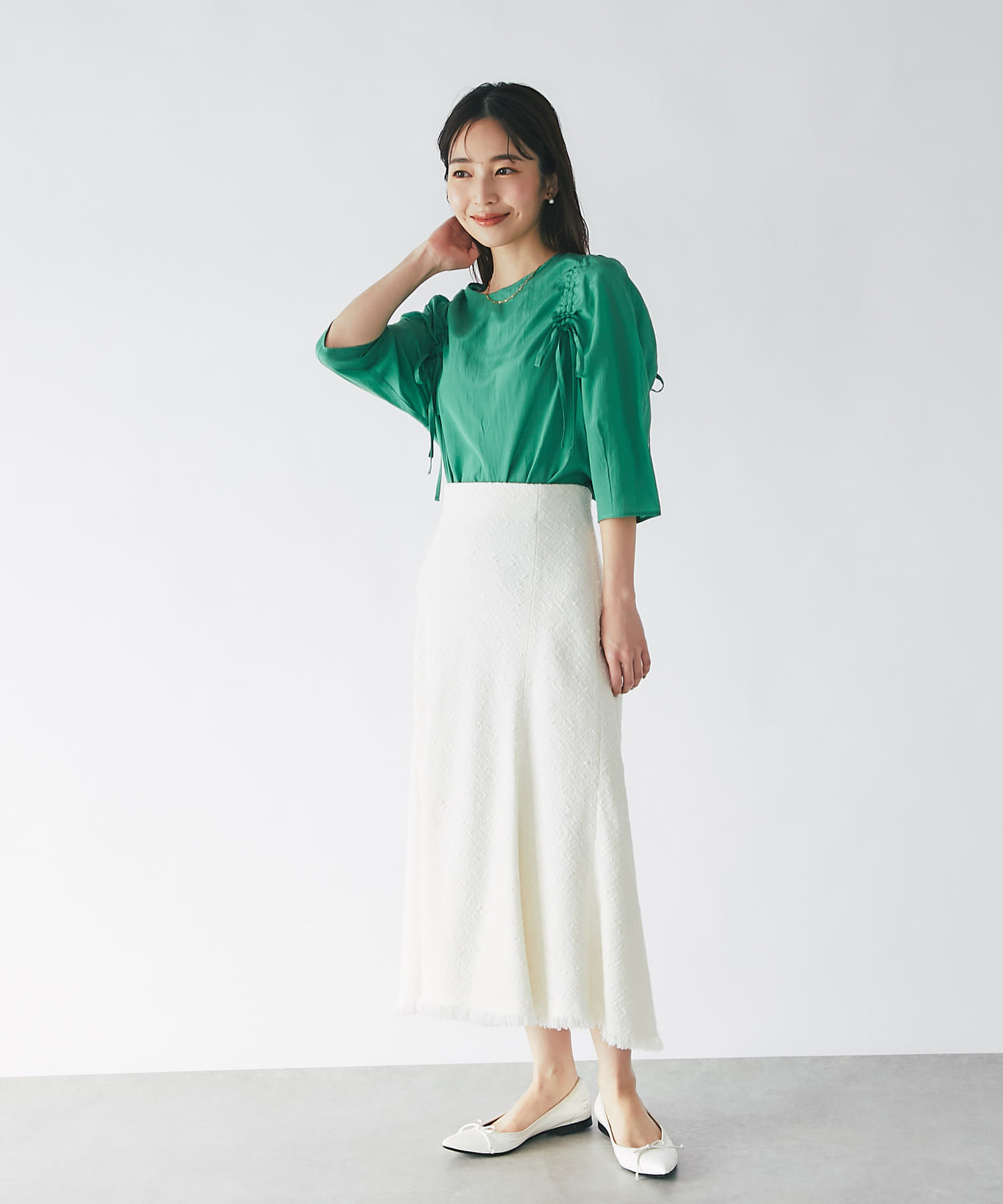 肩のドロストが大人可愛い雰囲気を演出してくれるブラウス。
