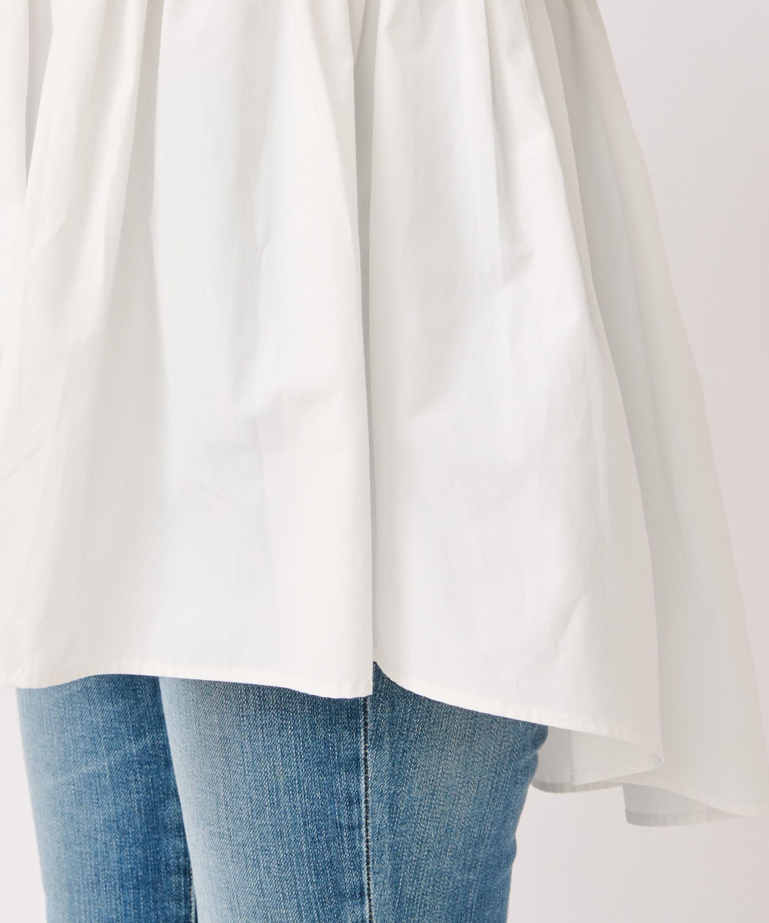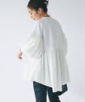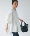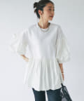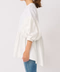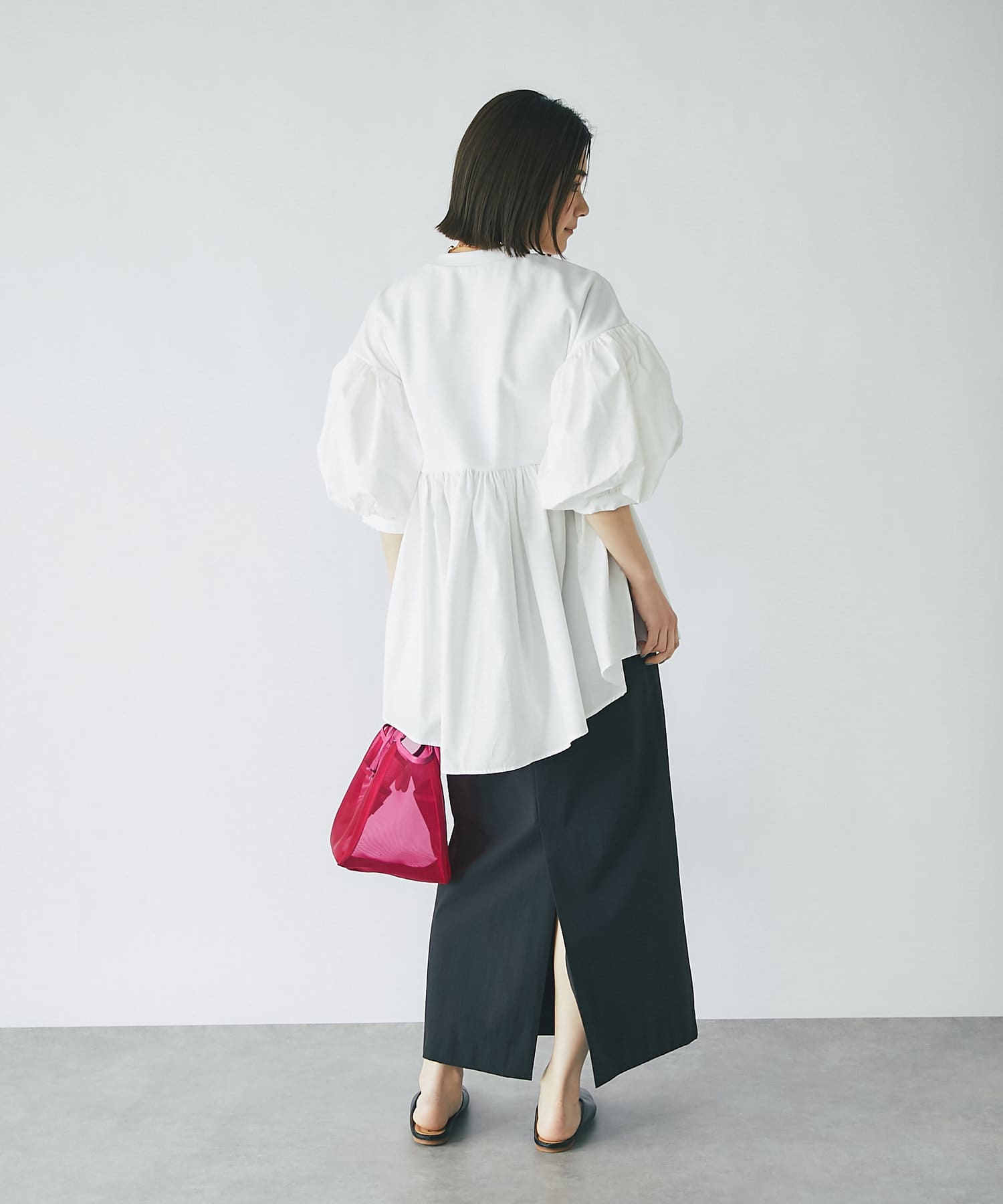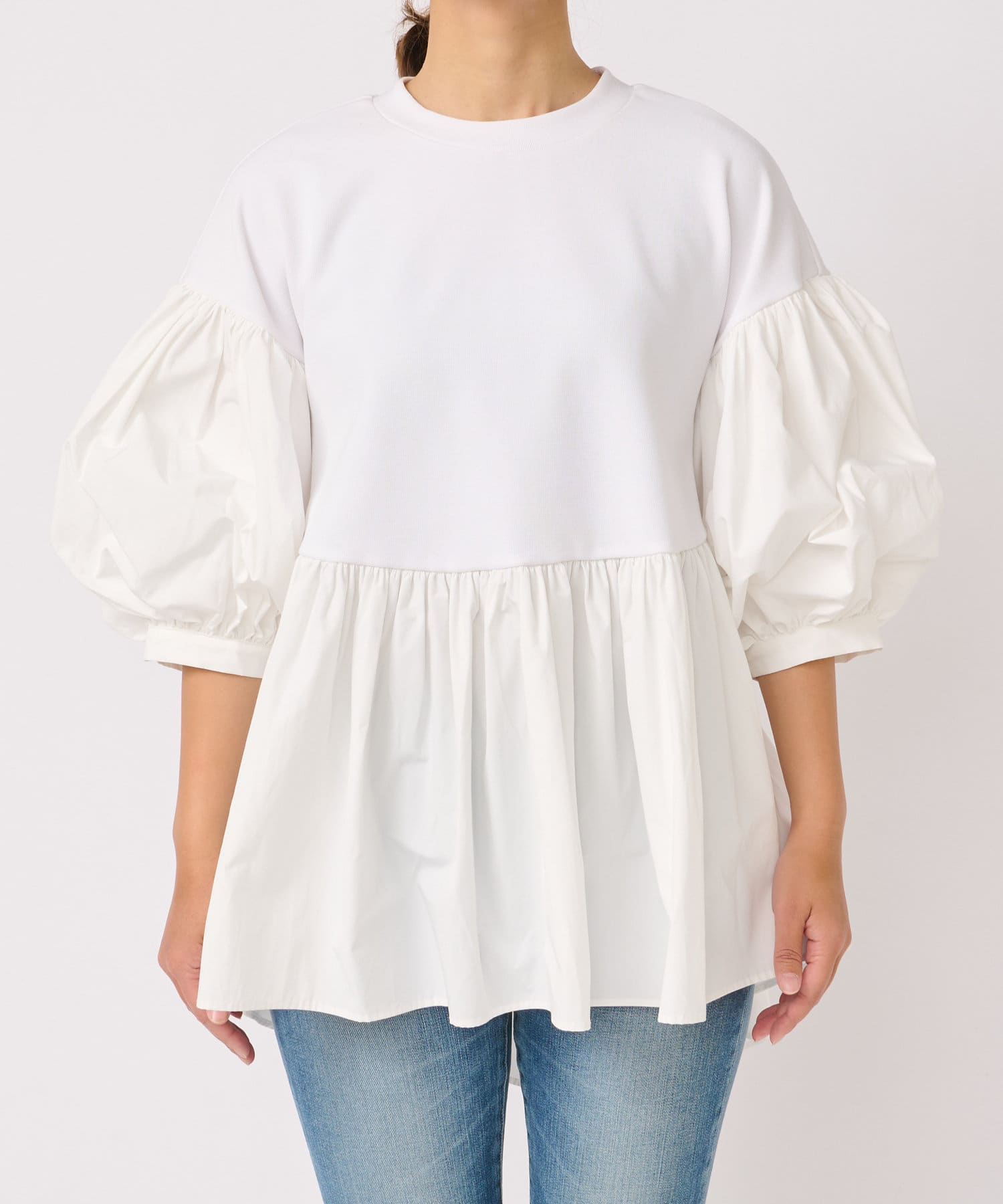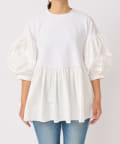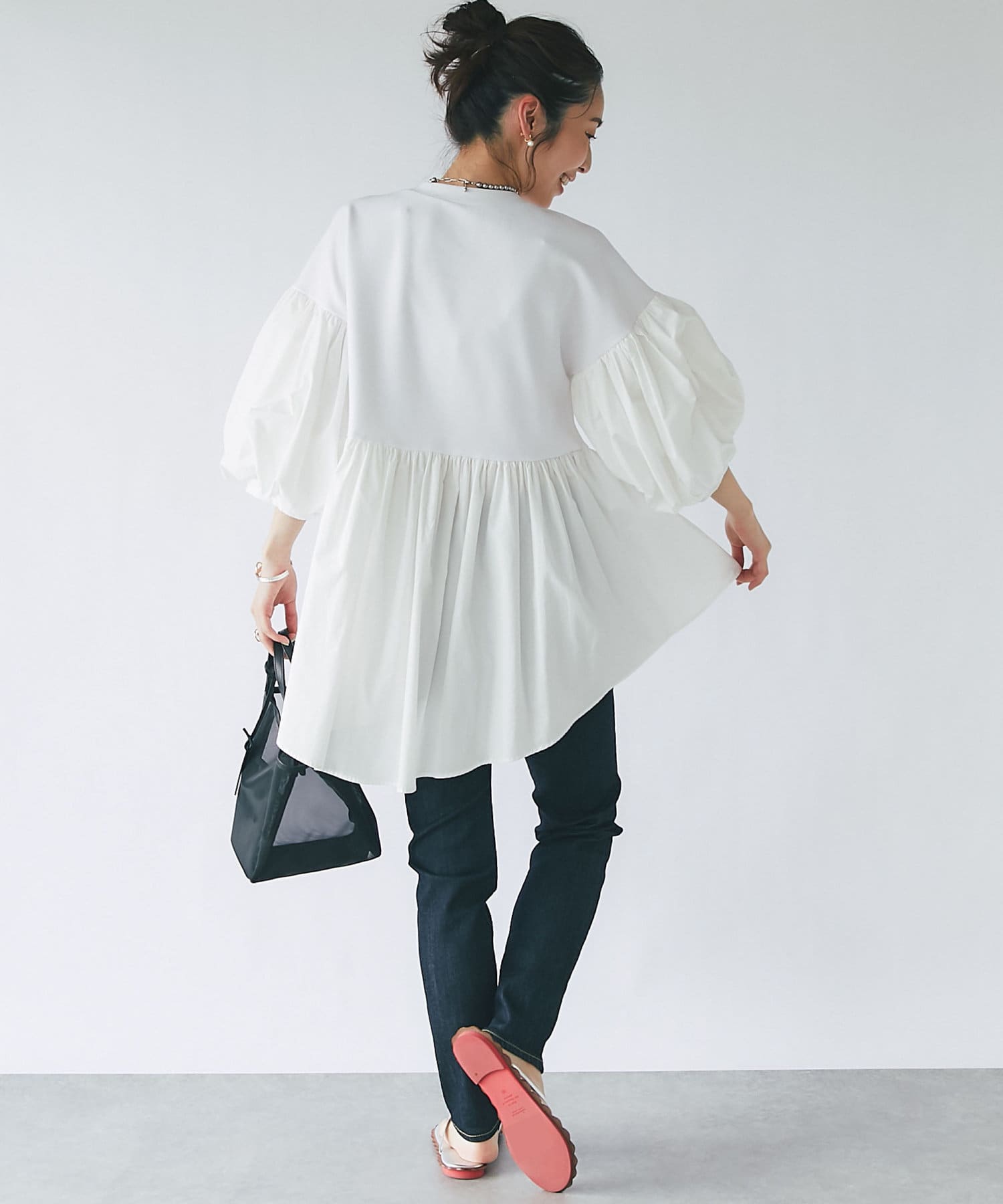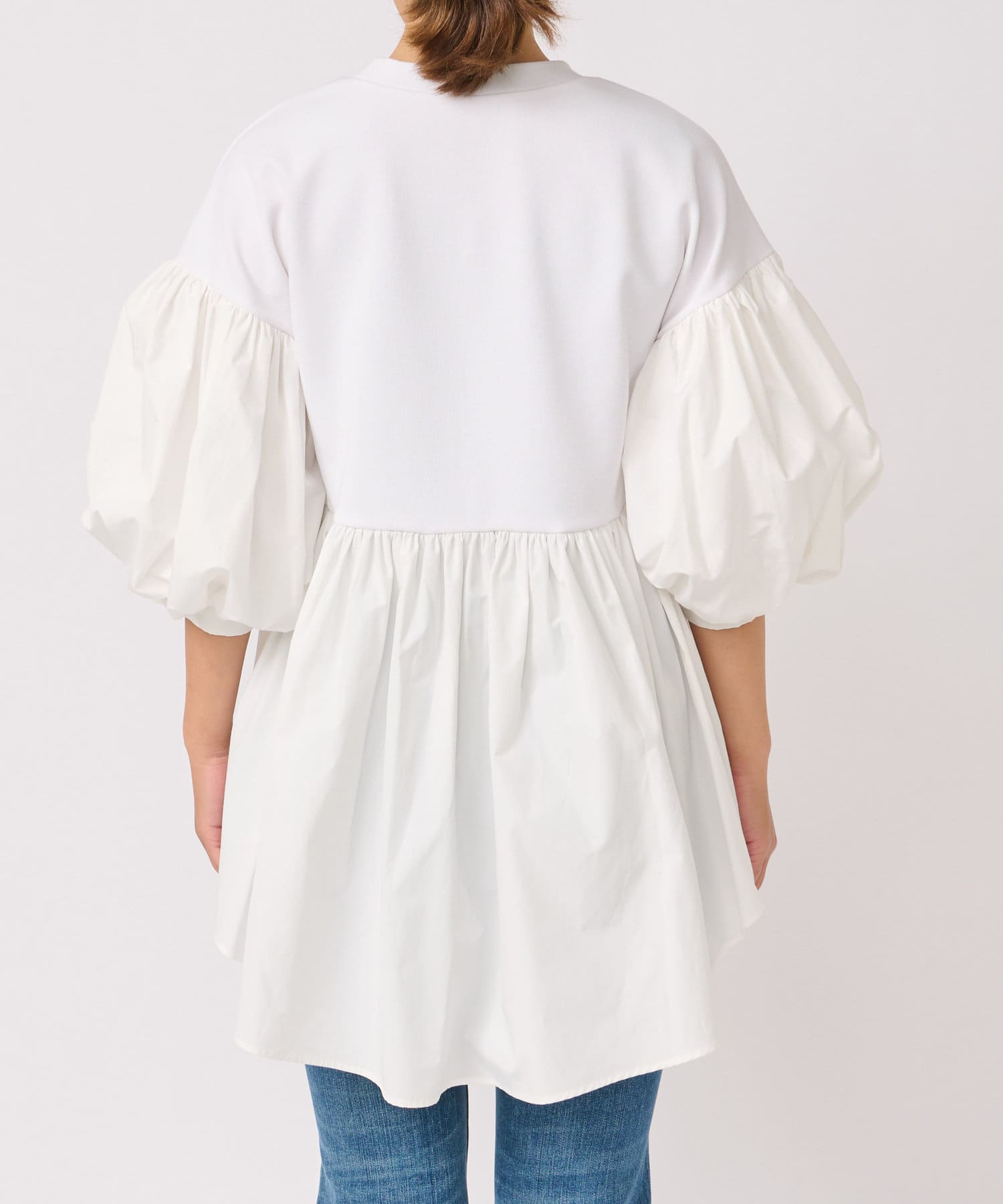 異素材のバルーンスリーブが目を惹くチュニックブラウス