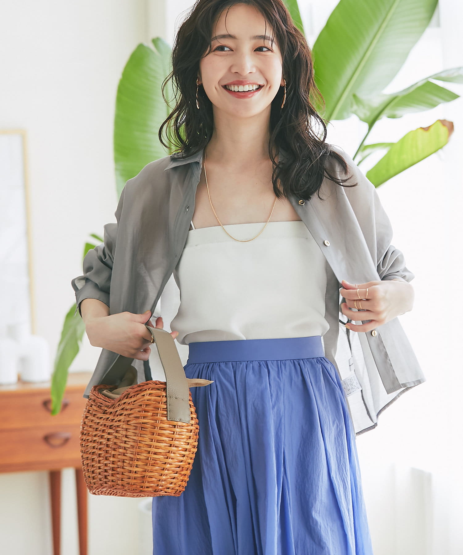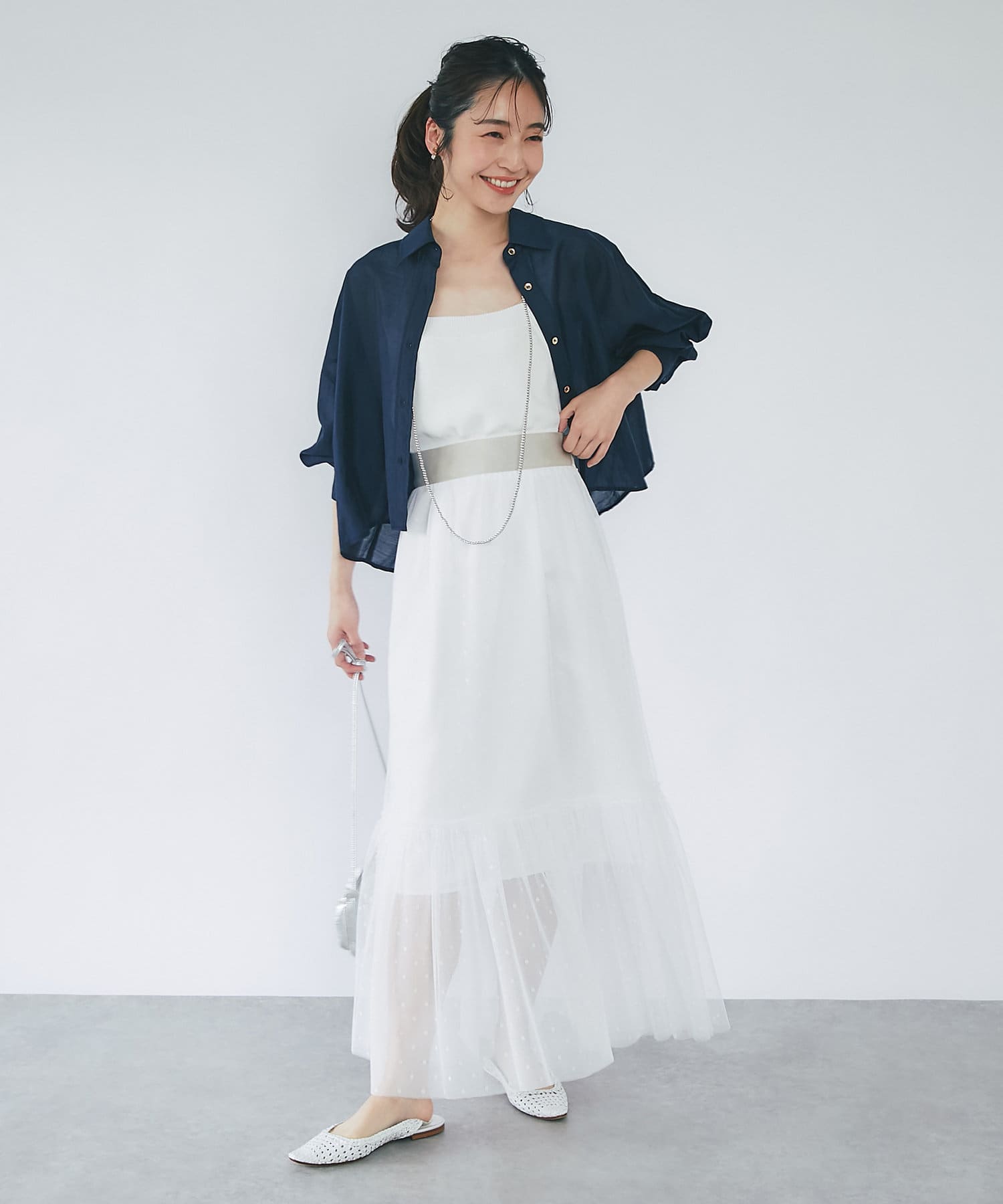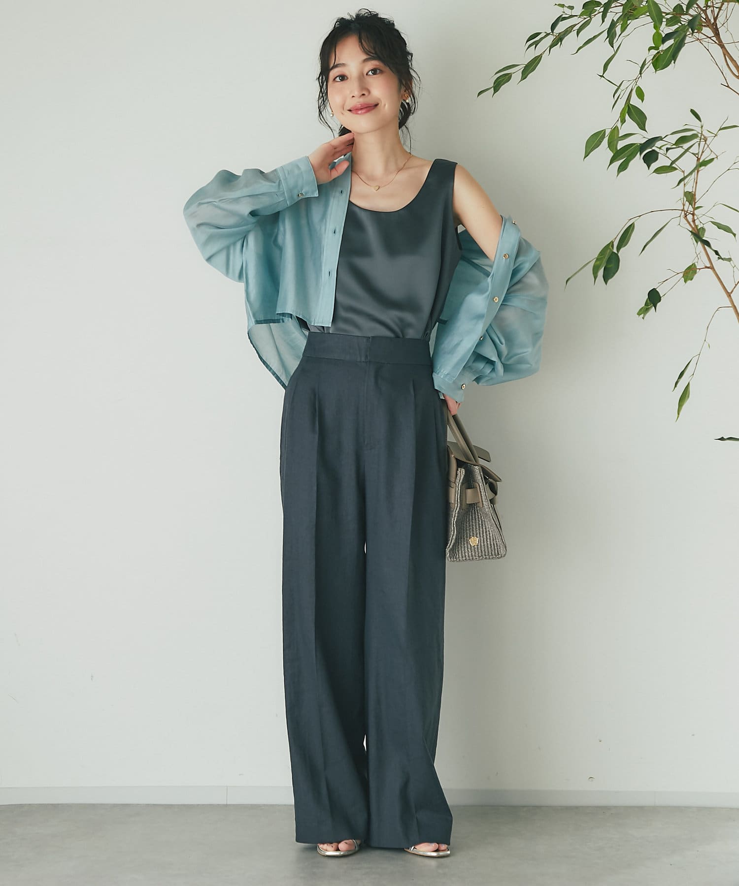 インナーにサテンタンクトップやキャミワンピースとのレイヤードがおすすめ。