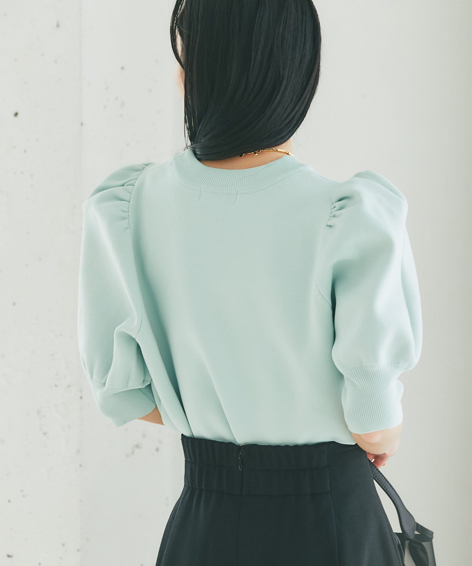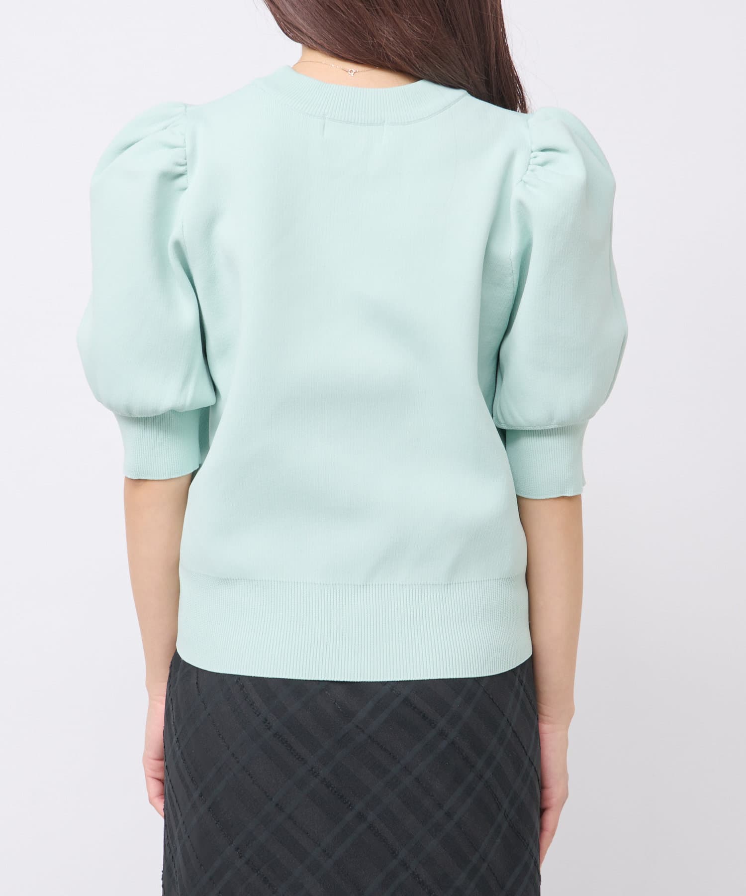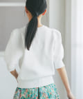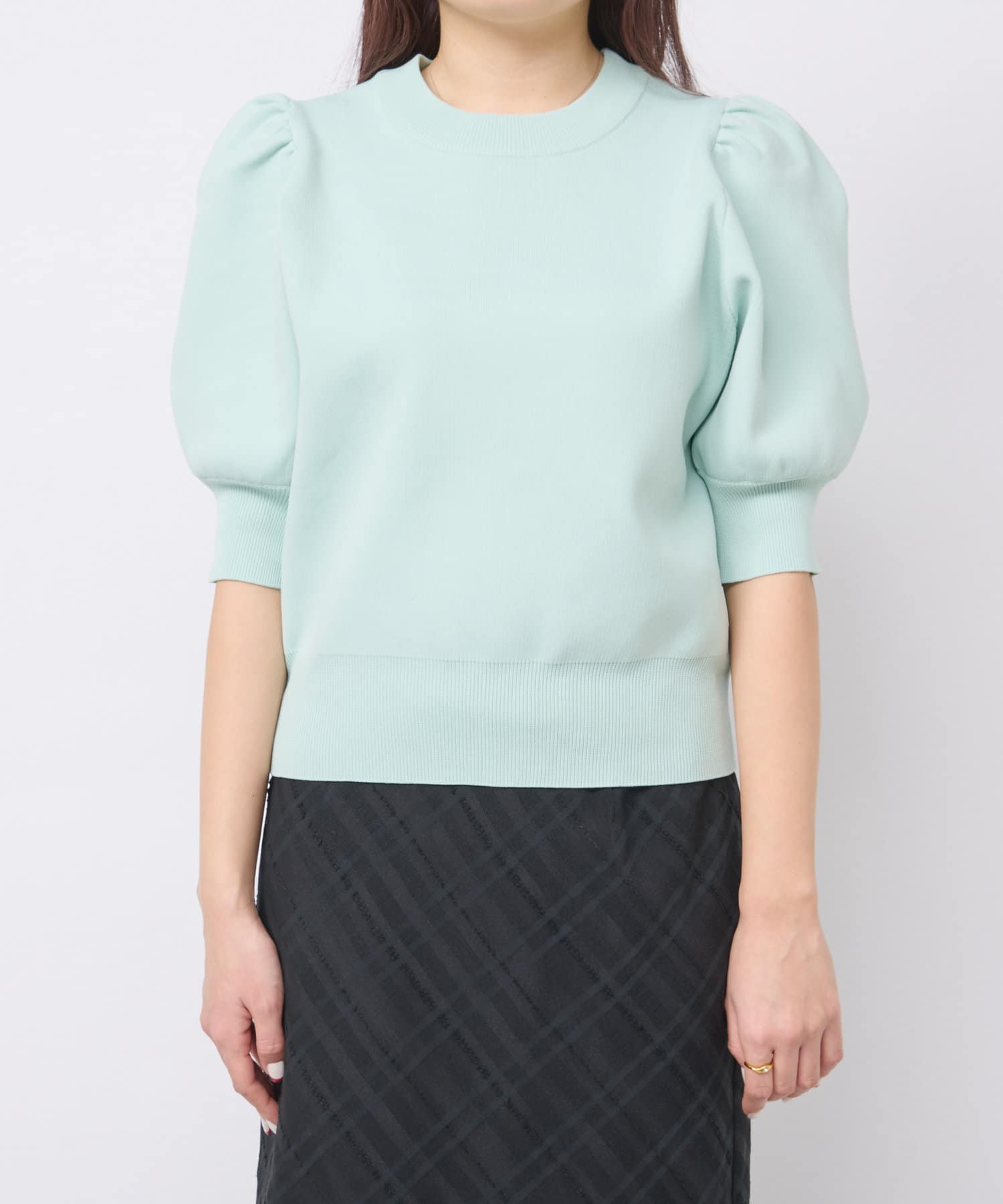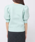 もっちりとした柔らかい生地で、膨らんだパフスリーブが印象的なニット