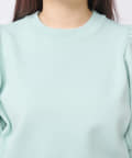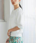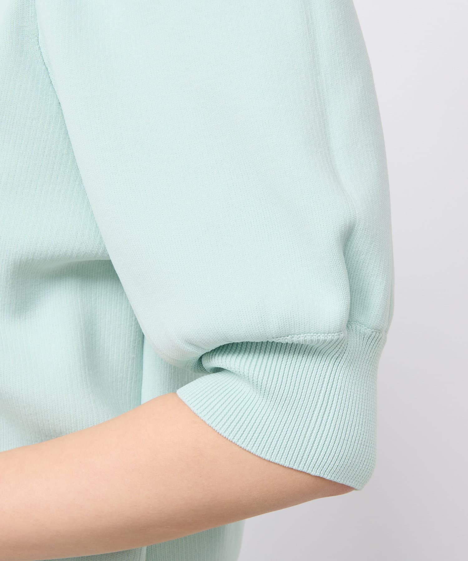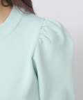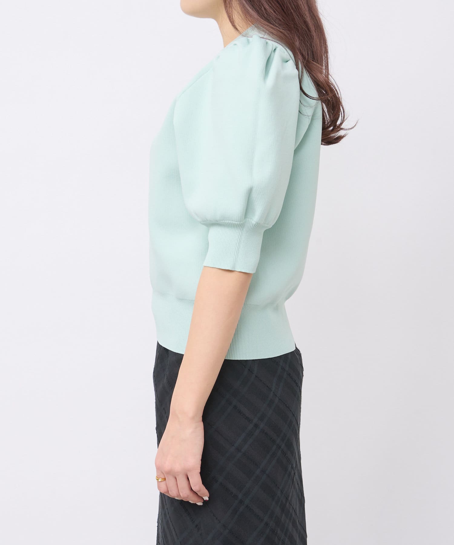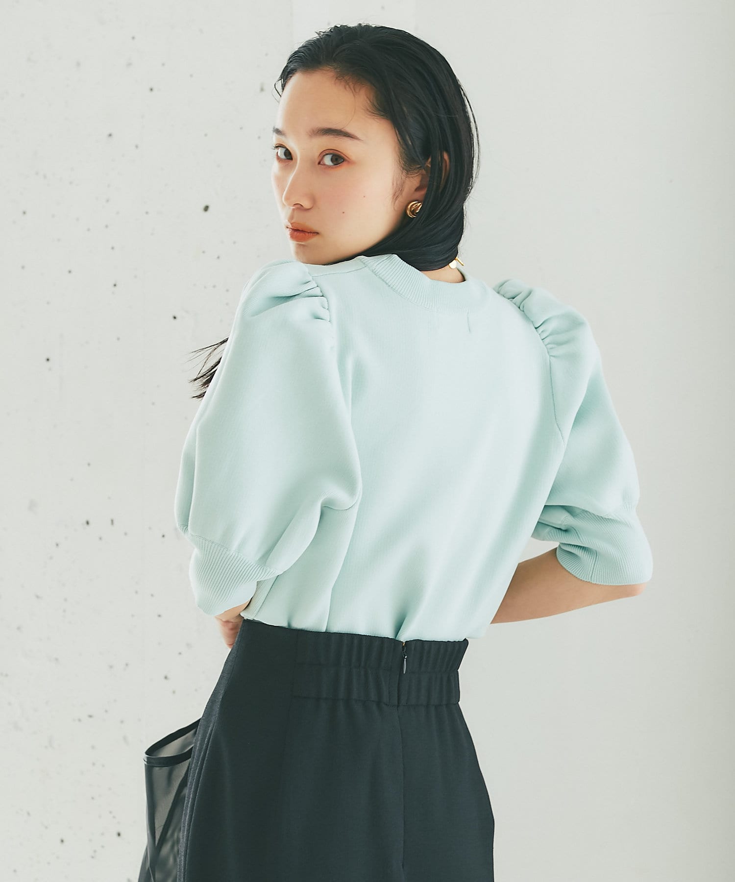 もっちりとした柔らかい生地で、膨らんだパフスリーブが印象的なニット