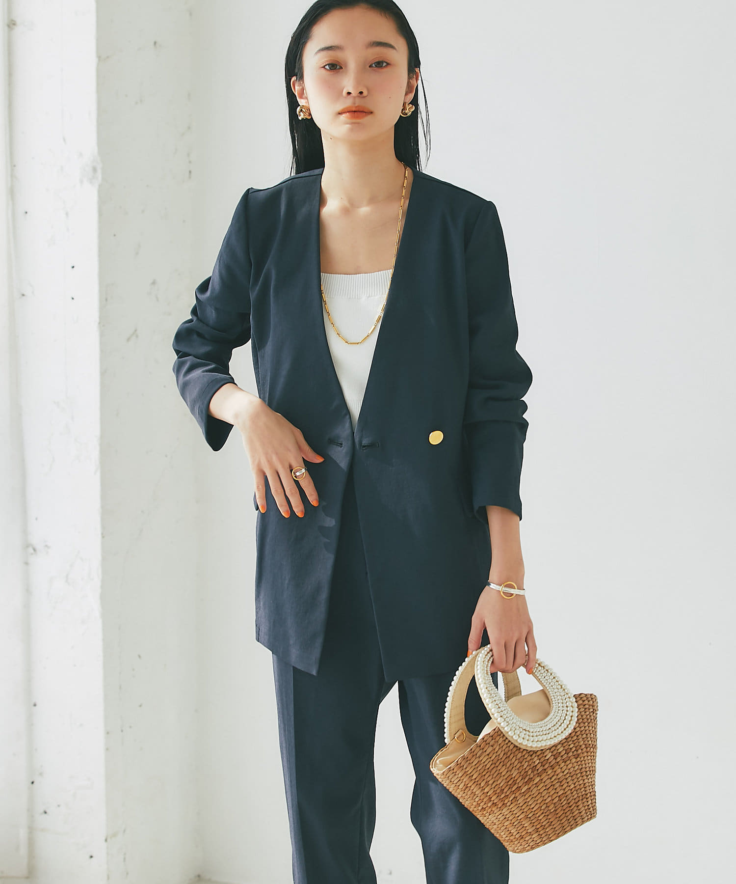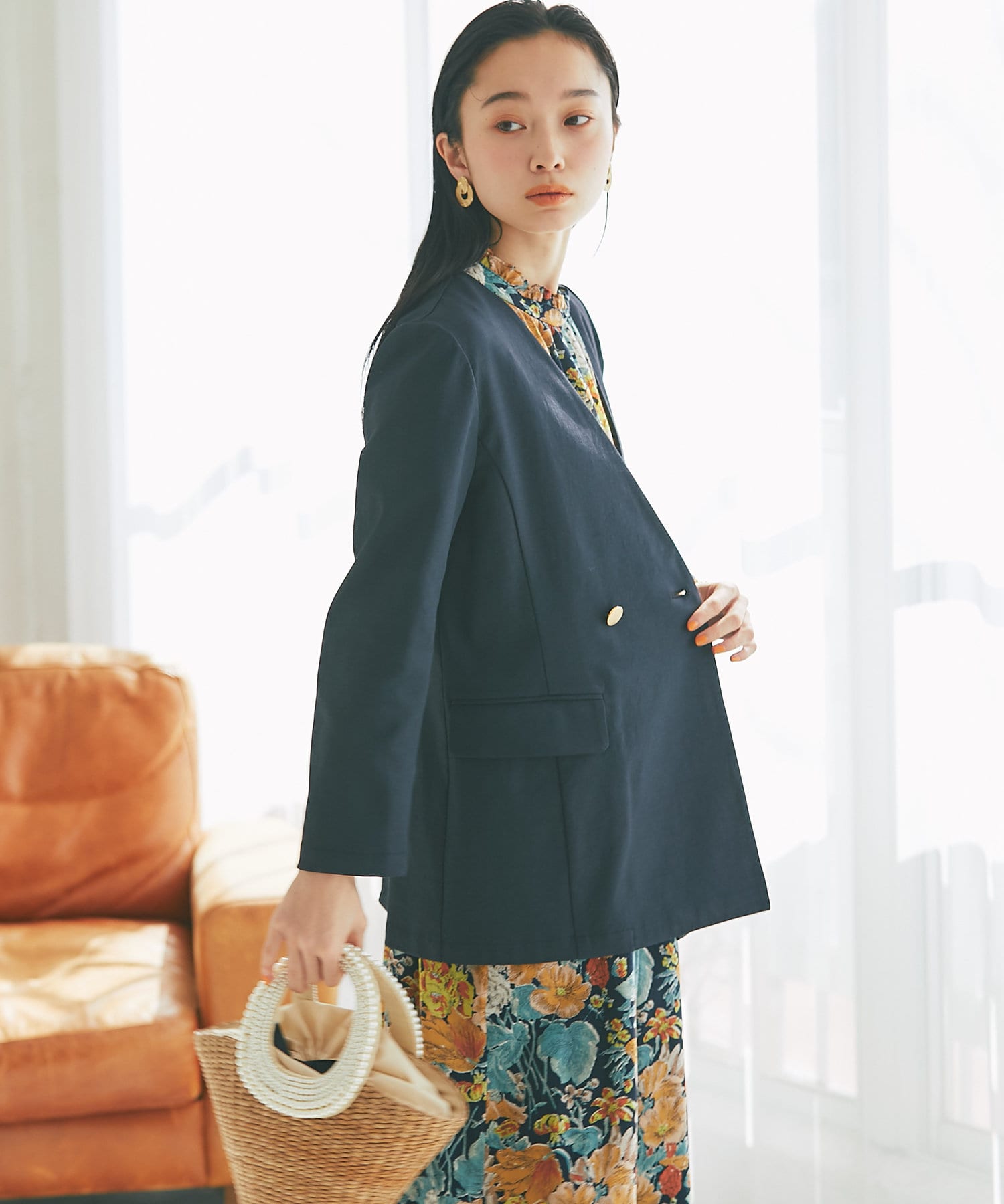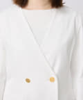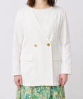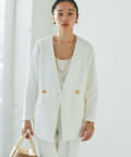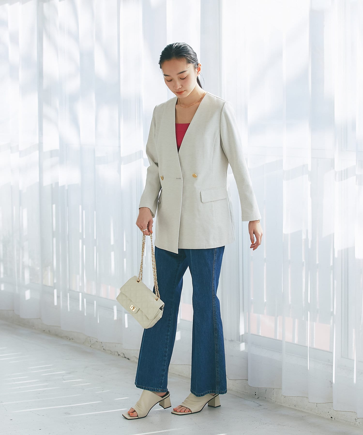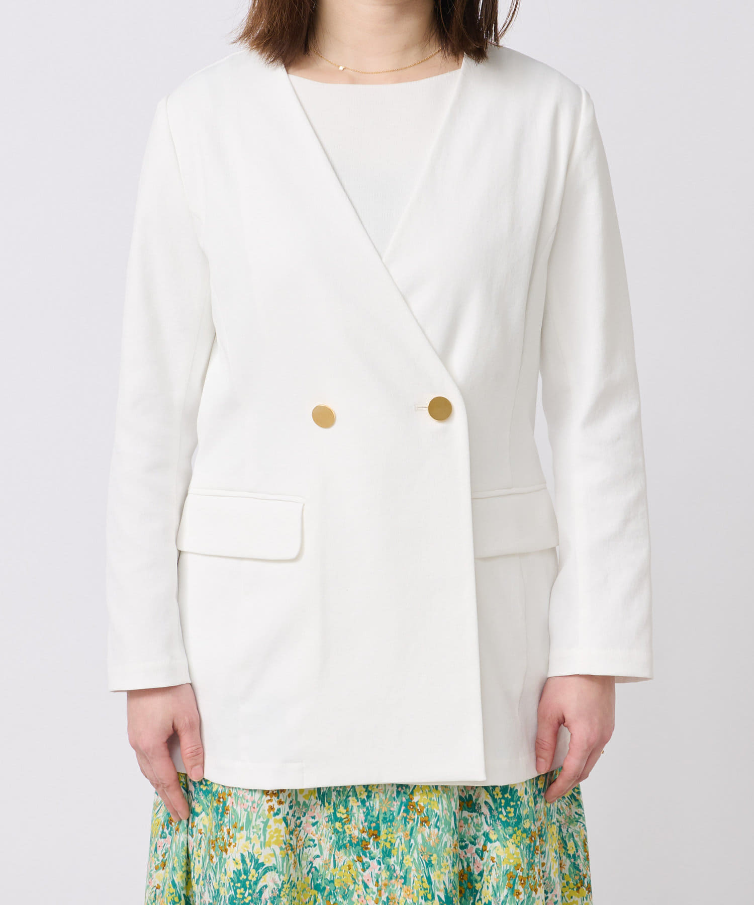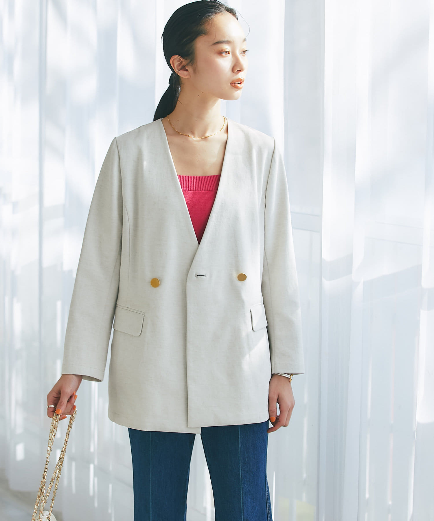 かしこまりすぎないノーカラーデザインでフェミニンな印象のダブルジャケット。