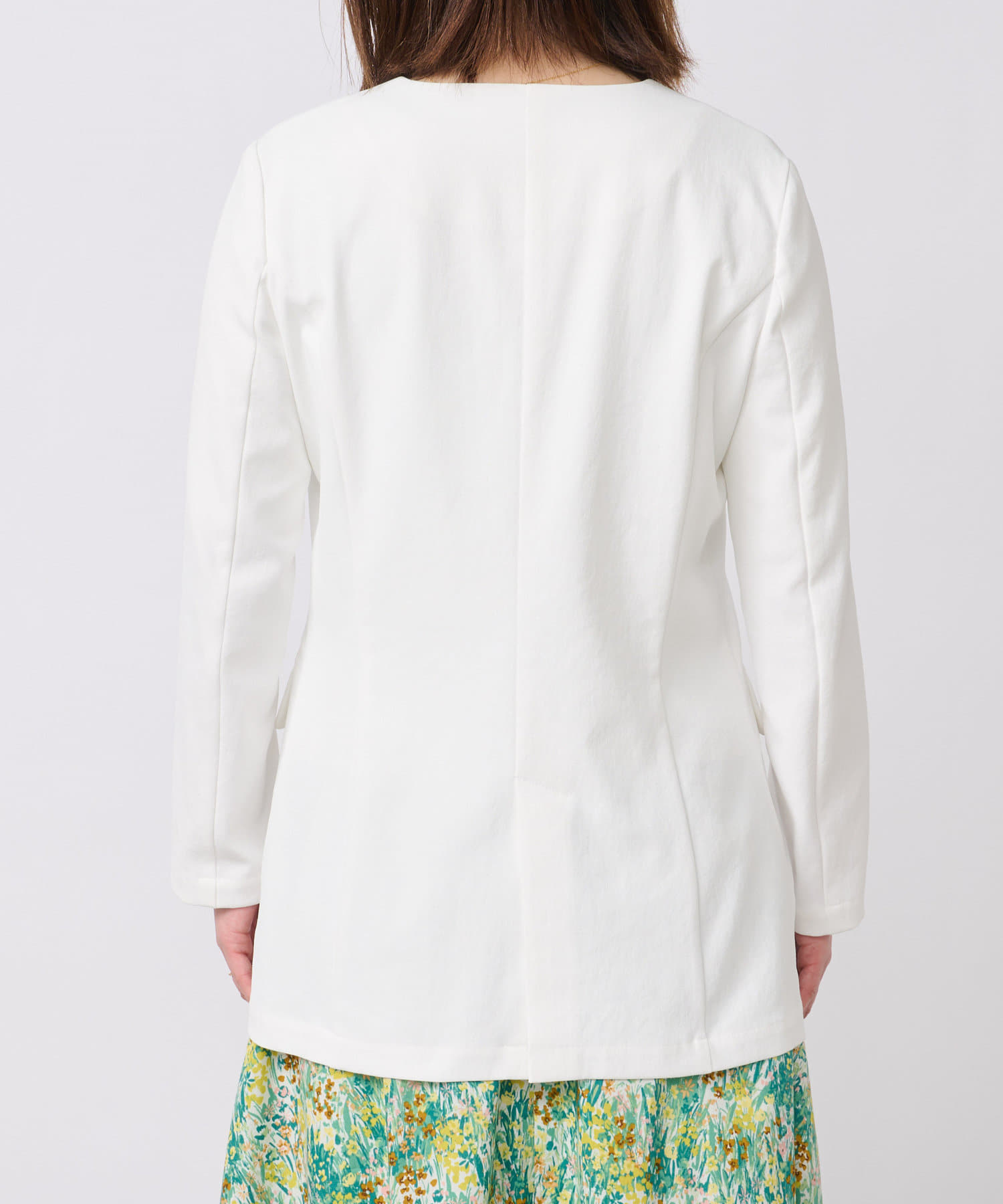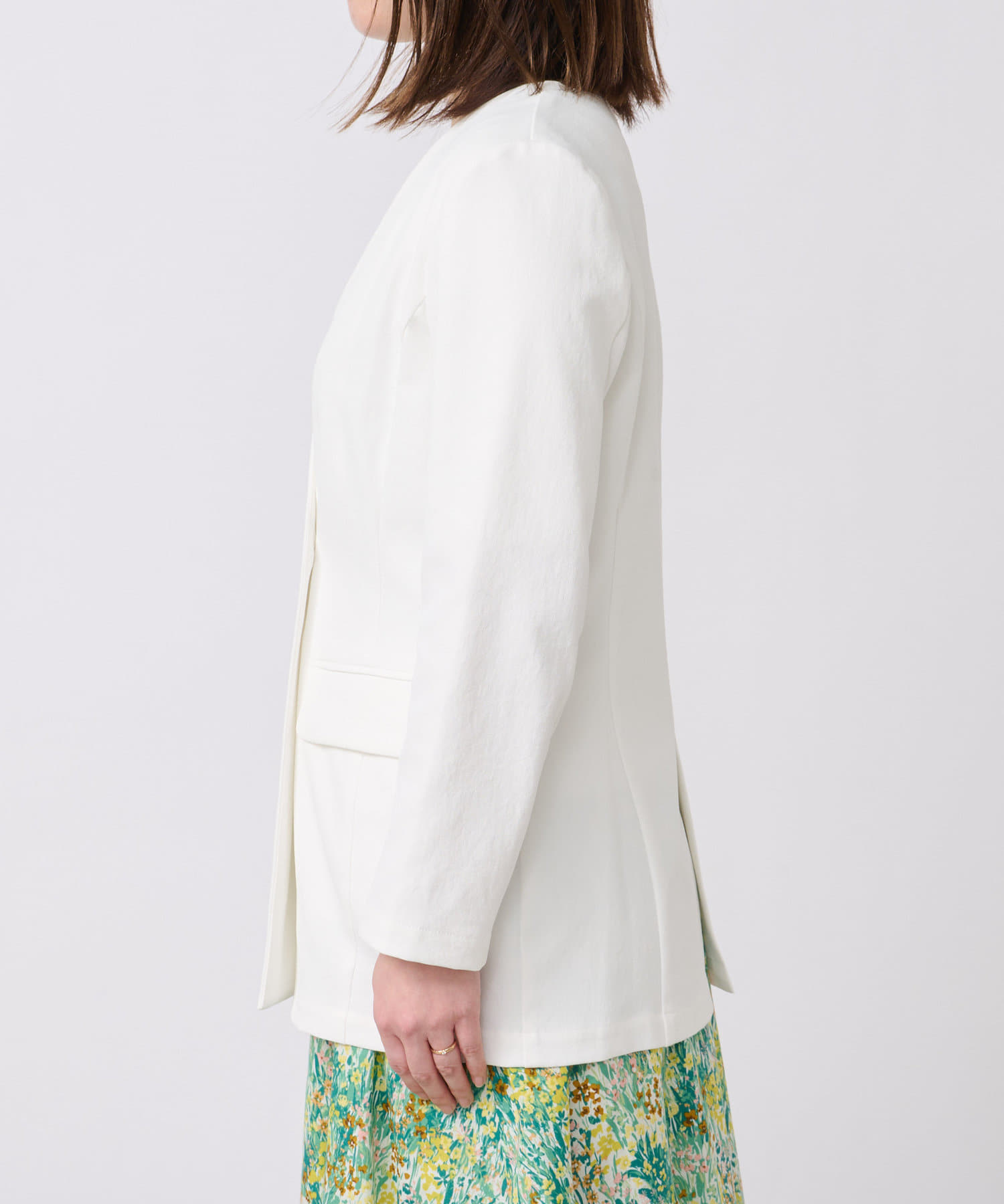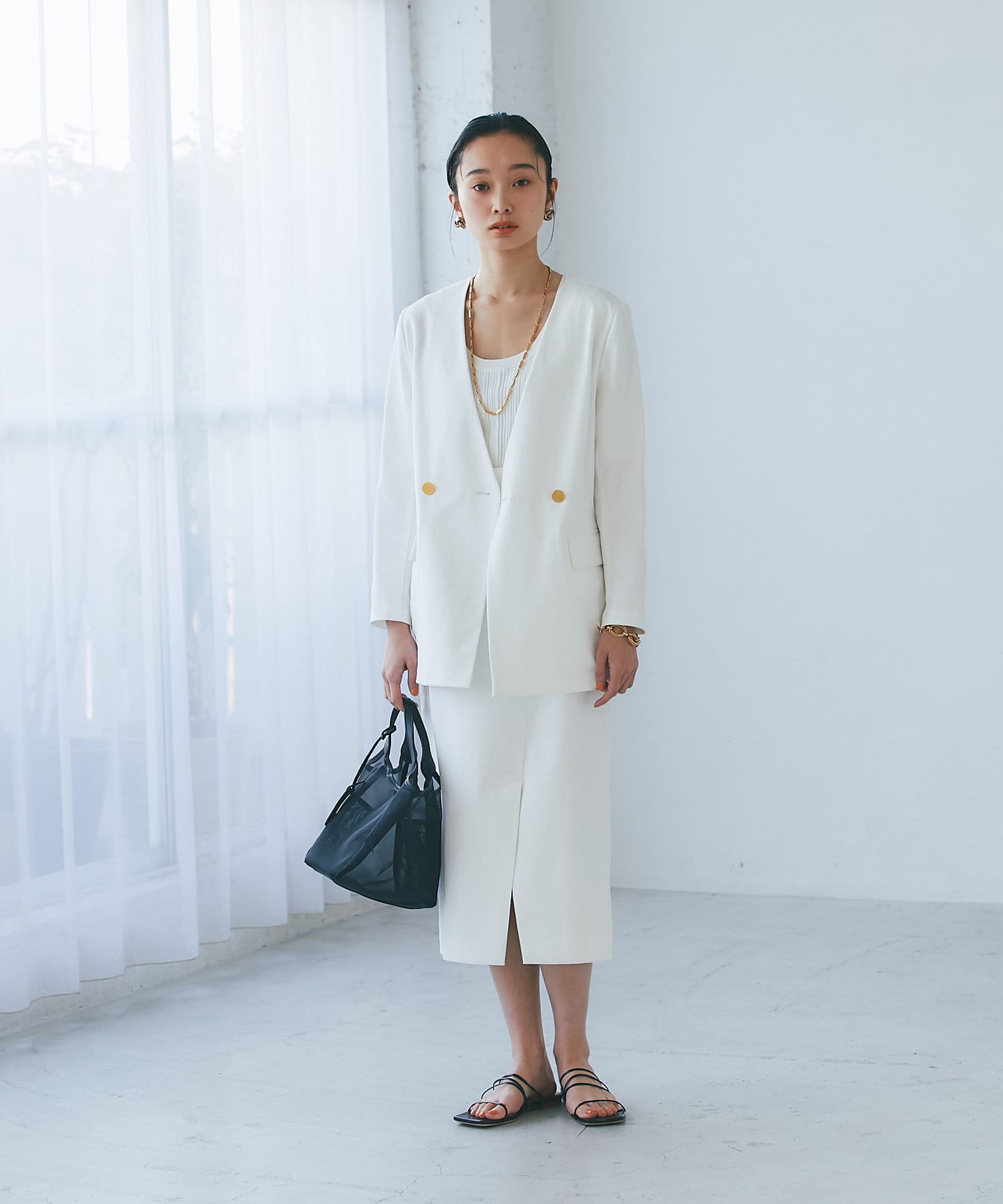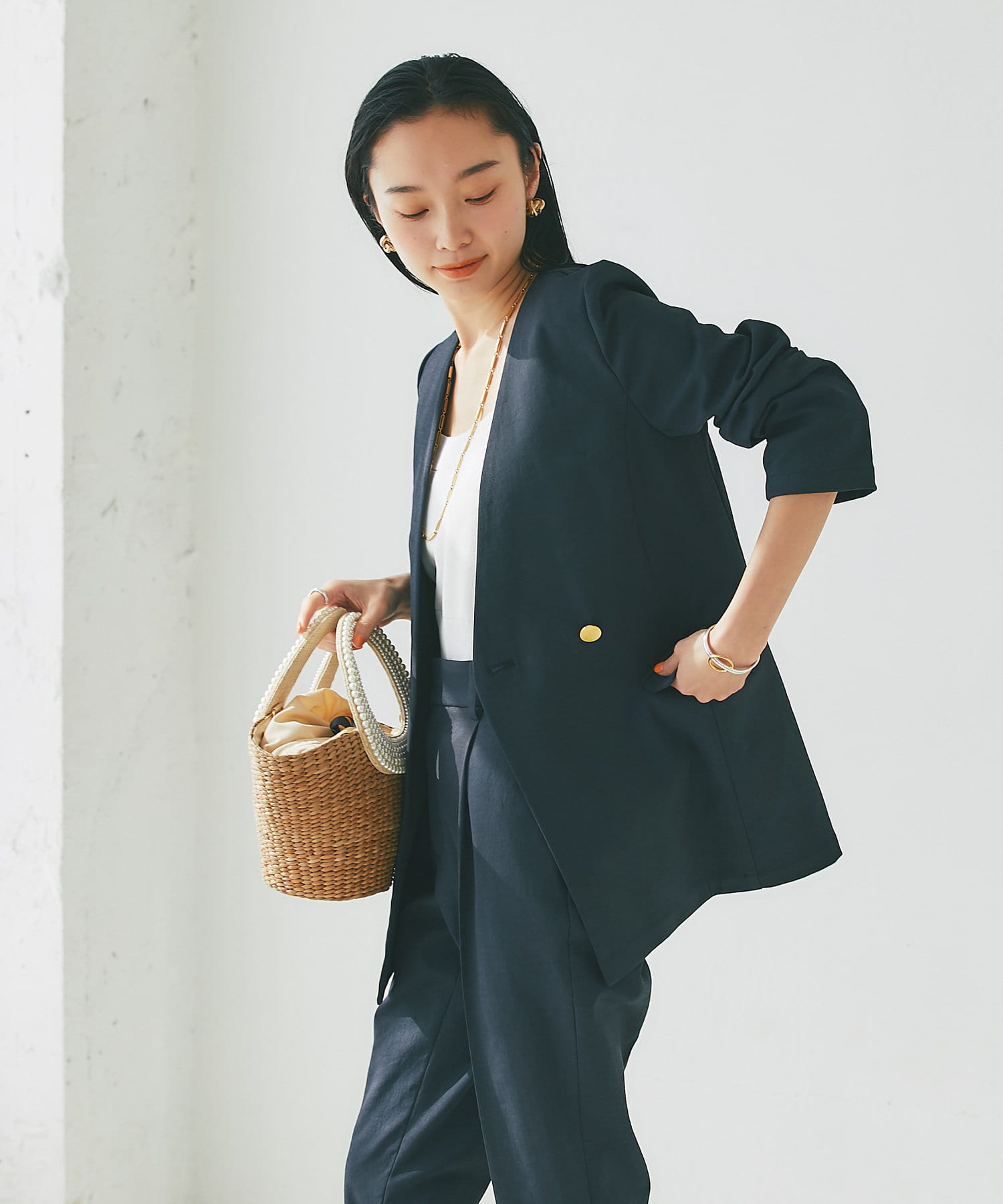 かしこまりすぎないノーカラーデザインでフェミニンな印象のダブルジャケット。