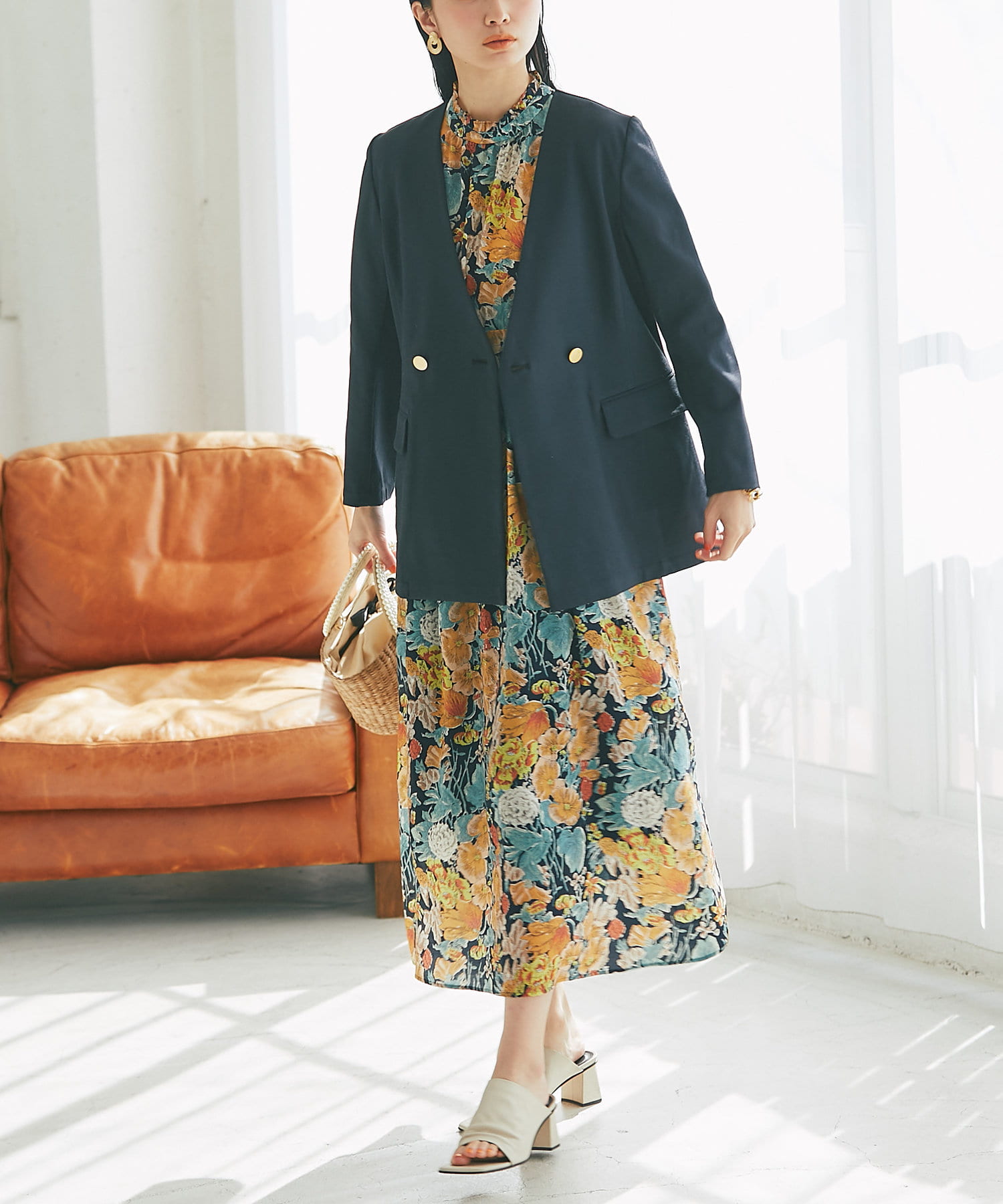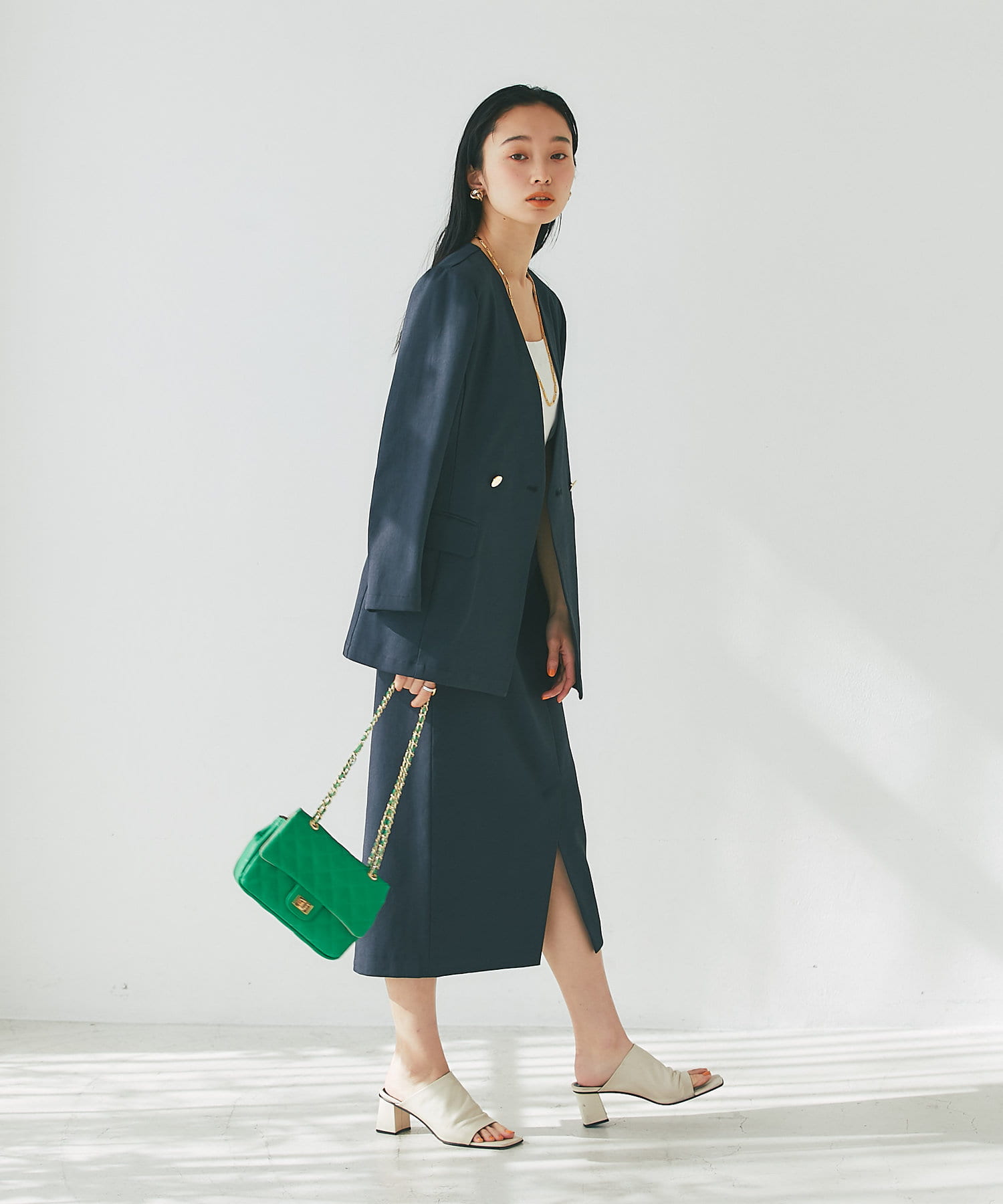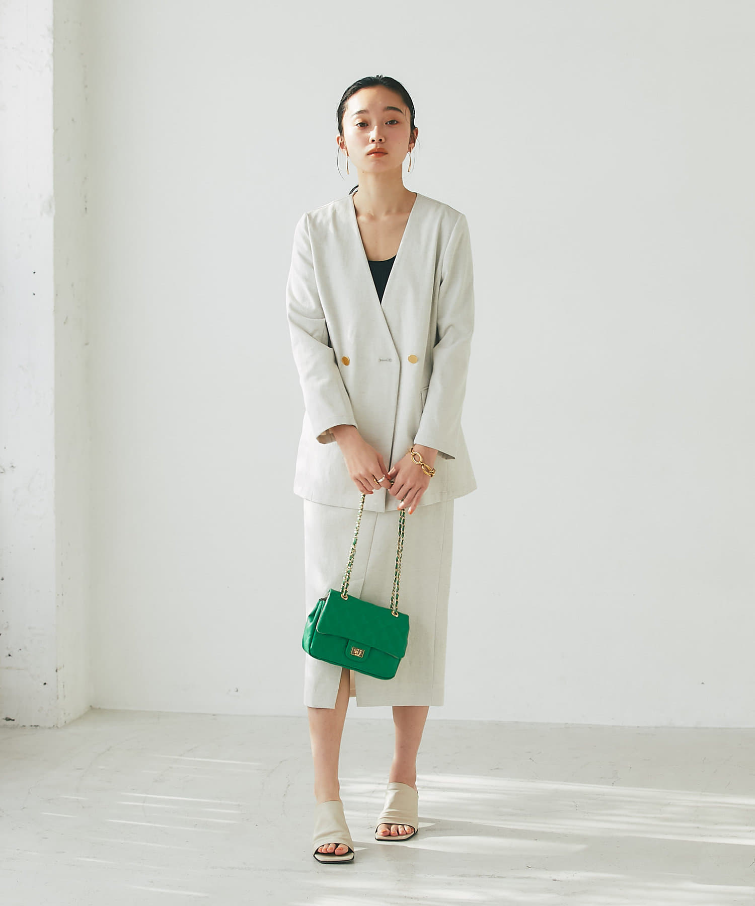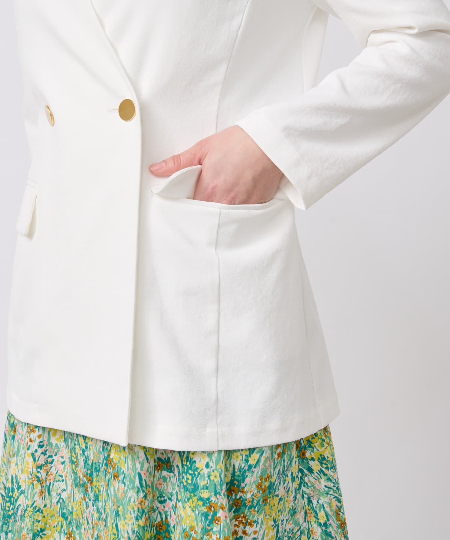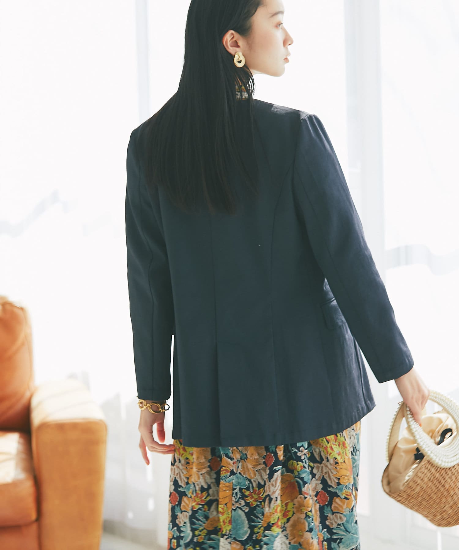 かしこまりすぎないノーカラーデザインでフェミニンな印象のダブルジャケット。