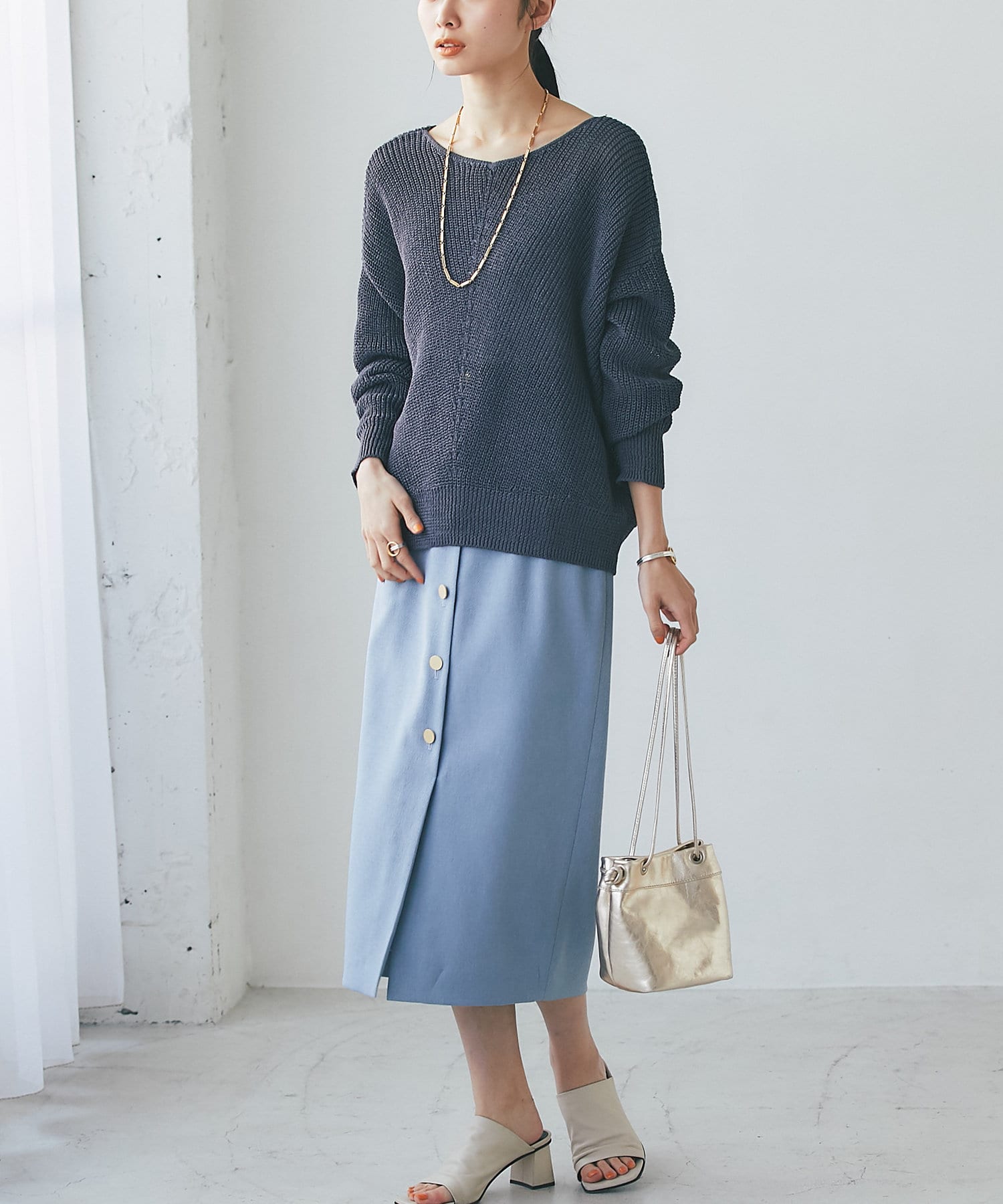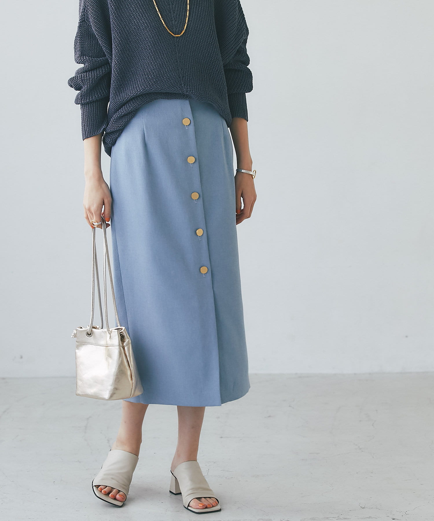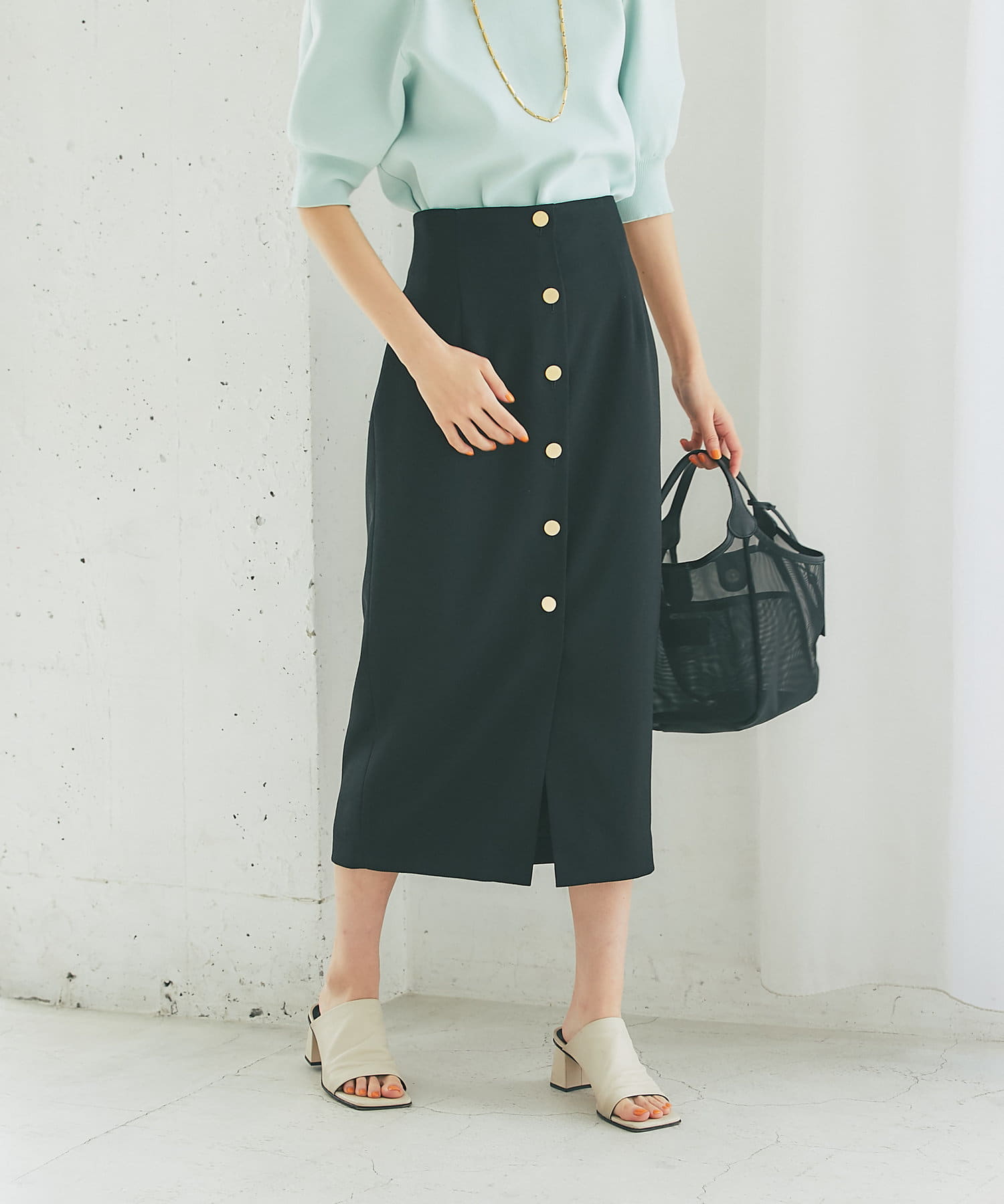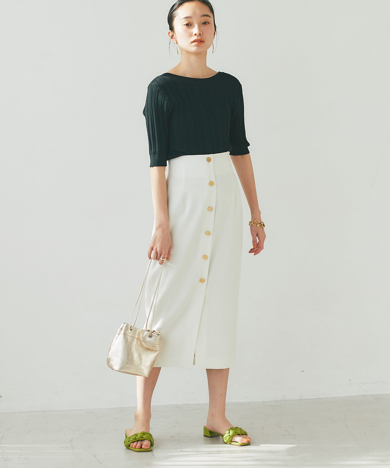#大人カジュアル #きれいめコーデ #上品カジュアル #大人女子 #大人ガーリー #上品コーデ #ナロースカート #無地 #シンプル #スリット #ロングスカート #美シルエット #フェミニン #金ボタン #ドライ