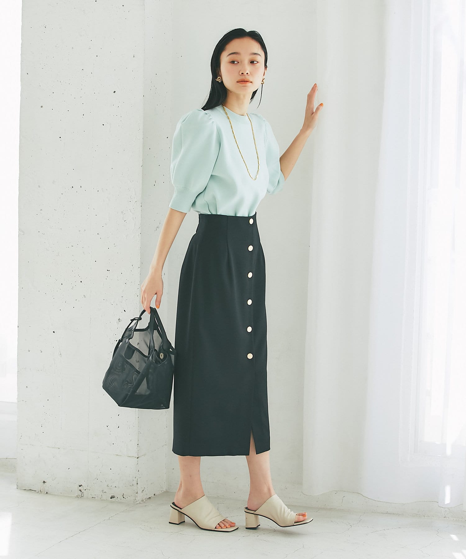 コンパクトなトップスに合わせてオフィススタイルにはもちろん、