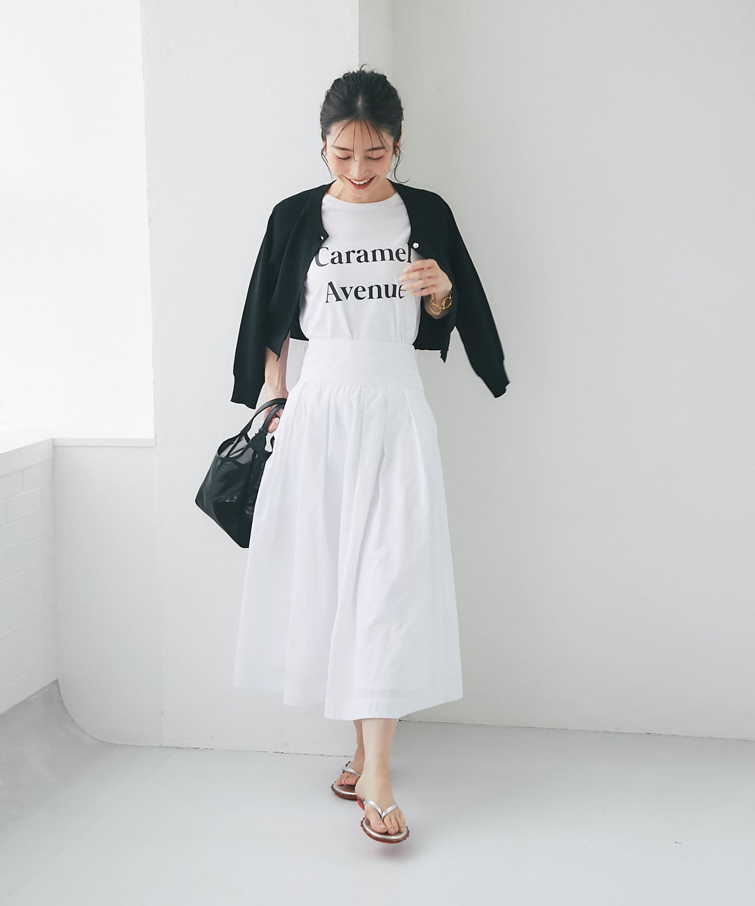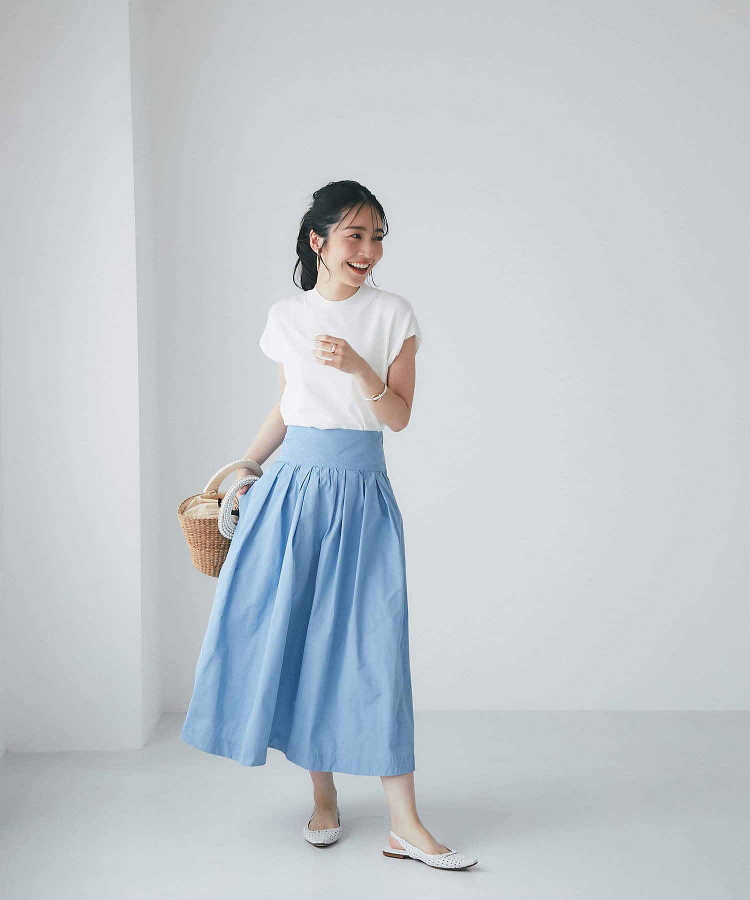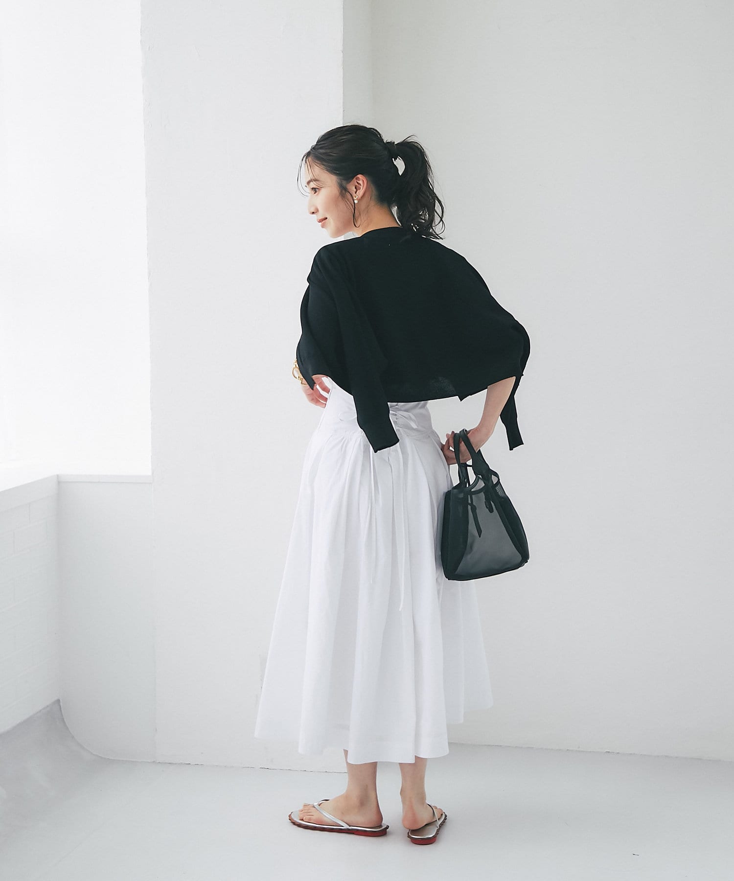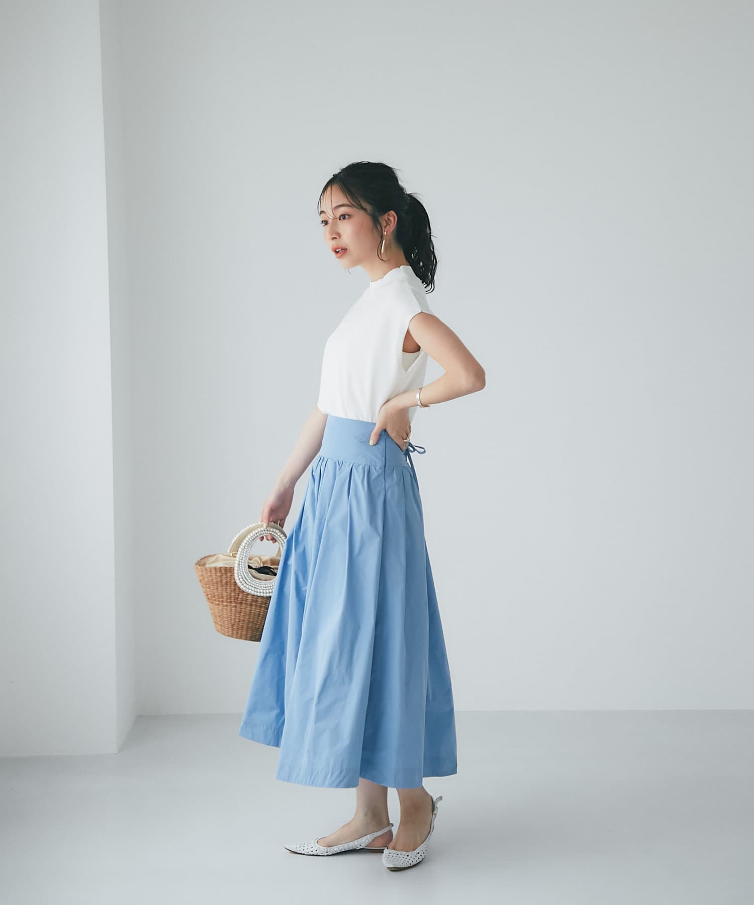 トップスをインしてウエストデザインを強調するとスタイルアップも期待できます。