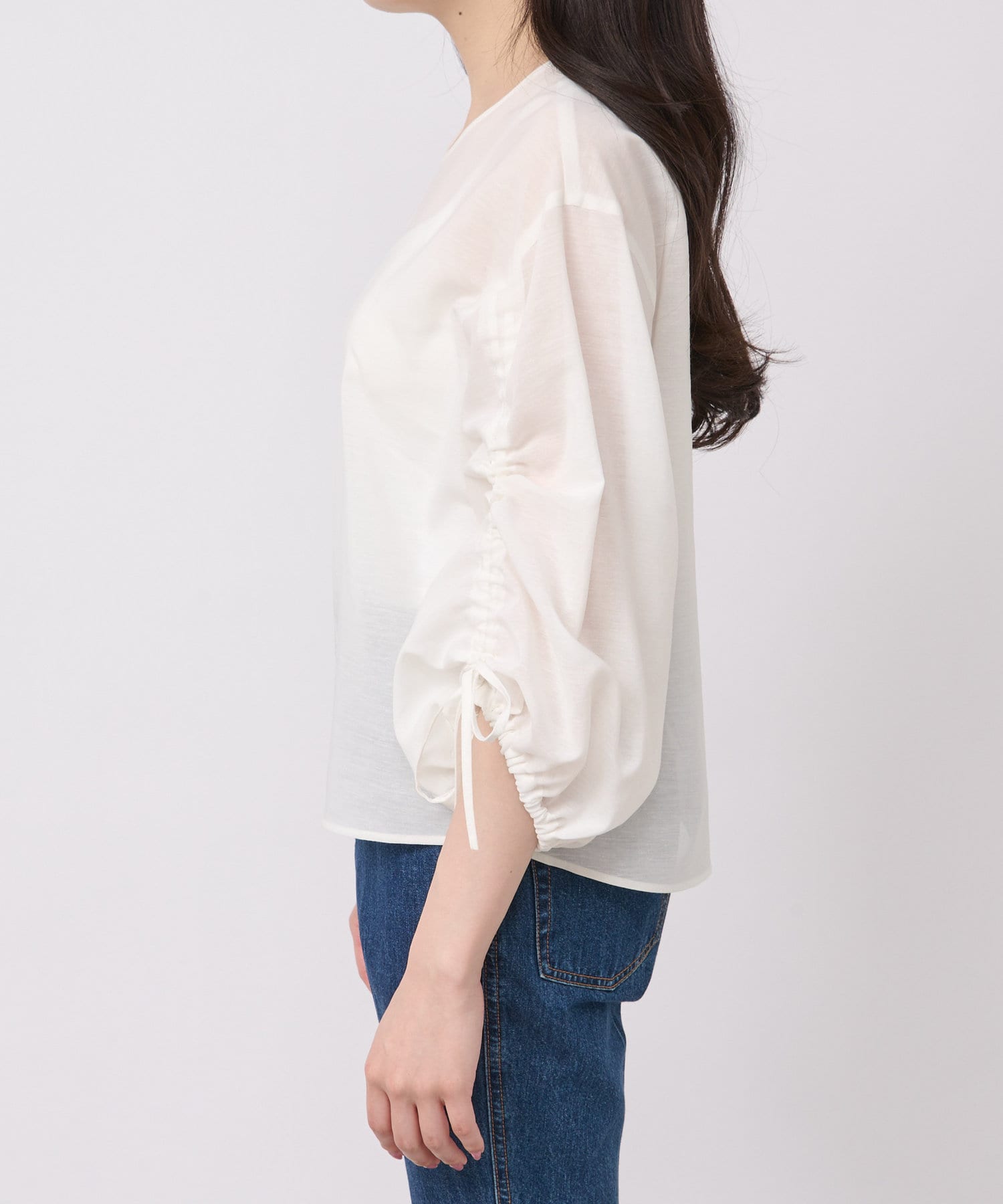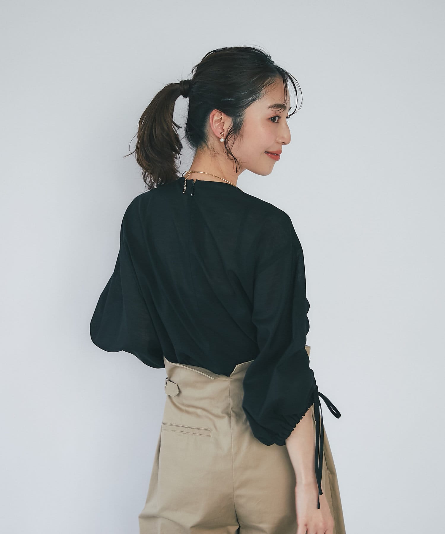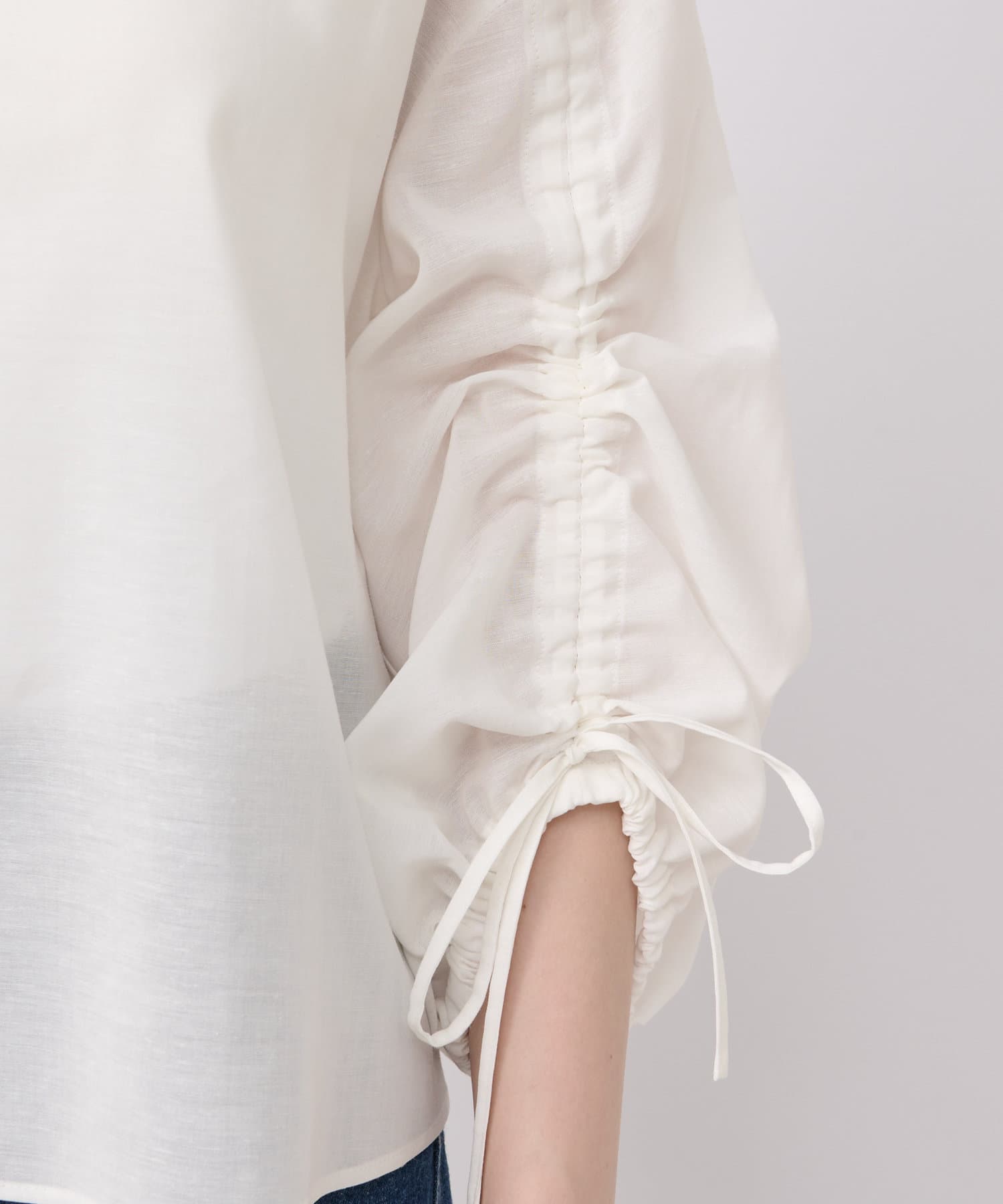 袖のドロストでギャザーのボリュームと丈を調節できます。