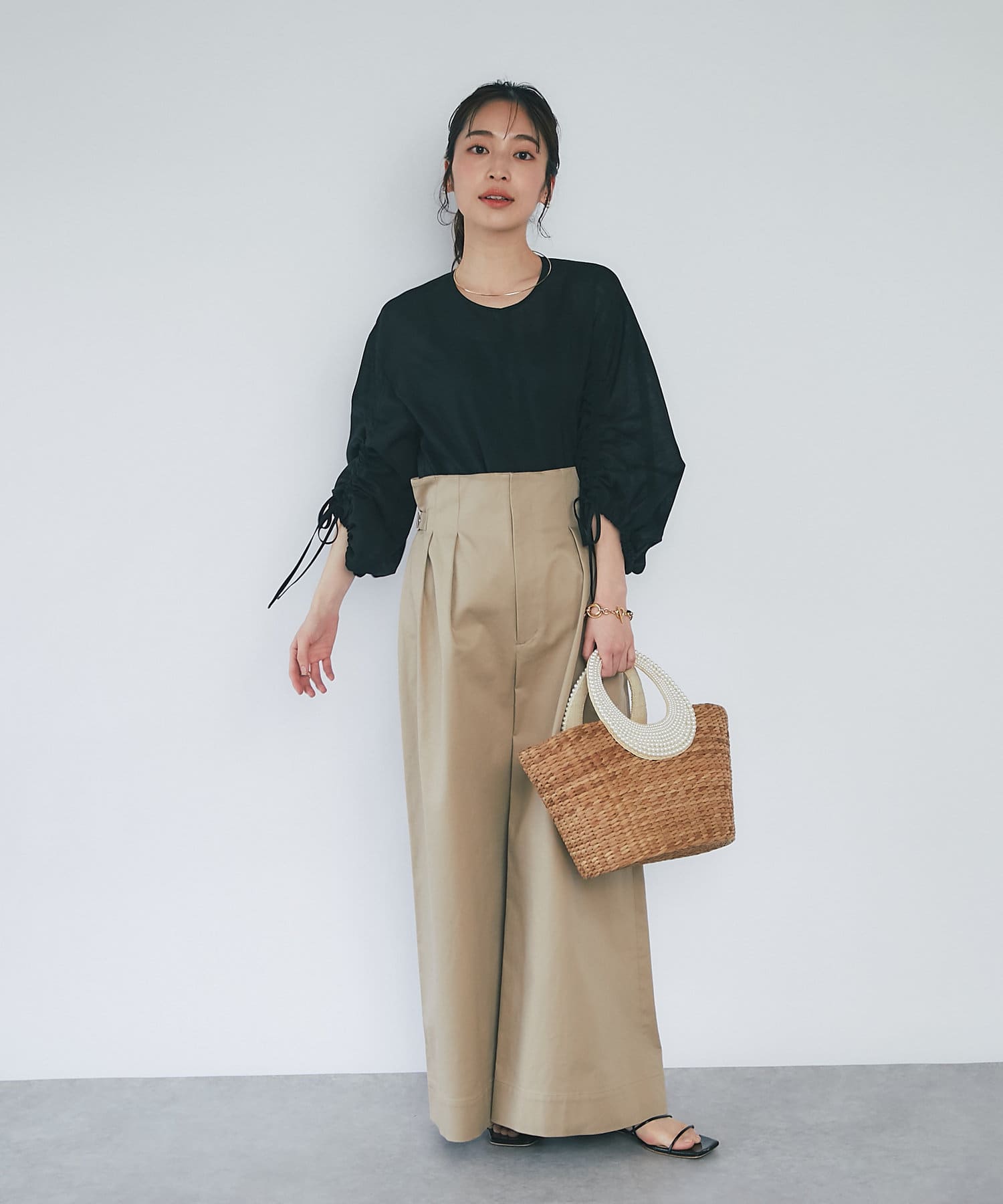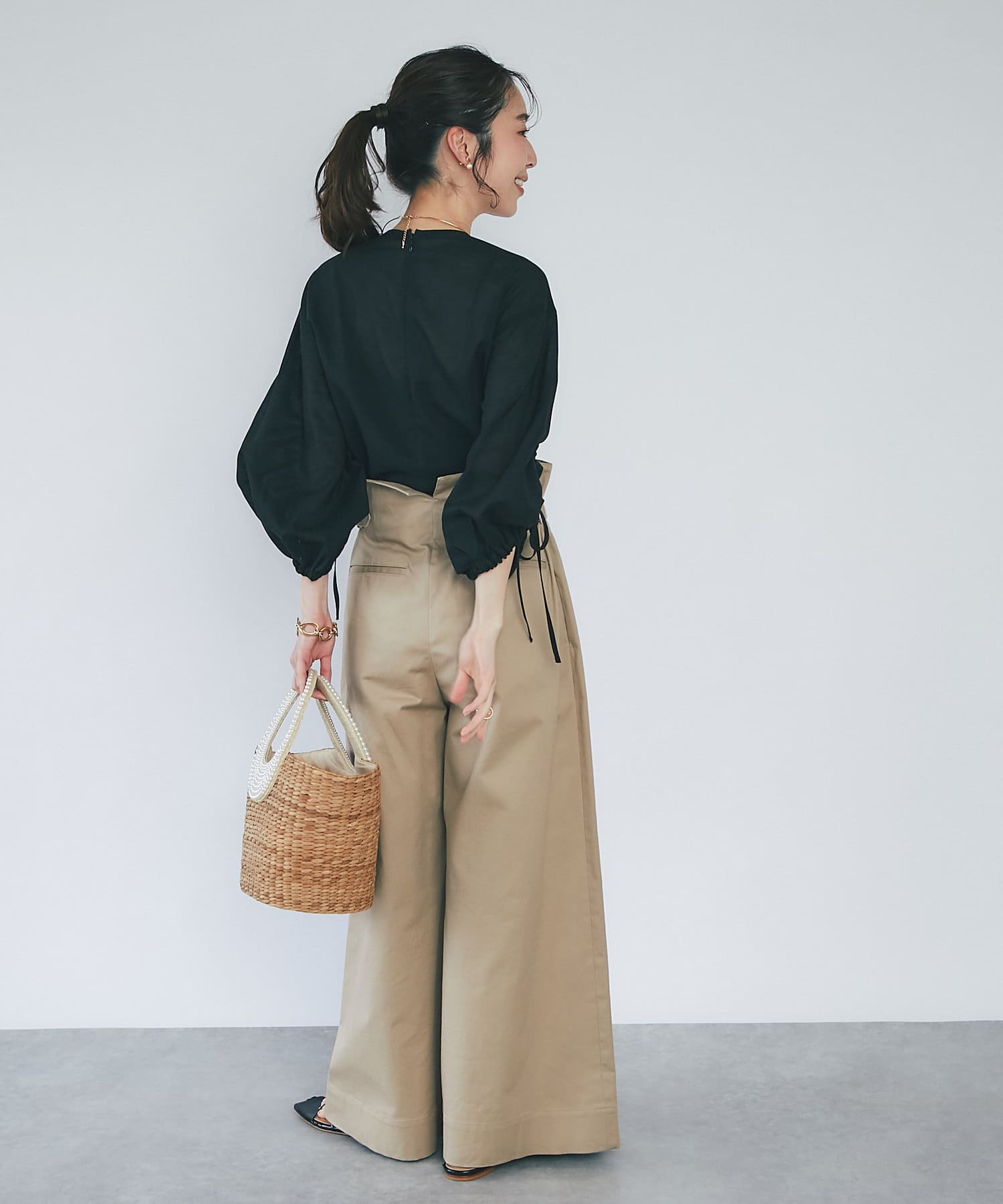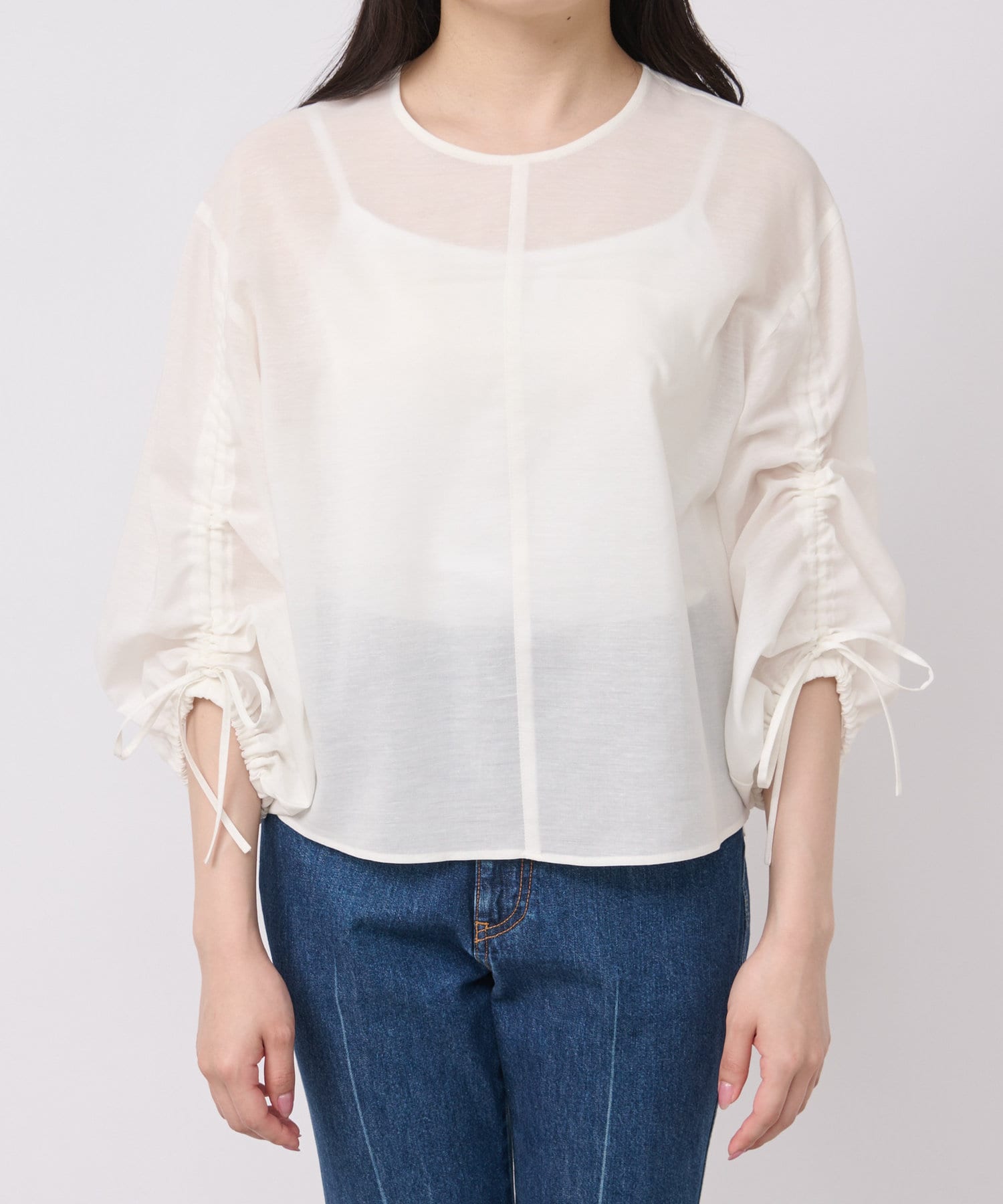 袖のドロストでギャザーのボリュームと丈を調節できます。