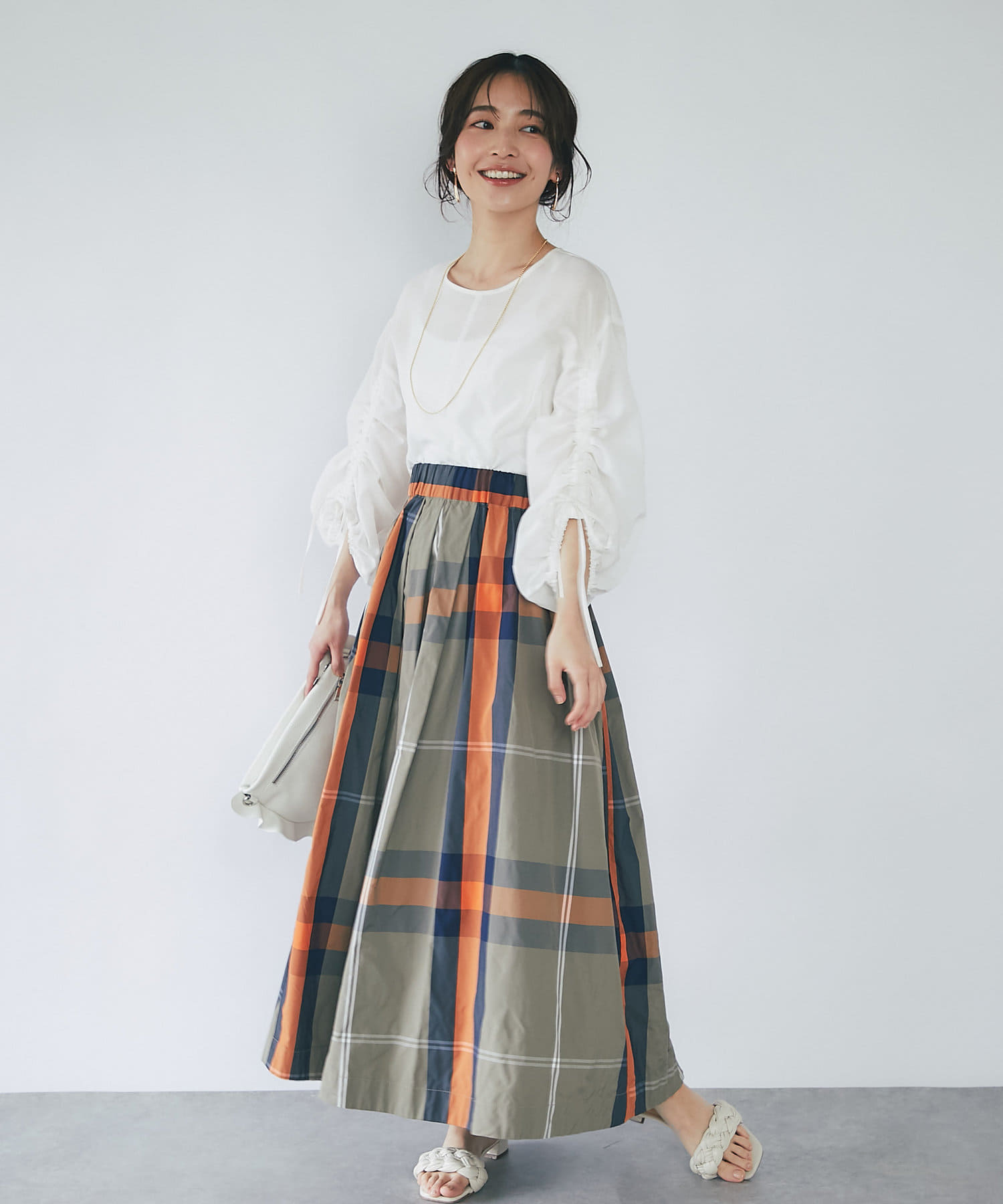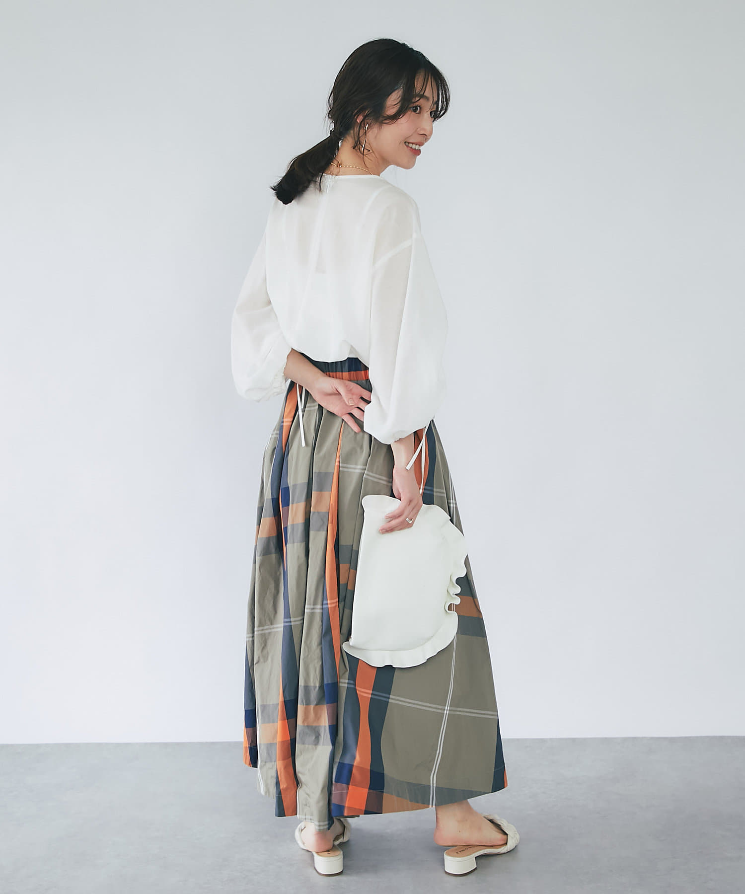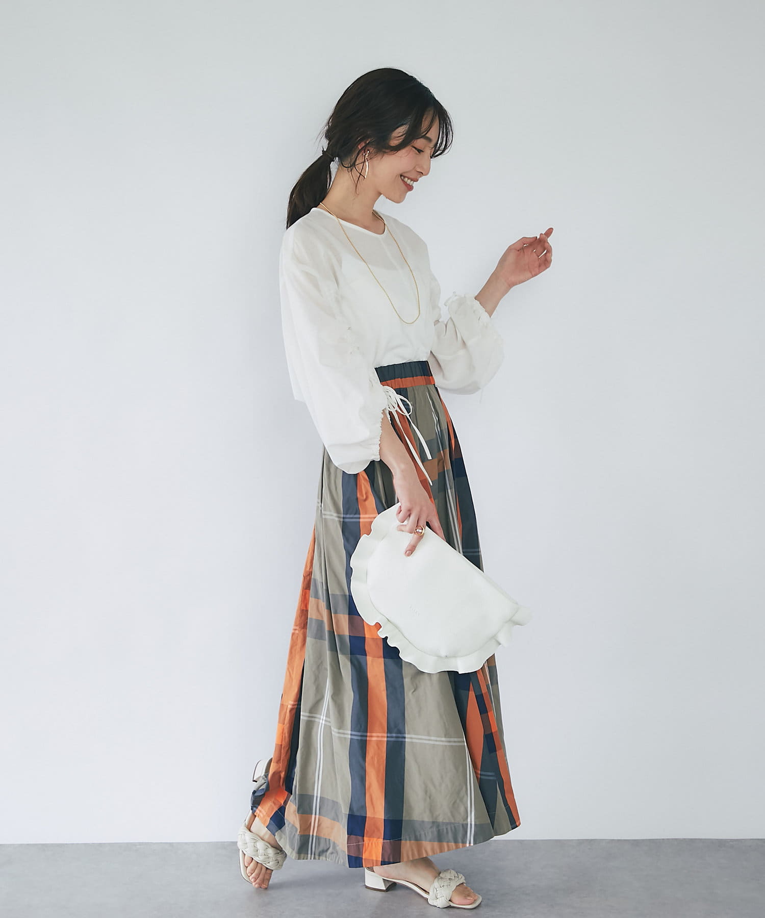 スカートに合わせたフェミニンスタイルはもちろん、