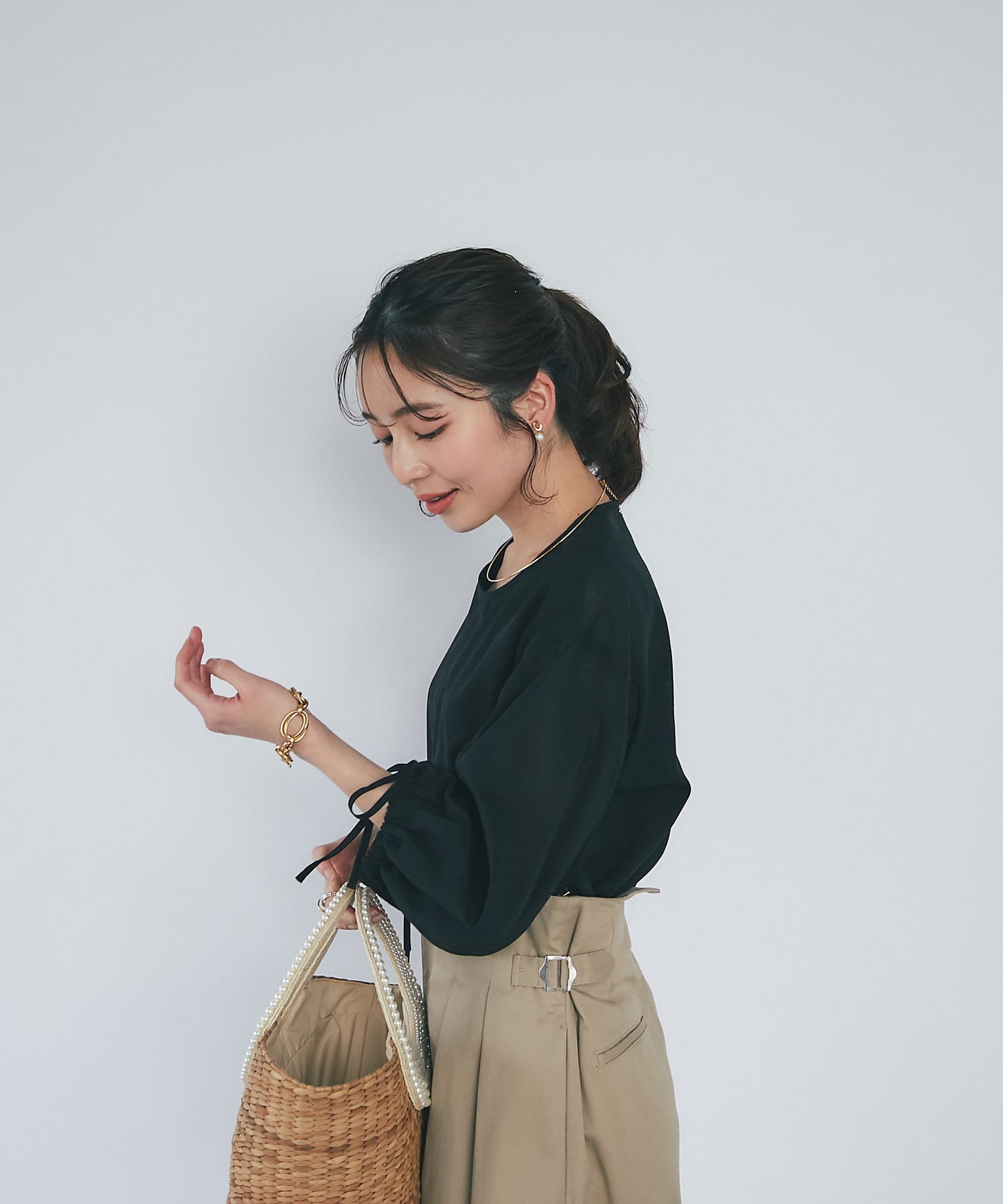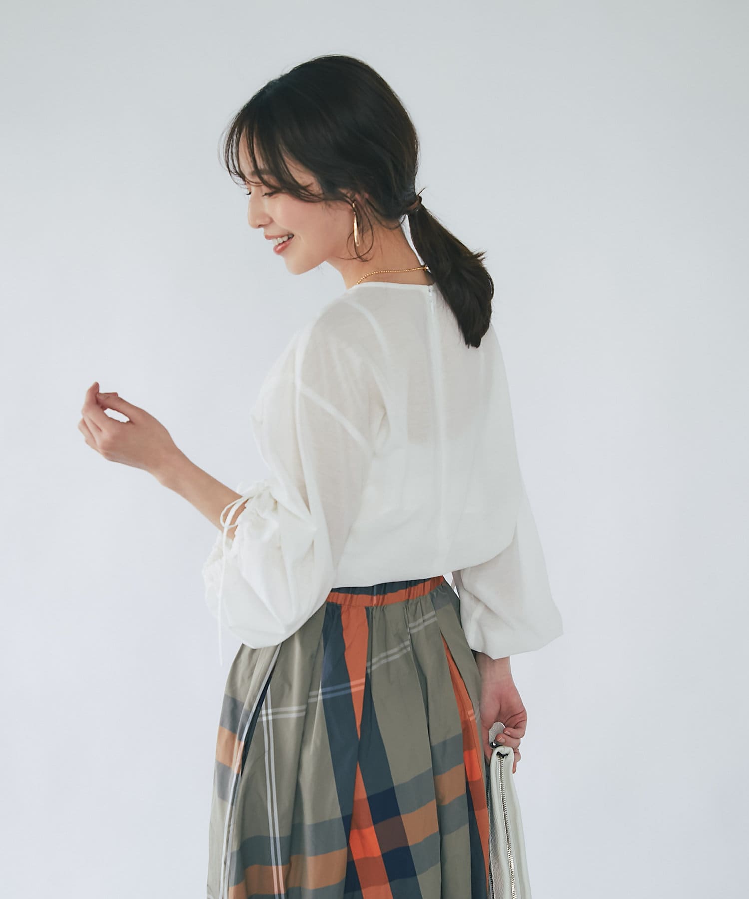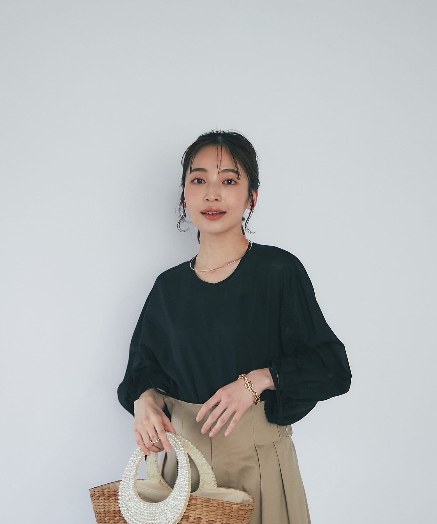 スカートに合わせたフェミニンスタイルはもちろん、