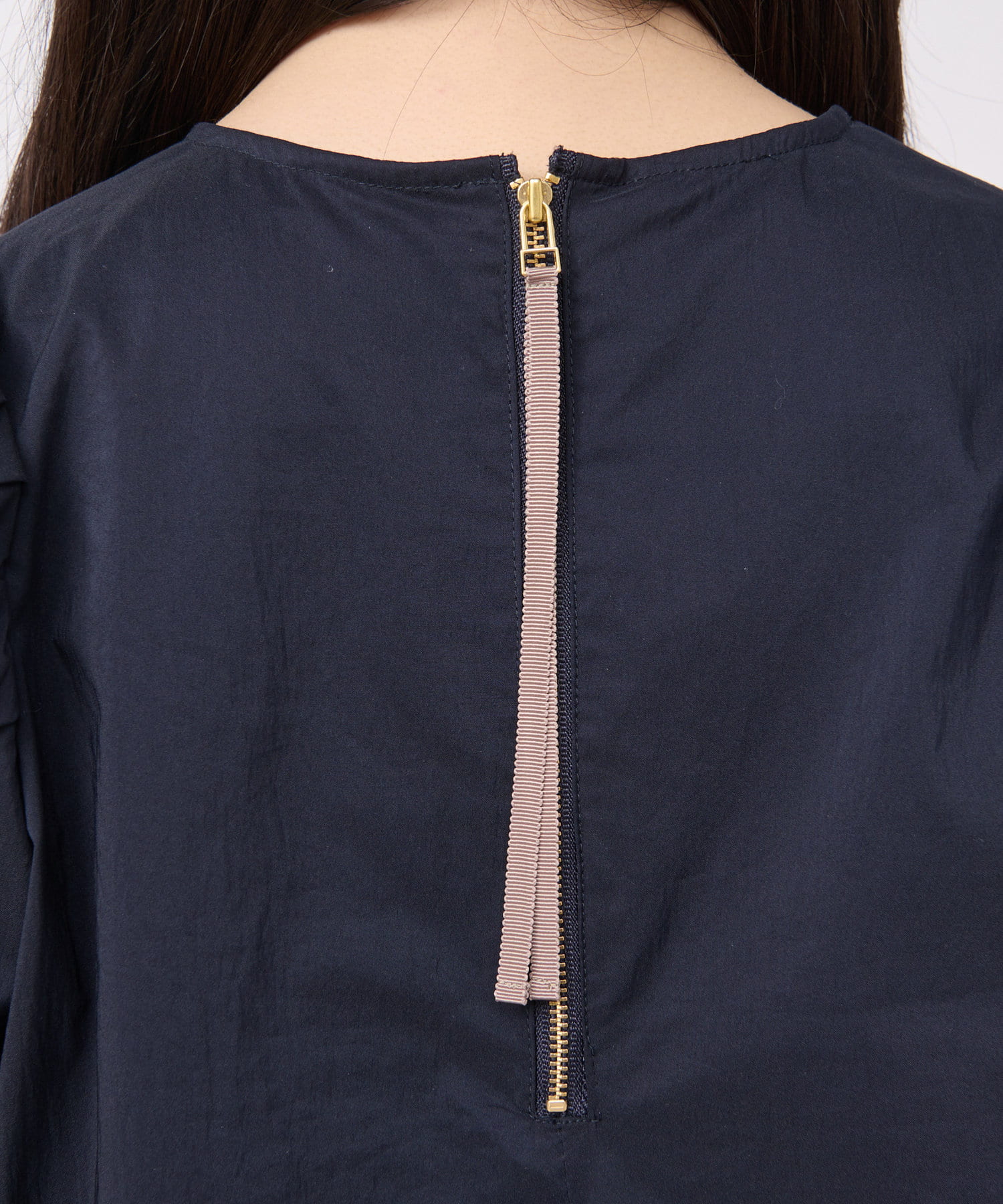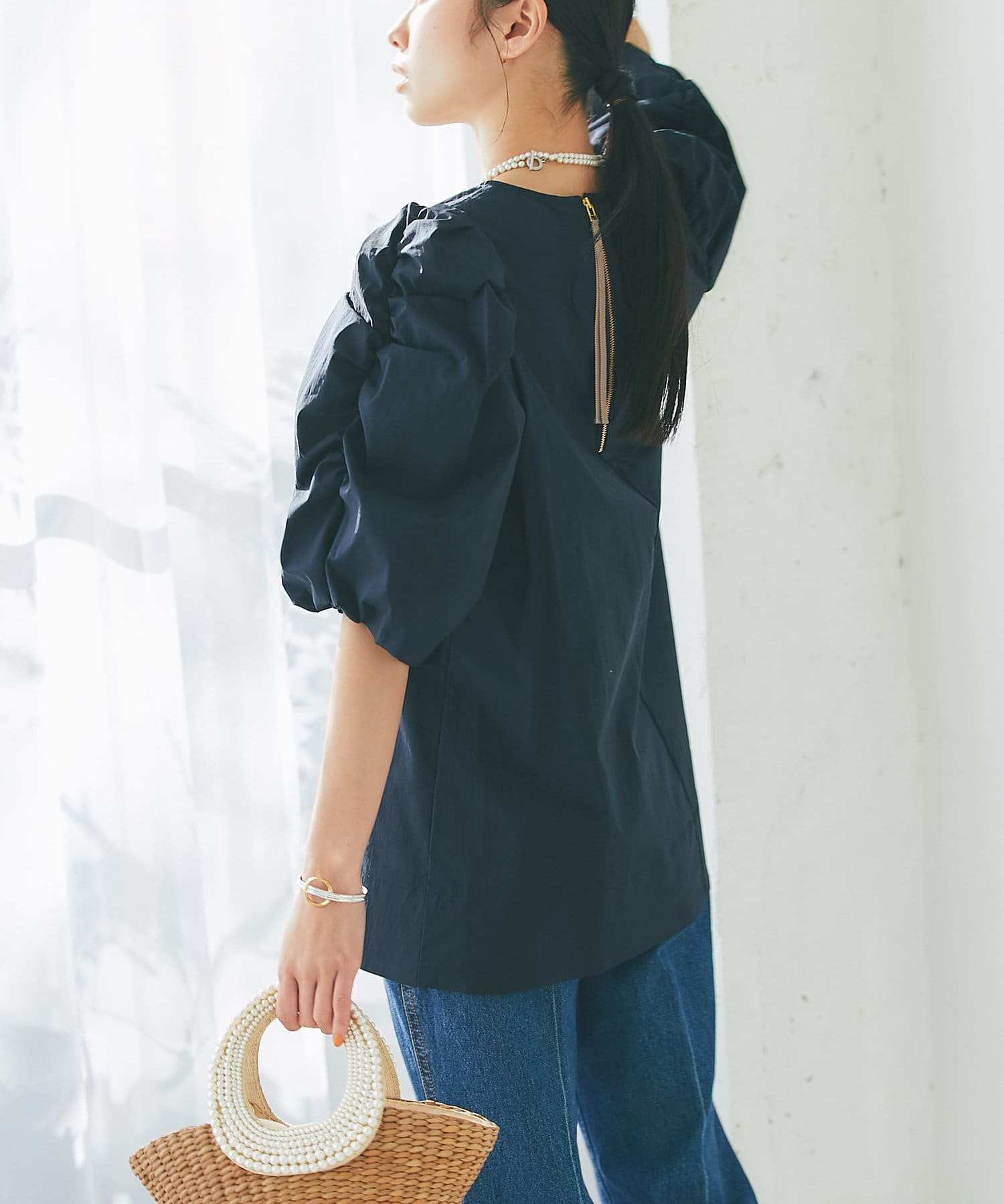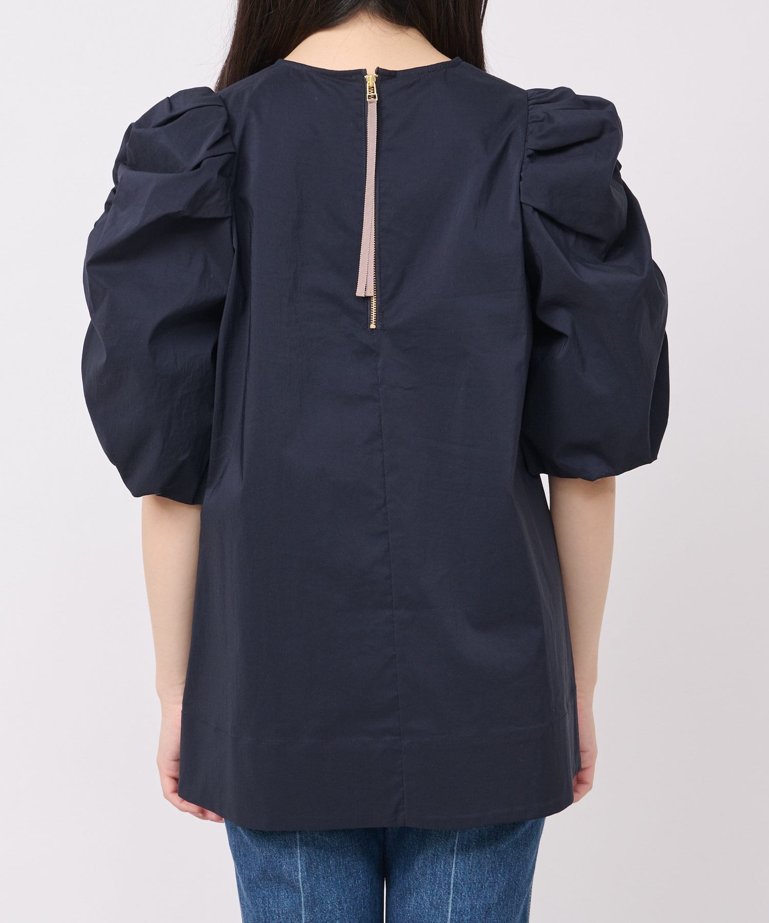 袖山にギャザーを寄せたふんわりとしたフォルムが美しく、バックはファスナー仕様とグログランテープでオシャレ。