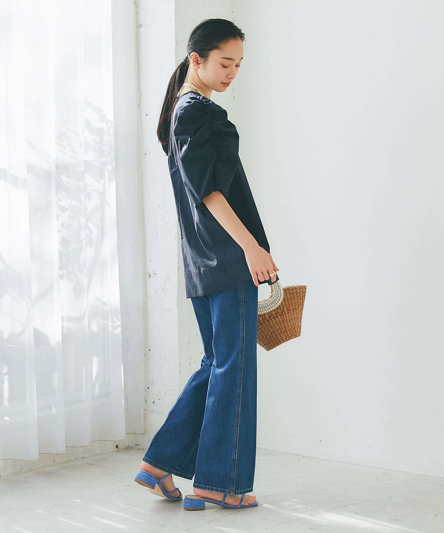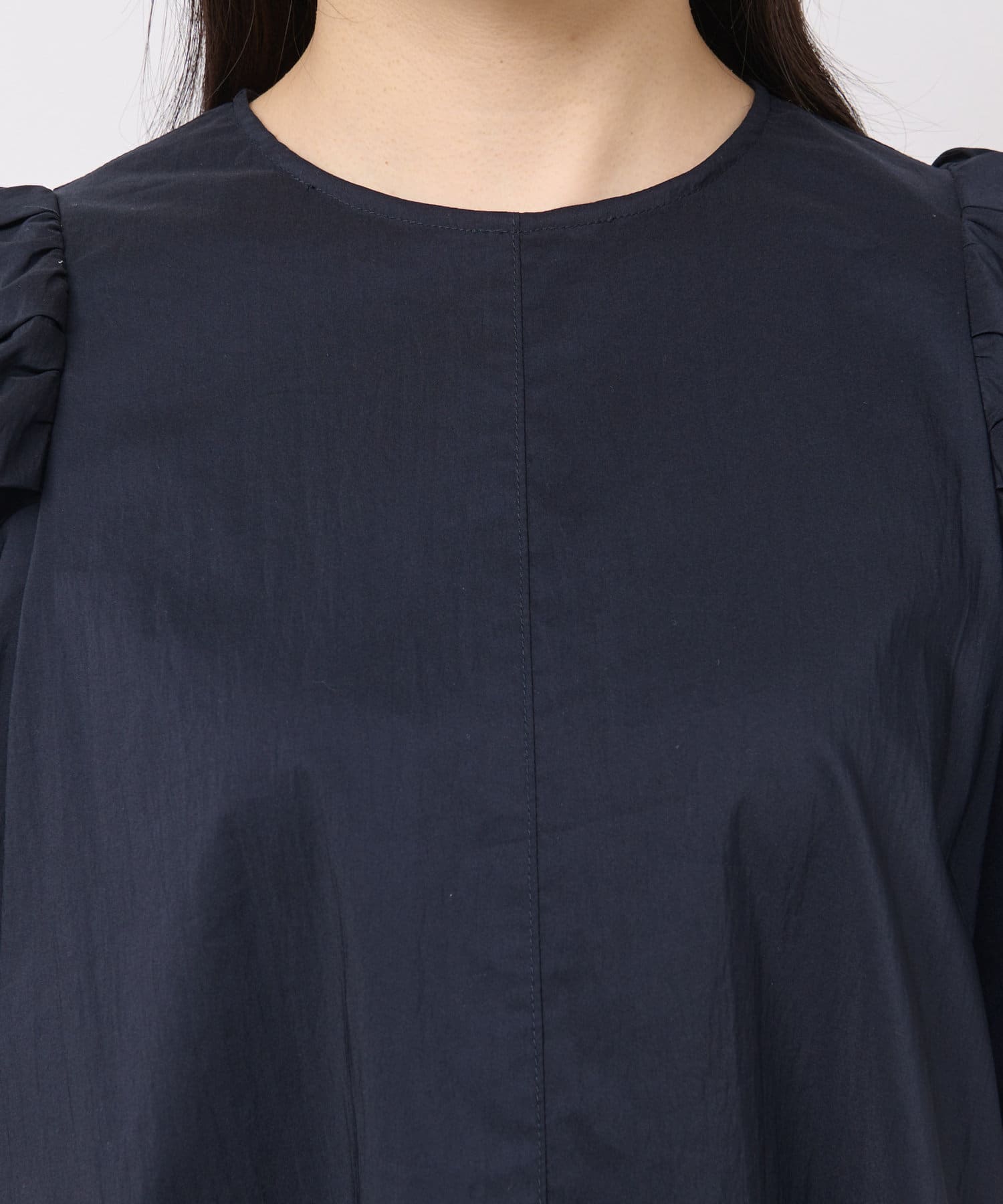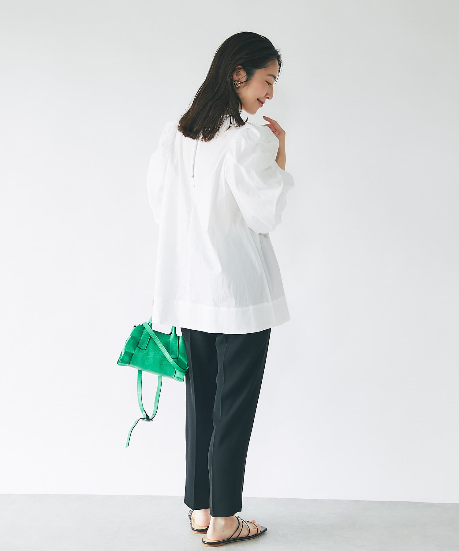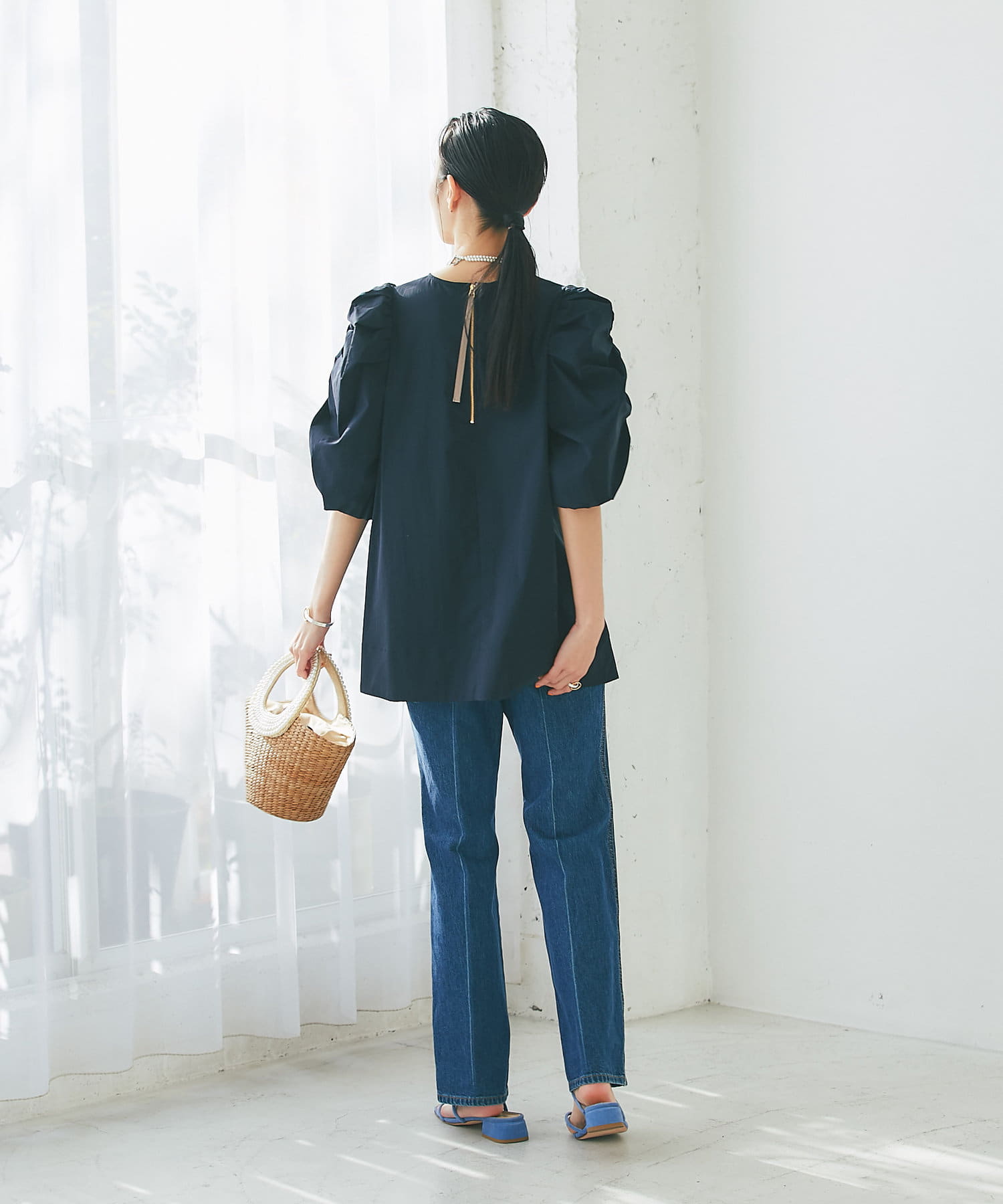 袖山にギャザーを寄せたふんわりとしたフォルムが美しく、バックはファスナー仕様とグログランテープでオシャレ。